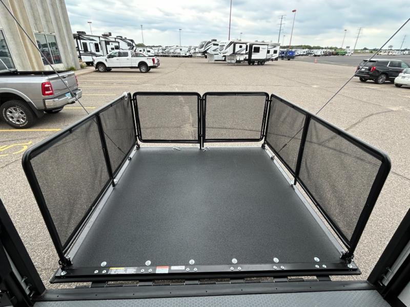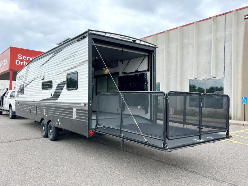 Load up your favorite off-road riding toys and head to your favorite trails, dunes, or competition rally with family and friends. This unit sleeps six with the RV queen bed in front and the dual roll over sofas and bonus bunk in back. The 13' garage with 5K inter-lock system tie downs will get all of your cargo safely to your destination. Once in camp, the rear ramp door will help you easily unload and then set up the sofas with table in between. A full kitchen allows you to refuel your bodies easily by providing a three burner range and 17" black oven, a 10.7 cu. ft. 12V refrigerator for your perishables, and a residential microwave oven to heat up leftovers. The full bath will allow everyone to easily clean up after a full day of fun, and you will enjoy the private front bedroom with an RV queen bed and a full closet for all of your things. On the outside, an 18' power awning provides added living space, or you might like to add the optional patio package for a raised extension of your unit giving you an outdoor space to enjoy.