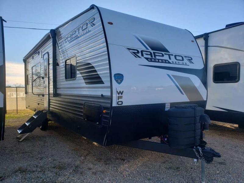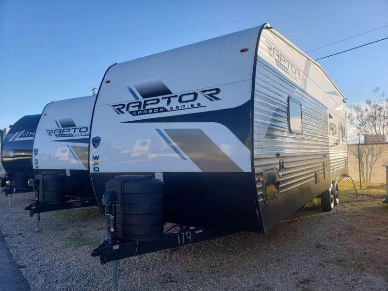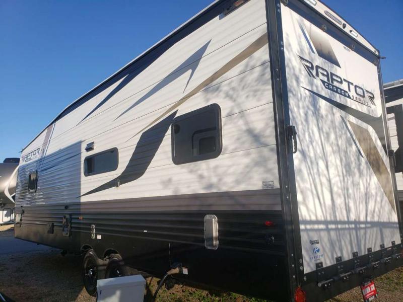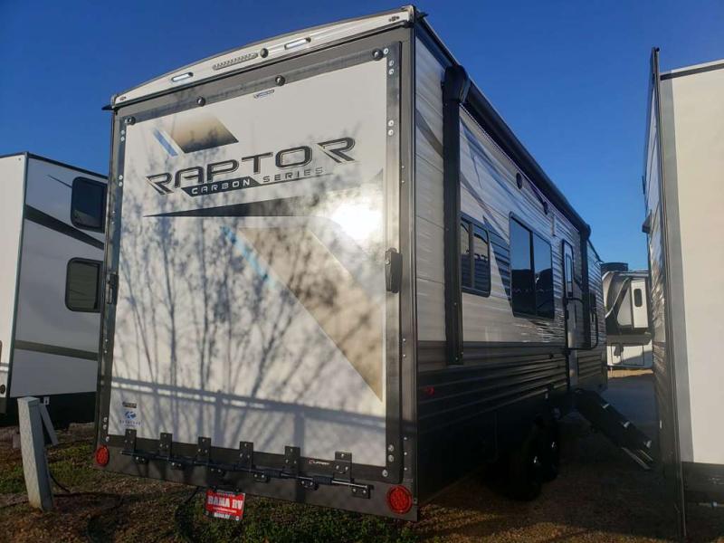 Each Raptor Carbon Series toy hauler travel trailer is built with a 10" I-beam frame, laminated sidewalls with double-welded aluminum construction, plus Dexter E-Z lube 6,000 lb. axles with self-adjusting brakes, electric stabilizer jacks for easy setup, and MORyde step above steps for stability on any type of ground you camp on. On the interior, designer style vinyl flooring throughout, pull-down window shades for privacy at night, and LED lighting throughout. You will appreciate the Girard tankless on-demand water heater for showering both inside and out, and you can also customize your trailer by adding a few options if you wish. The optional patio package will provide you with a raised outdoor living area to enjoy, and the optional SolarFlex protect 220 allows you the ability to decide how you want to camp. Choose your favorite model today!