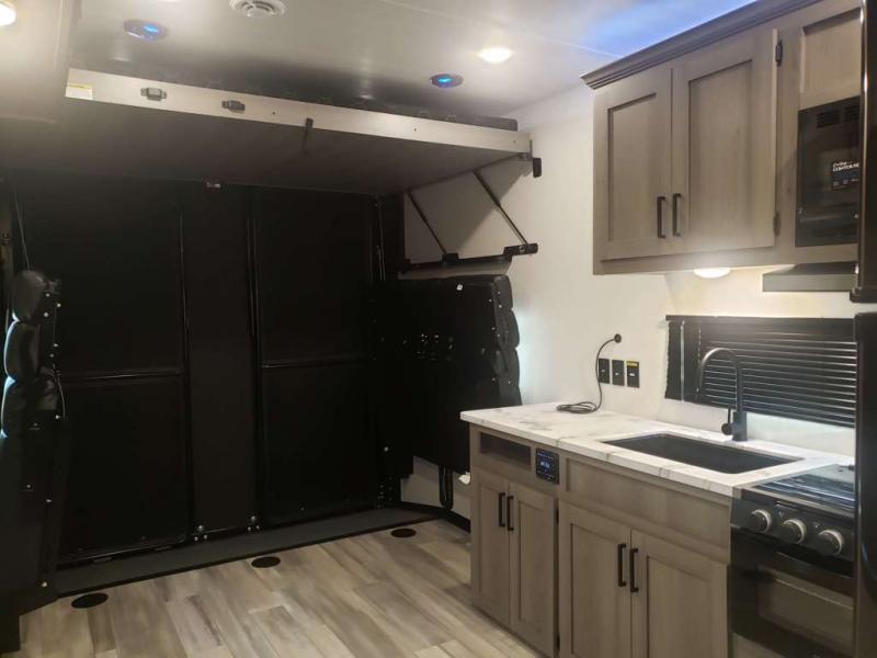 Load up your favorite off-road riding toys and head to your favorite trails, dunes, or competition rally with family and friends. This unit sleeps six with the RV queen bed in front and the dual roll over sofas and bonus bunk in back. The 13' garage with 5K inter-lock system tie downs will get all of your cargo safely to your destination. Once in camp, the rear ramp door will help you easily unload and then set up the sofas with table in between. A full kitchen allows you to refuel your bodies easily by providing a three burner range and 17" black oven, a 10.7 cu. ft. 12V refrigerator for your perishables, and a residential microwave oven to heat up leftovers. The full bath will allow everyone to easily clean up after a full day of fun, and you will enjoy the private front bedroom with an RV queen bed and a full closet for all of your things. On the outside, an 18' power awning provides added living space, or you might like to add the optional patio package for a raised extension of your unit giving you an outdoor space to enjoy.