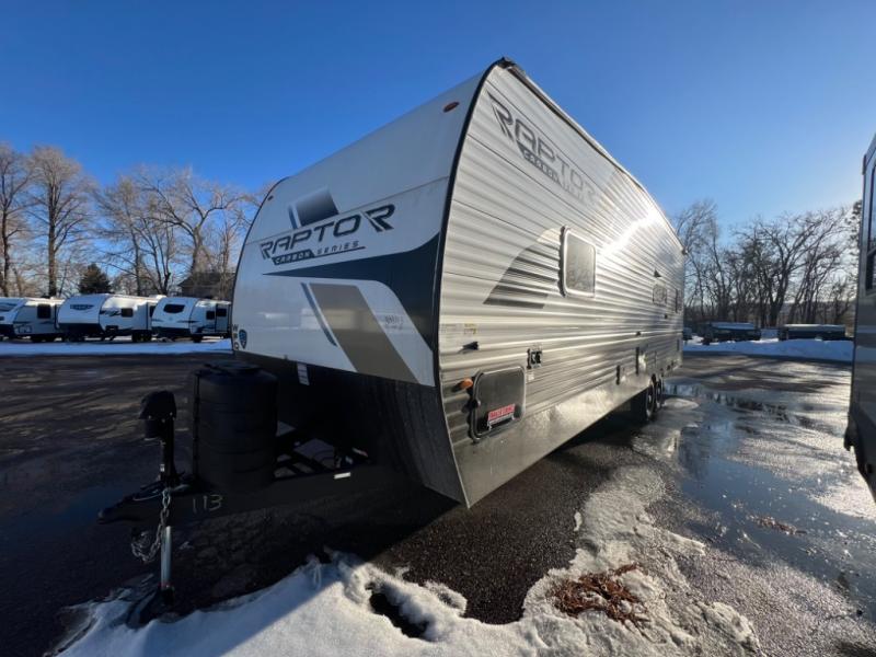 Each Raptor Carbon Series toy hauler travel trailer is built with a 10" I-beam frame, laminated sidewalls with double-welded aluminum construction, plus Dexter E-Z lube 6,000 lb. axles with self-adjusting brakes, electric stabilizer jacks for easy setup, and MORyde step above steps for stability on any type of ground you camp on. On the interior, designer style vinyl flooring throughout, pull-down window shades for privacy at night, and LED lighting throughout. You will appreciate the Girard tankless on-demand water heater for showering both inside and out, and you can also customize your trailer by adding a few options if you wish. The optional patio package will provide you with a raised outdoor living area to enjoy, and the optional SolarFlex protect 220 allows you the ability to decide how you want to camp. Choose your favorite model today!