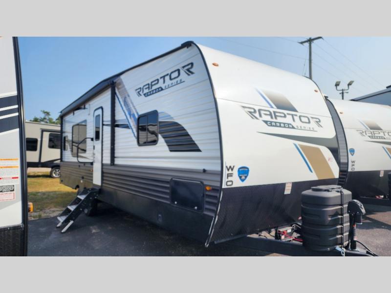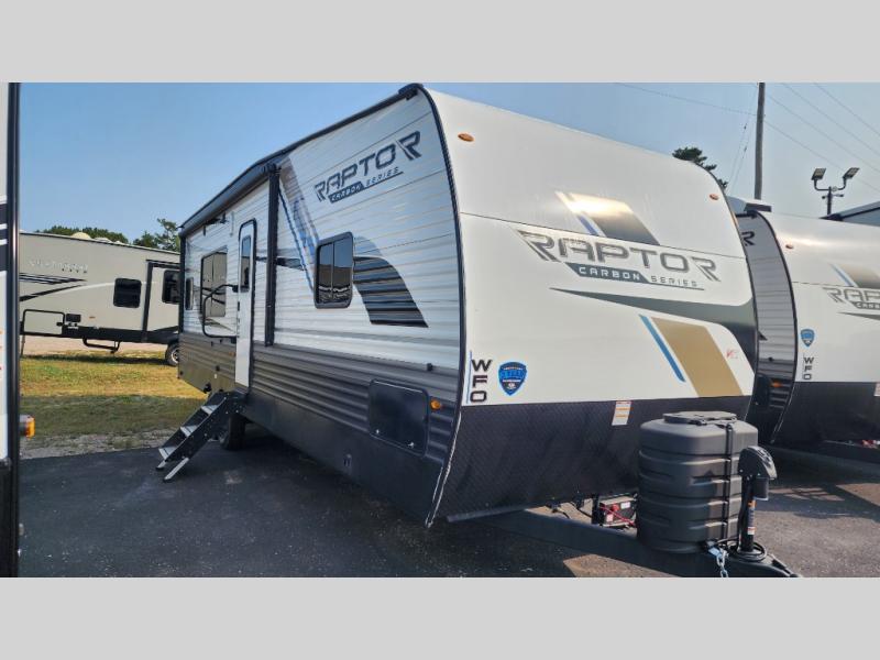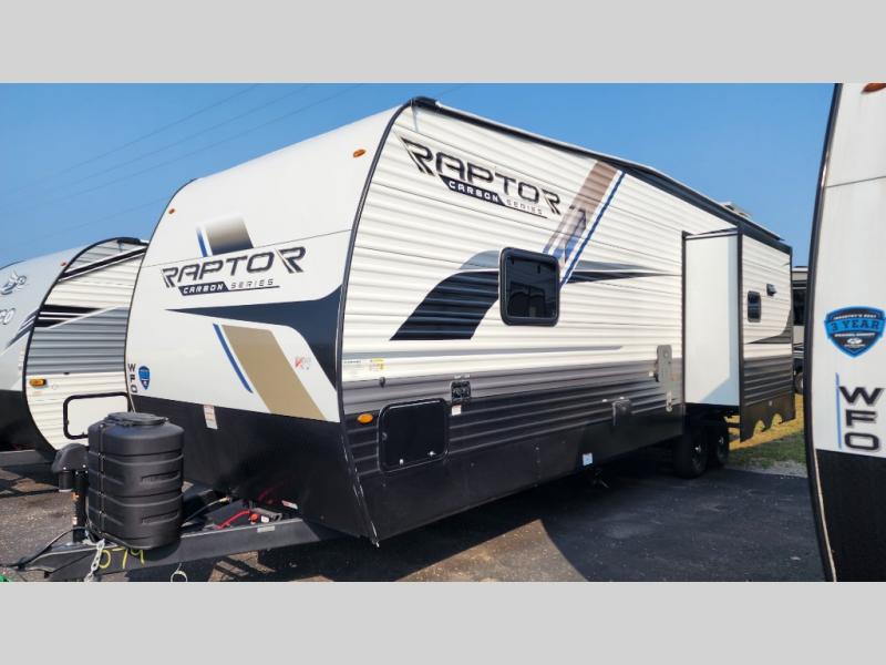 Each Raptor Carbon Series toy hauler travel trailer is built with a 10" I-beam frame, laminated sidewalls with double-welded aluminum construction, plus Dexter E-Z lube 6,000 lb. axles with self-adjusting brakes, electric stabilizer jacks for easy setup, and MORyde step above steps for stability on any type of ground you camp on. On the interior, designer style vinyl flooring throughout, pull-down window shades for privacy at night, and LED lighting throughout. You will appreciate the Girard tankless on-demand water heater for showering both inside and out, and you can also customize your trailer by adding a few options if you wish. The optional patio package will provide you with a raised outdoor living area to enjoy, and the optional SolarFlex protect 220 allows you the ability to decide how you want to camp. Choose your favorite model today!