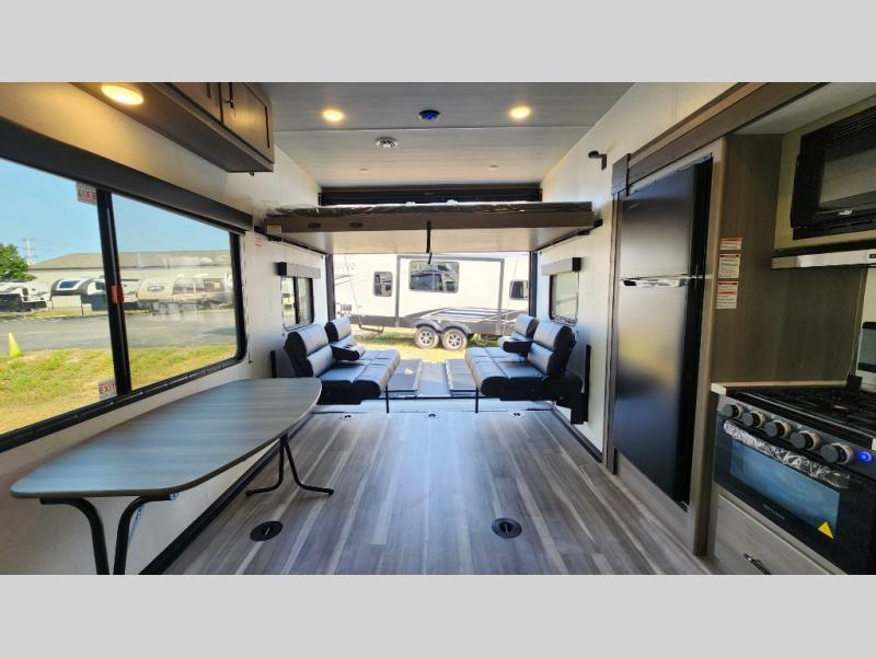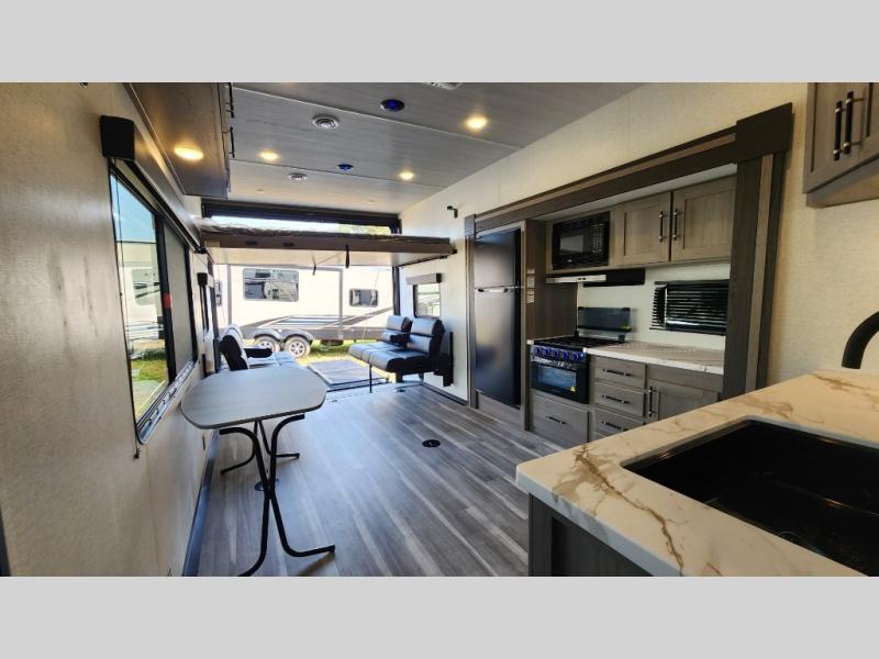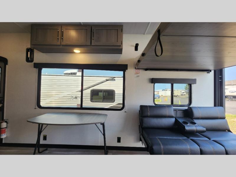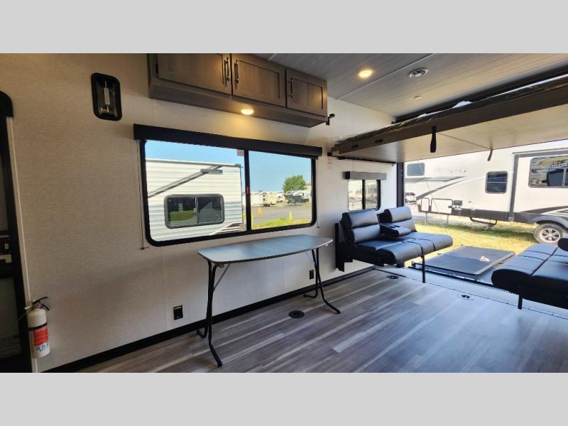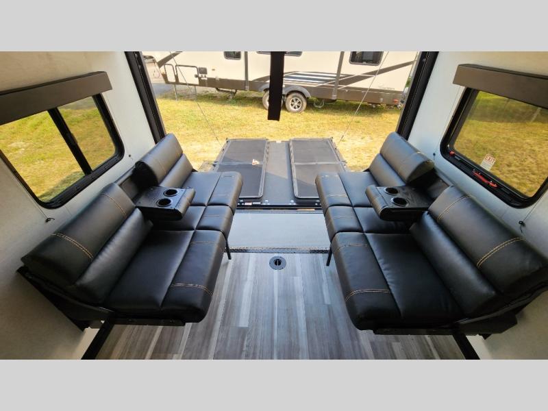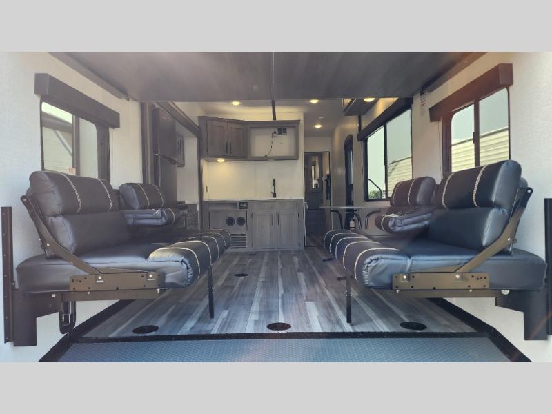 Enjoy a weekend of fun with family and friends with this wide open concept toy hauler featuring 15' of garage space for your toys! This unit sleeps six with the RV queen bed in front and the dual roll over sofas and bonus bunk in back. The 15' garage with 5K inter-lock system tie downs will get all of your cargo safely to your destination. Once in camp, the rear ramp door will help you easily unload and then set up the sofas with table in between. The kitchen slide featuring a hutch allows you to refuel your bodies easily by providing a three burner range and 17" black oven, a 10.7 cu. ft. 12V refrigerator for your perishables, and a residential microwave oven to warm up leftovers. The full bath will allow everyone to easily clean up after a full day of fun, and you will enjoy the private front bedroom with an RV queen bed and a full closet for all of your things. On the outside, an 18' power awning provides added living space, or you might like to add the optional patio packaged for a raised extension of your unit giving you an outdoor space to hang out and enjoy some fresh air between rides.