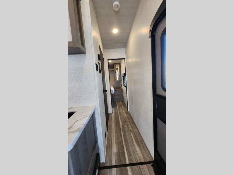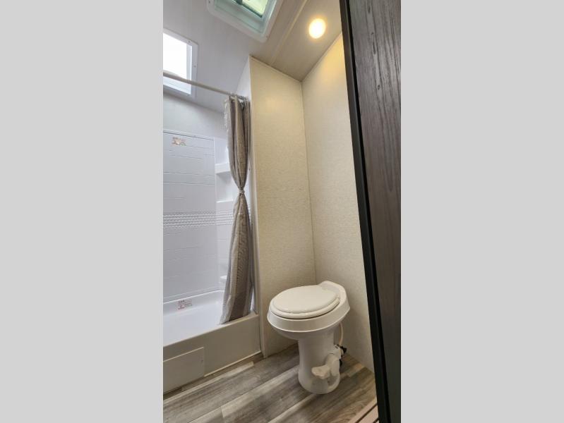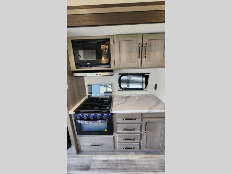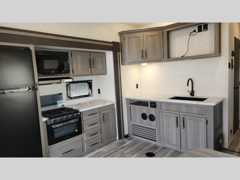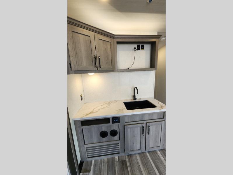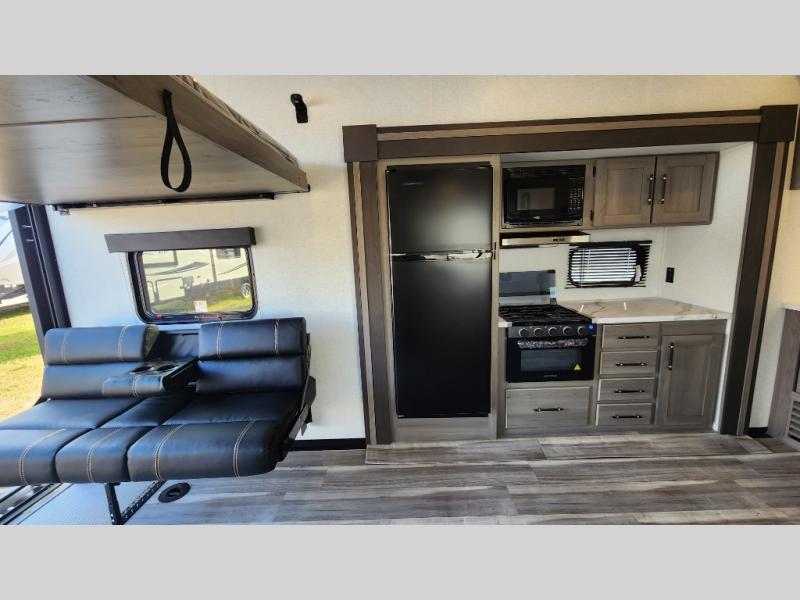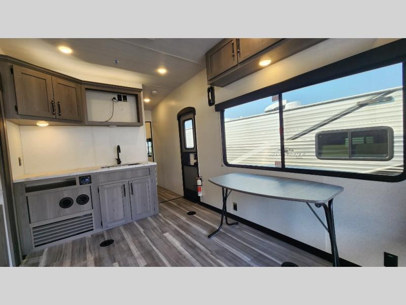Enjoy a weekend of fun with family and friends with this wide open concept toy hauler featuring 15' of garage space for your toys! This unit sleeps six with the RV queen bed in front and the dual roll over sofas and bonus bunk in back. The 15' garage with 5K inter-lock system tie downs will get all of your cargo safely to your destination. Once in camp, the rear ramp door will help you easily unload and then set up the sofas with table in between. The kitchen slide featuring a hutch allows you to refuel your bodies easily by providing a three burner range and 17" black oven, a 10.7 cu. ft. 12V refrigerator for your perishables, and a residential microwave oven to warm up leftovers. The full bath will allow everyone to easily clean up after a full day of fun, and you will enjoy the private front bedroom with an RV queen bed and a full closet for all of your things. On the outside, an 18' power awning provides added living space, or you might like to add the optional patio packaged for a raised extension of your unit giving you an outdoor space to hang out and enjoy some fresh air between rides.