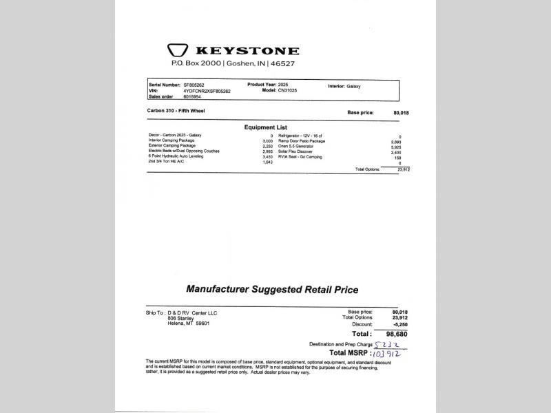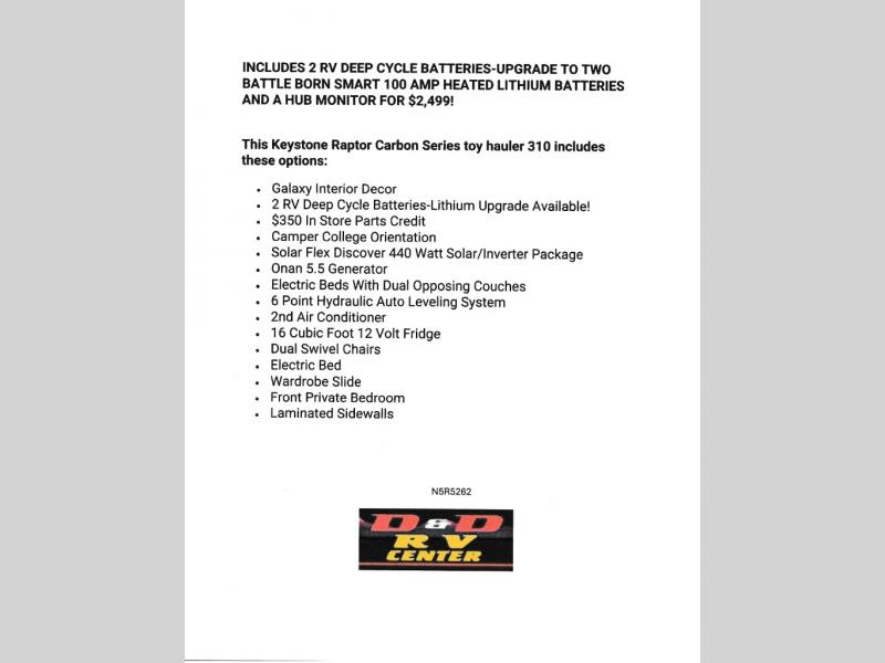 This Keystone Raptor Carbon Series toy hauler 310 includes these options:
