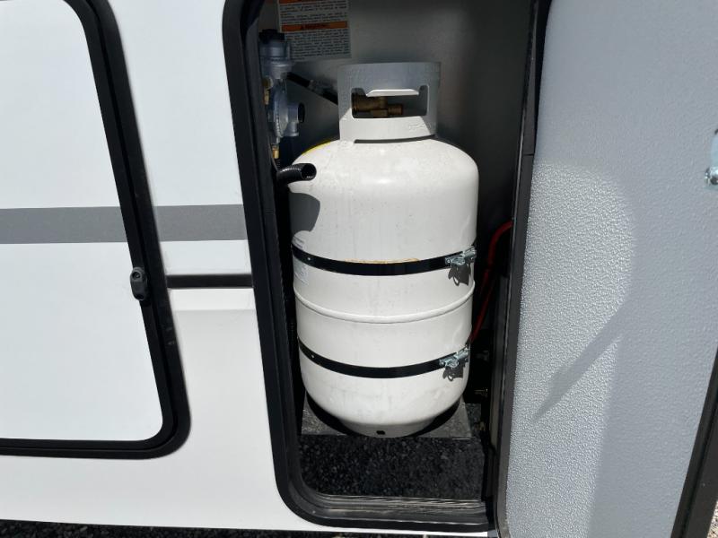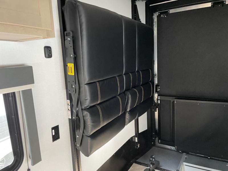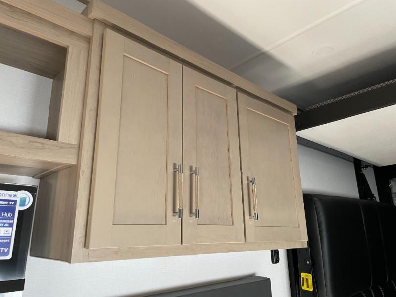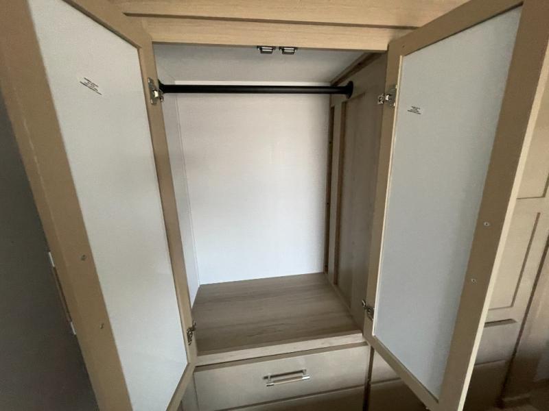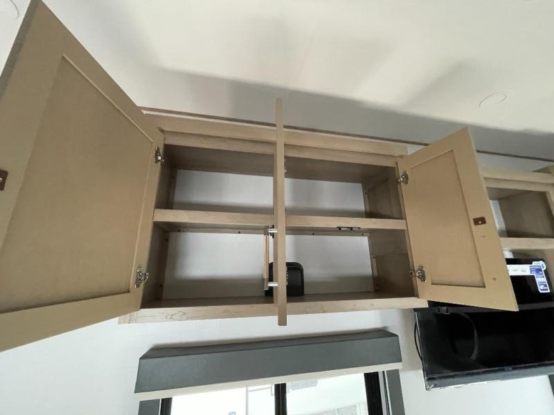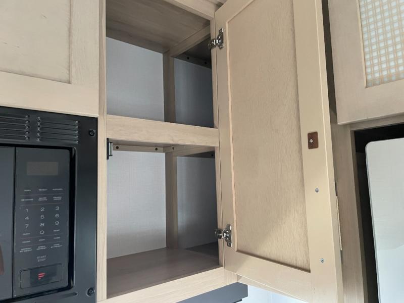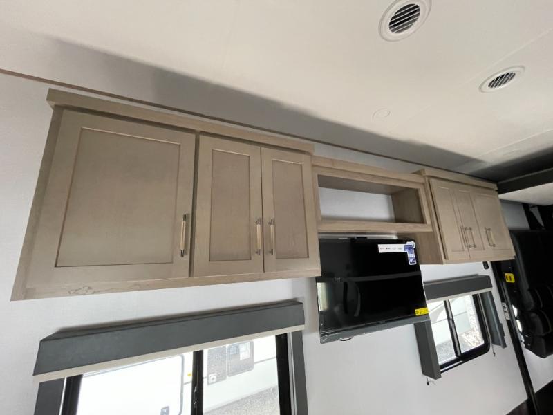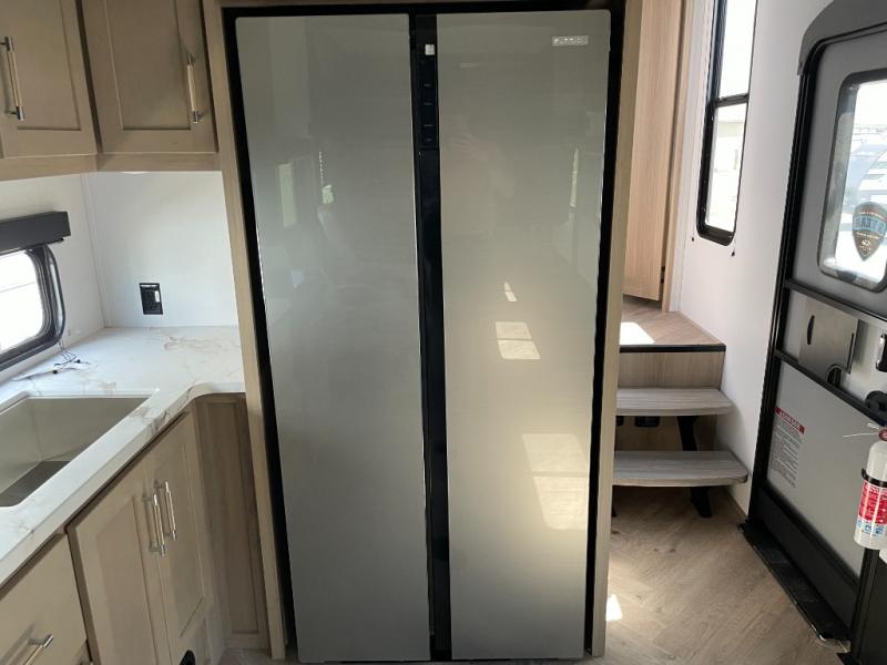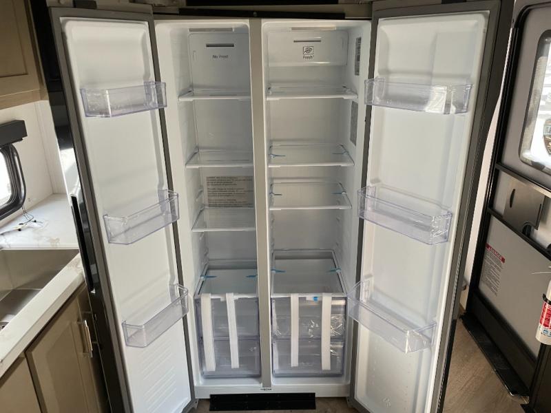 Grab your helmets and load up the dirt bikes in this spacious fifth wheel! Once you've arrived at the campground, you can use the ramp door to unload your toys from the 19' 9" garage area. There are dual opposing sofas here, along with an electric bed for guests to sleep on. The queen bed in the front bedroom will be reserved for you and all of your clothes can be kept tidy in the wardrobe slide, plus there are dual wardrobes and nightstands on either side of the bed. Head to the kitchen where you'll find generous counter space, a three burner range and a residential microwave, plus a 16.5 cu. ft. 12V refrigerator for food storage.