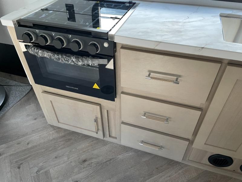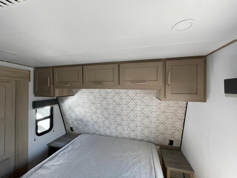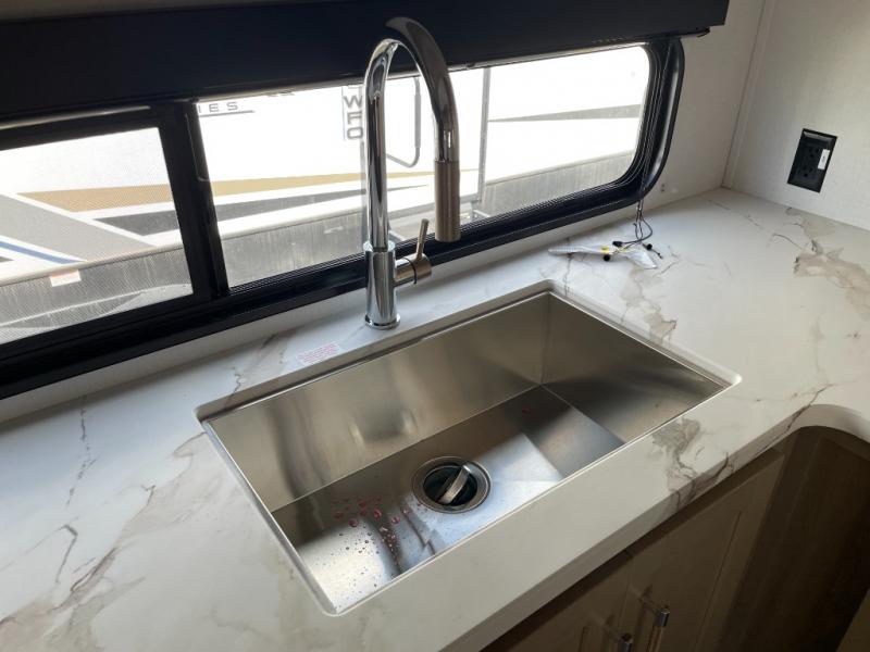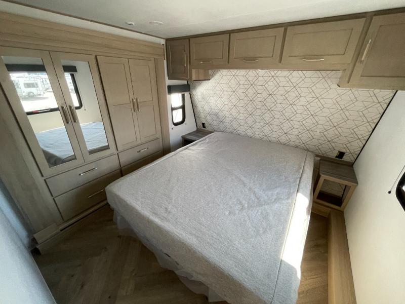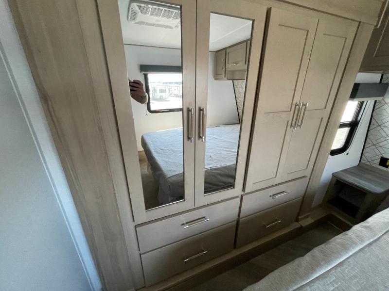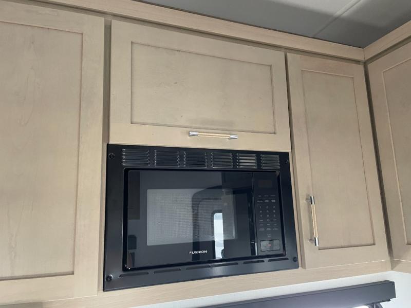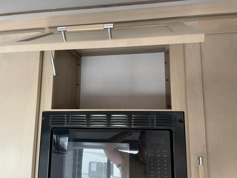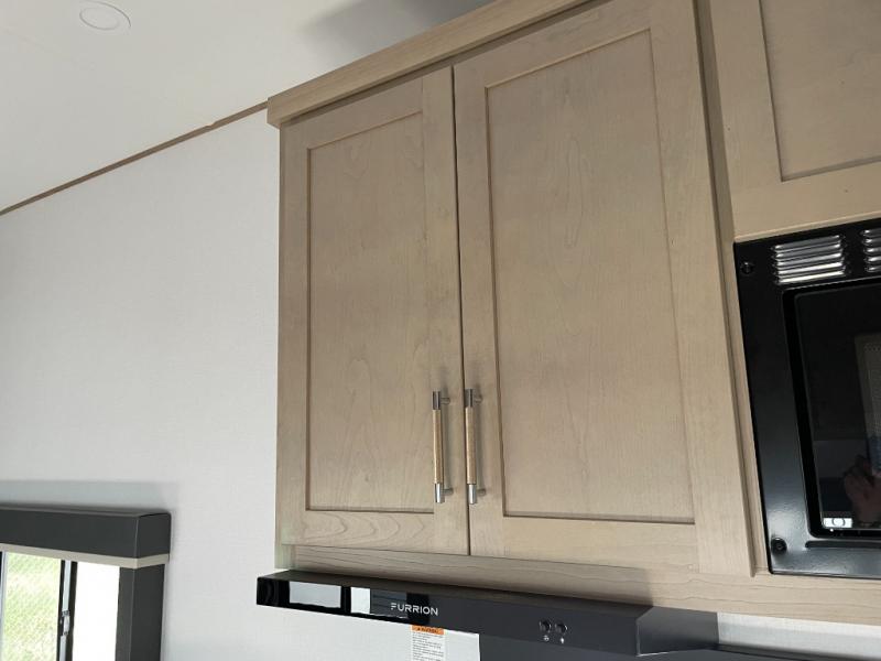 Grab your helmets and load up the dirt bikes in this spacious fifth wheel! Once you've arrived at the campground, you can use the ramp door to unload your toys from the 19' 9" garage area. There are dual opposing sofas here, along with an electric bed for guests to sleep on. The queen bed in the front bedroom will be reserved for you and all of your clothes can be kept tidy in the wardrobe slide, plus there are dual wardrobes and nightstands on either side of the bed. Head to the kitchen where you'll find generous counter space, a three burner range and a residential microwave, plus a 16.5 cu. ft. 12V refrigerator for food storage.