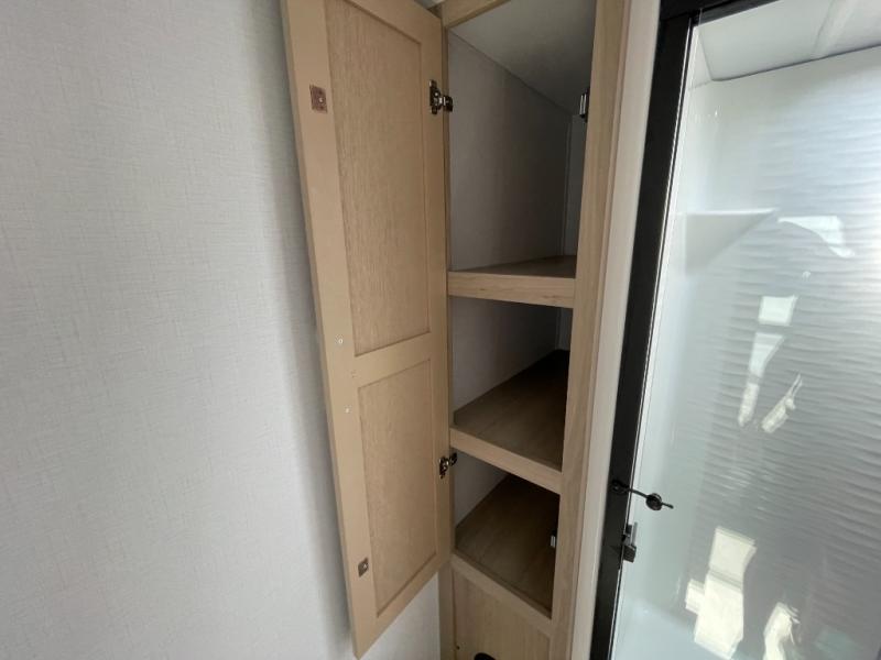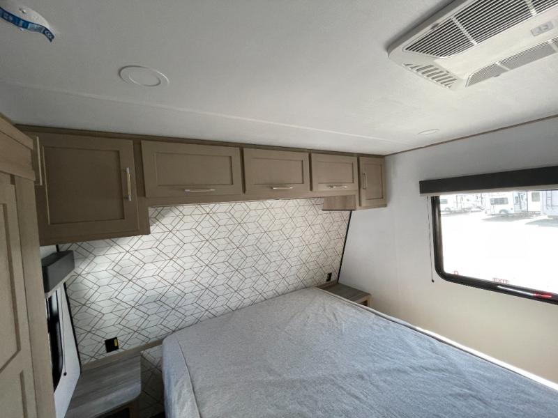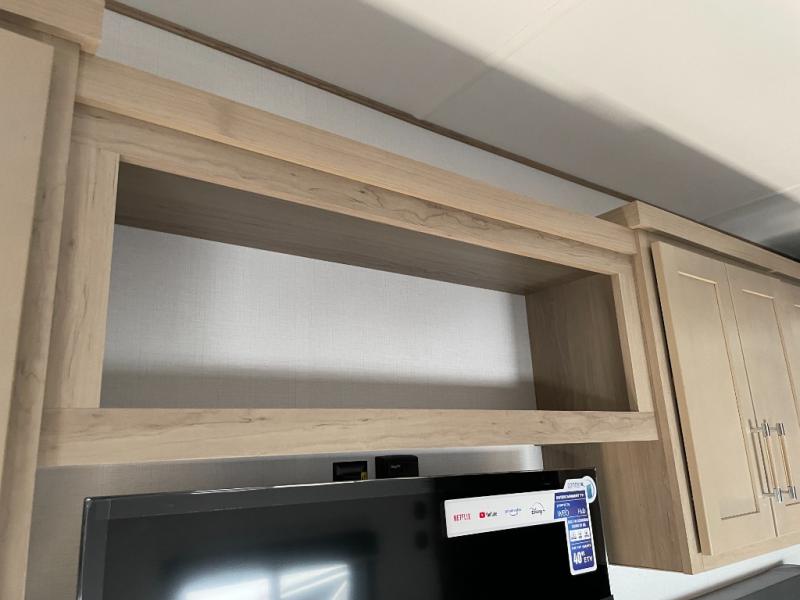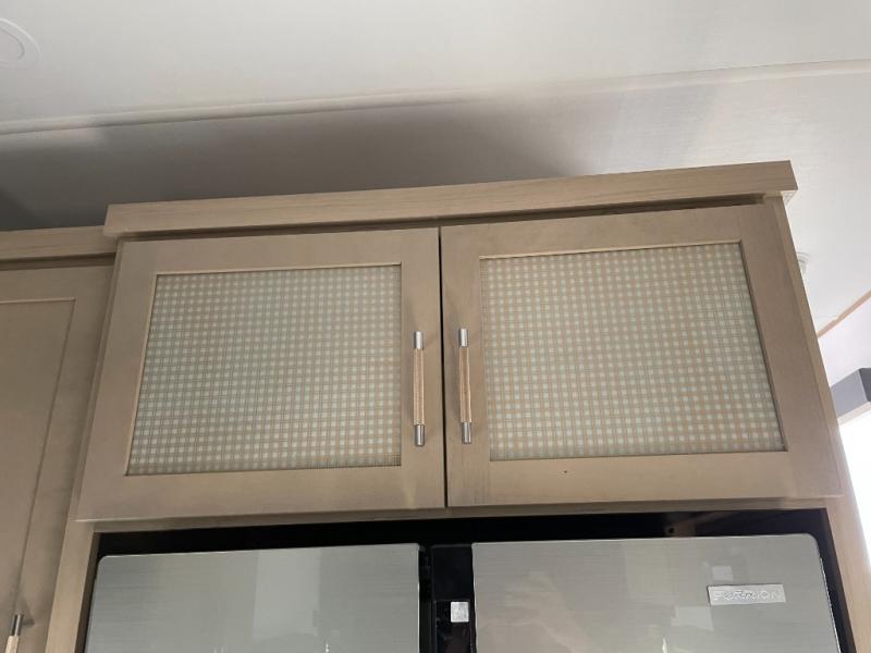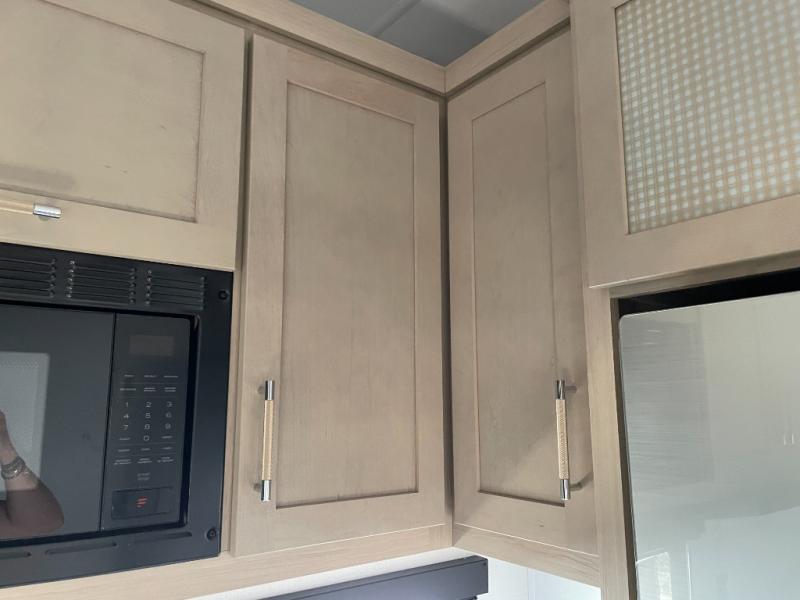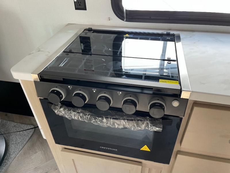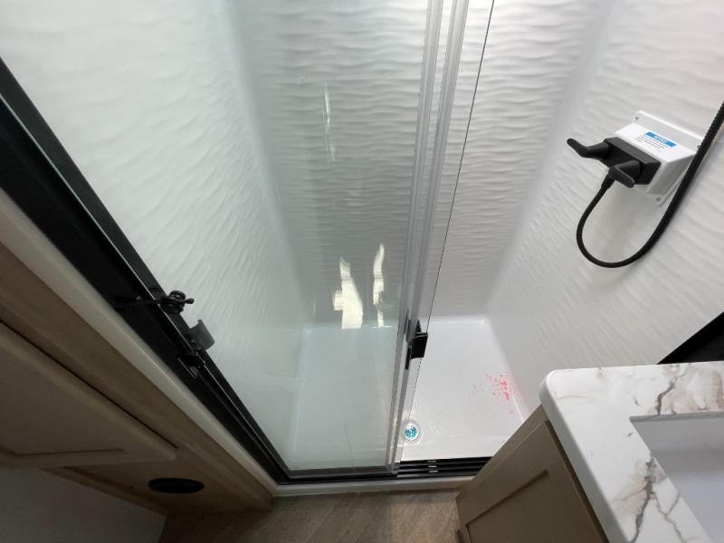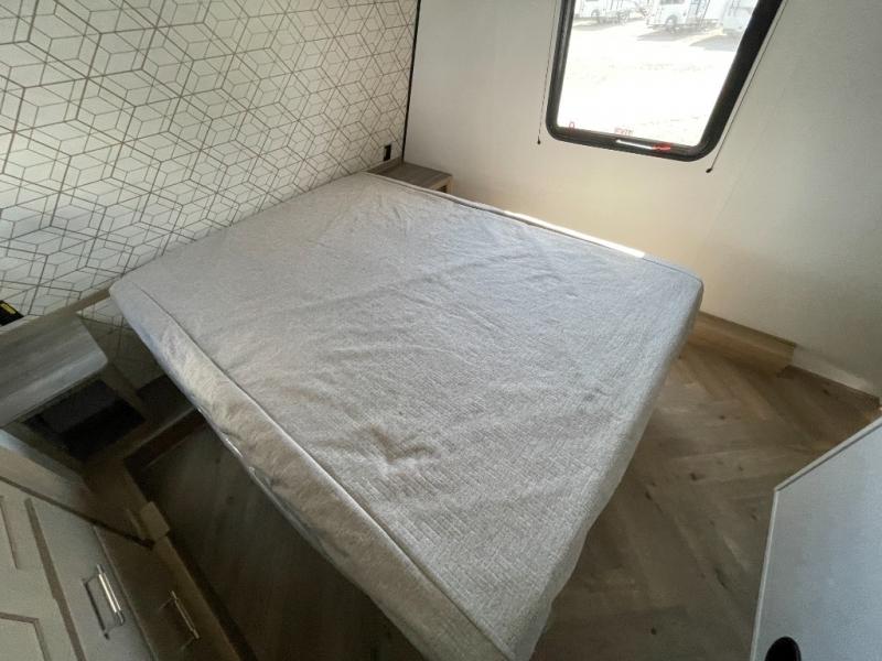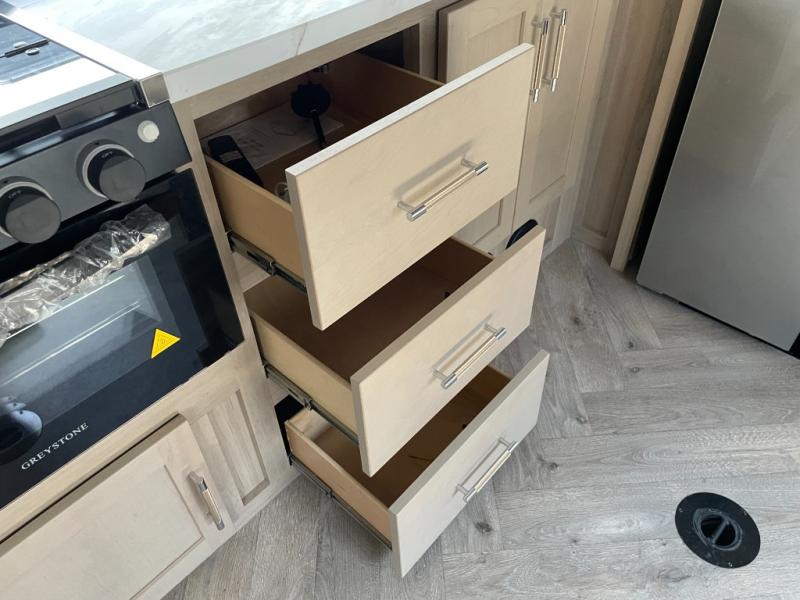 Grab your helmets and load up the dirt bikes in this spacious fifth wheel! Once you've arrived at the campground, you can use the ramp door to unload your toys from the 19' 9" garage area. There are dual opposing sofas here, along with an electric bed for guests to sleep on. The queen bed in the front bedroom will be reserved for you and all of your clothes can be kept tidy in the wardrobe slide, plus there are dual wardrobes and nightstands on either side of the bed. Head to the kitchen where you'll find generous counter space, a three burner range and a residential microwave, plus a 16.5 cu. ft. 12V refrigerator for food storage.