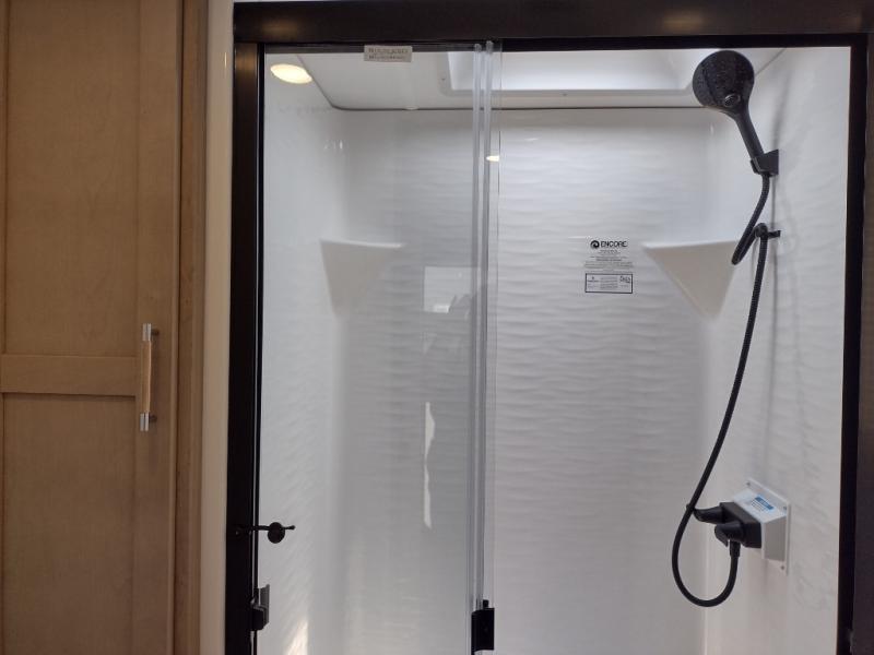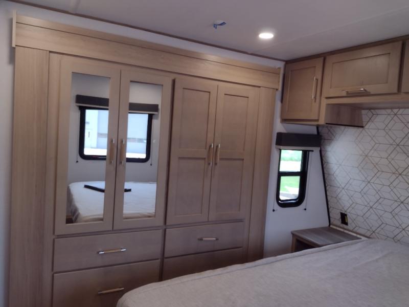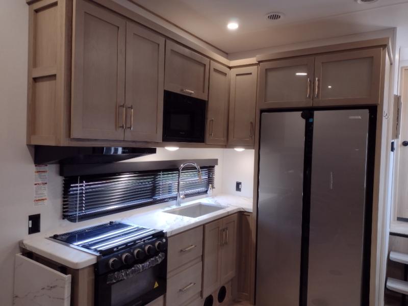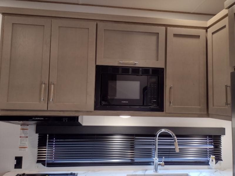 Grab your helmets and load up the dirt bikes in this spacious fifth wheel! Once you've arrived at the campground, you can use the ramp door to unload your toys from the 19' 9" garage area. There are dual opposing sofas here, along with an electric bed for guests to sleep on. The queen bed in the front bedroom will be reserved for you and all of your clothes can be kept tidy in the wardrobe slide, plus there are dual wardrobes and nightstands on either side of the bed. Head to the kitchen where you'll find generous counter space, a three burner range and a residential microwave, plus a 16.5 cu. ft. 12V refrigerator for food storage.