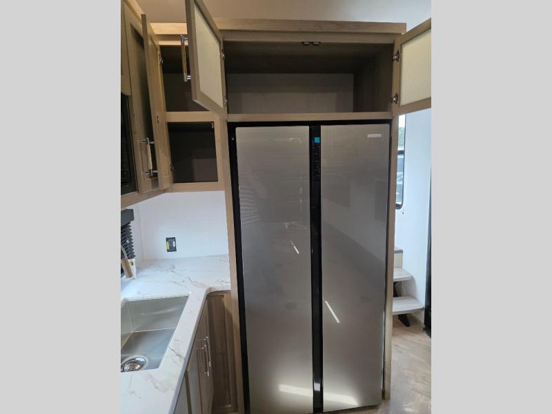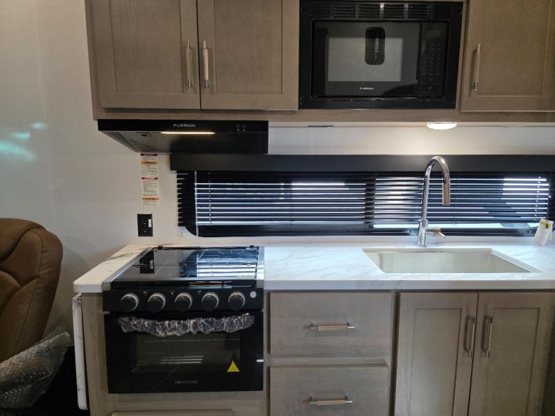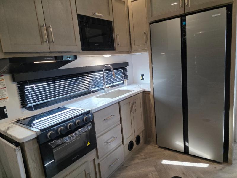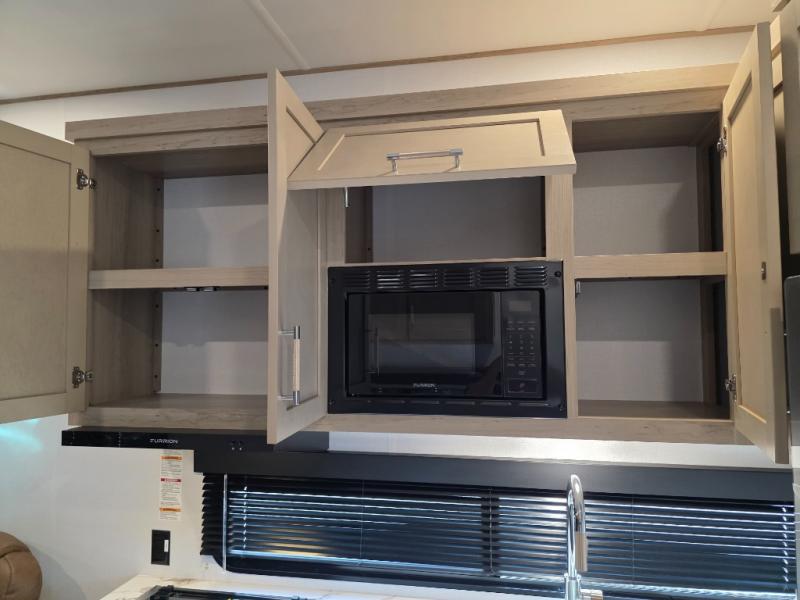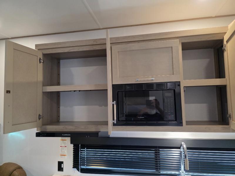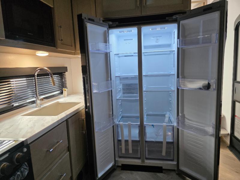 Grab your helmets and load up the dirt bikes in this spacious fifth wheel! Once you've arrived at the campground, you can use the ramp door to unload your toys from the 19' 9" garage area. There are dual opposing sofas here, along with an electric bed for guests to sleep on. The queen bed in the front bedroom will be reserved for you and all of your clothes can be kept tidy in the wardrobe slide, plus there are dual wardrobes and nightstands on either side of the bed. Head to the kitchen where you'll find generous counter space, a three burner range and a residential microwave, plus a 16.5 cu. ft. 12V refrigerator for food storage.