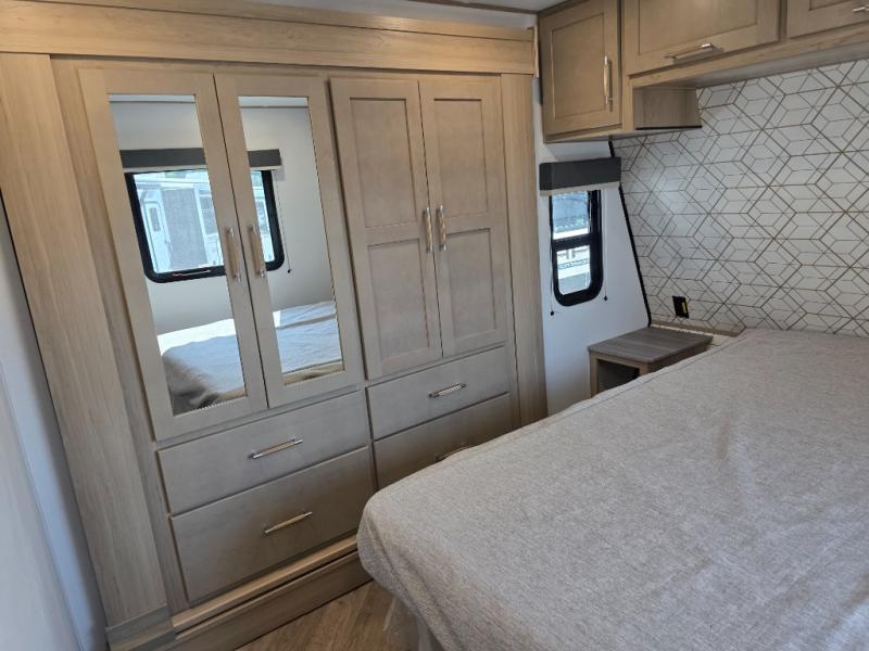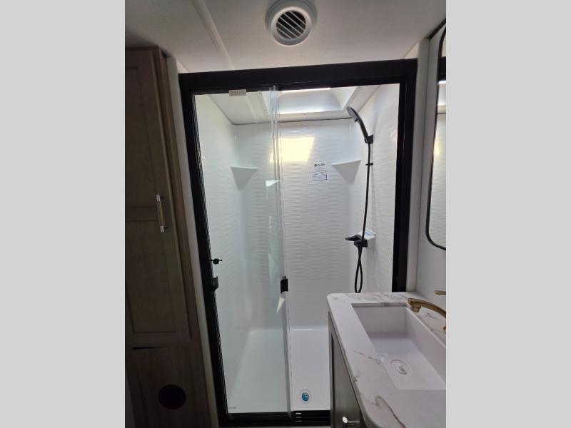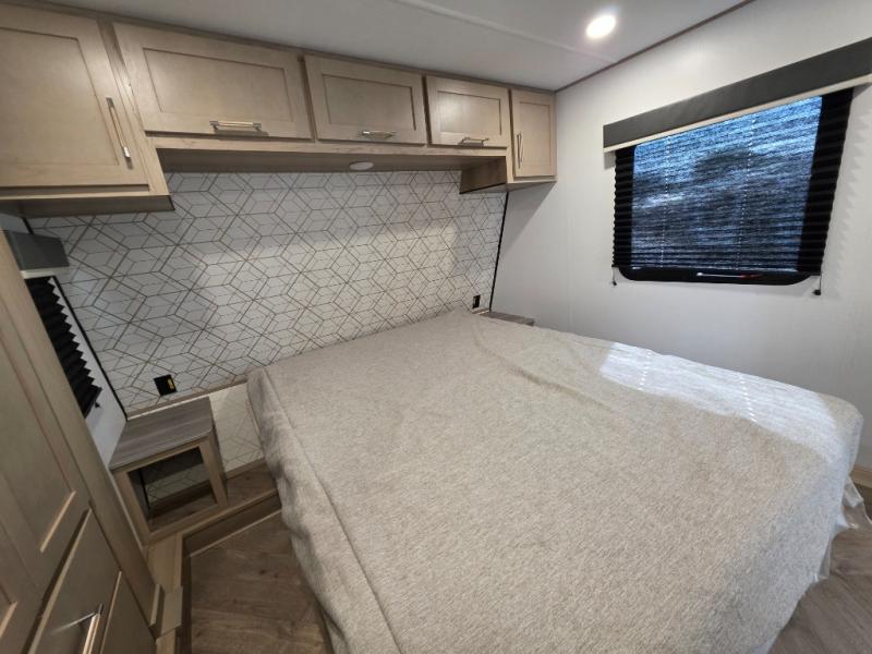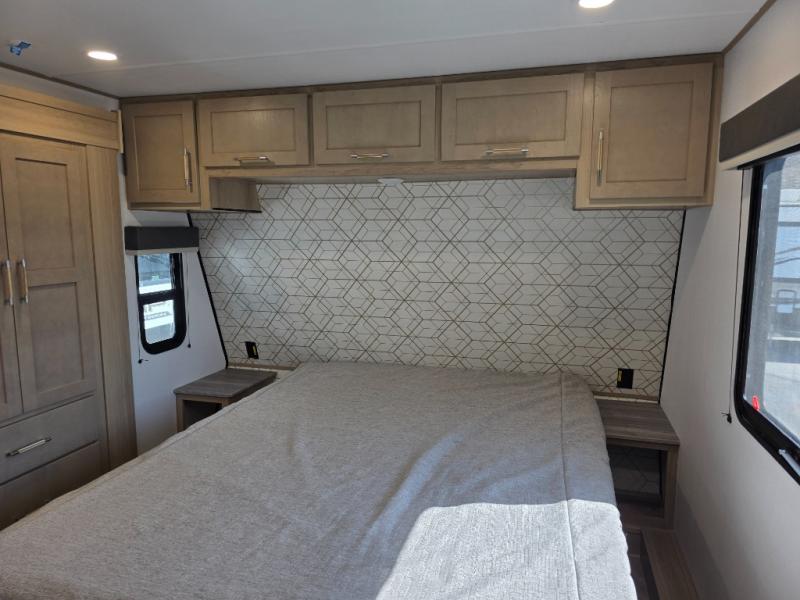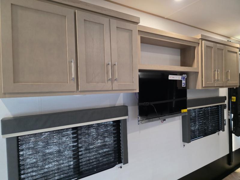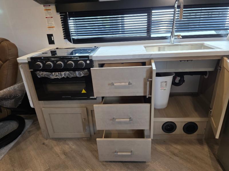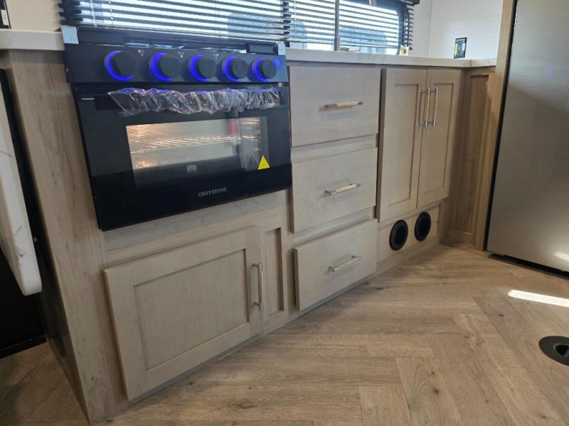 Grab your helmets and load up the dirt bikes in this spacious fifth wheel! Once you've arrived at the campground, you can use the ramp door to unload your toys from the 19' 9" garage area. There are dual opposing sofas here, along with an electric bed for guests to sleep on. The queen bed in the front bedroom will be reserved for you and all of your clothes can be kept tidy in the wardrobe slide, plus there are dual wardrobes and nightstands on either side of the bed. Head to the kitchen where you'll find generous counter space, a three burner range and a residential microwave, plus a 16.5 cu. ft. 12V refrigerator for food storage.