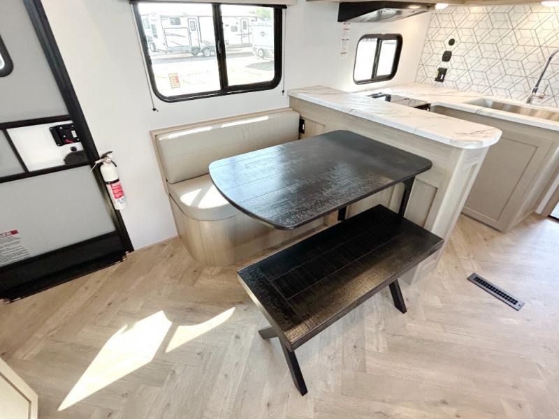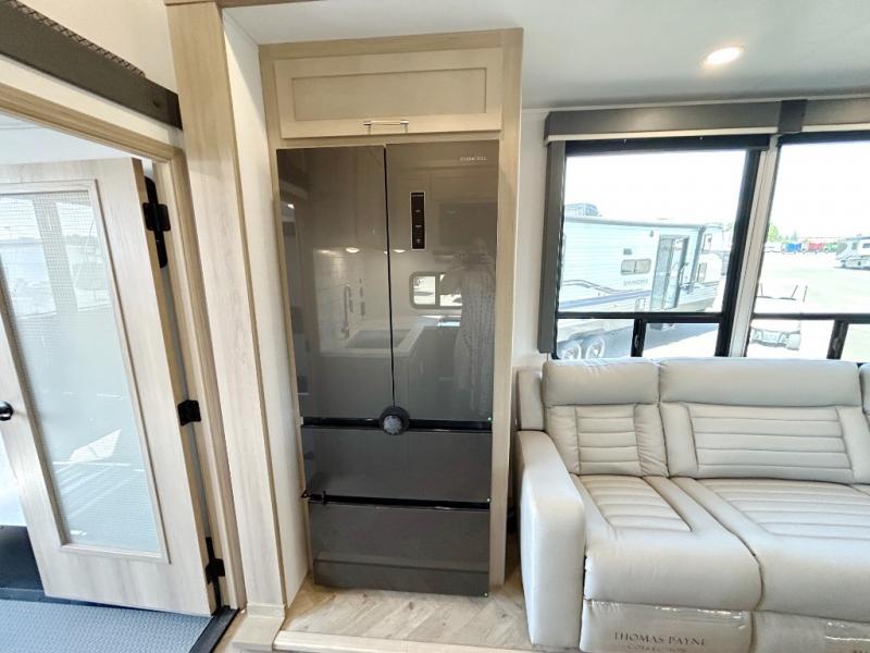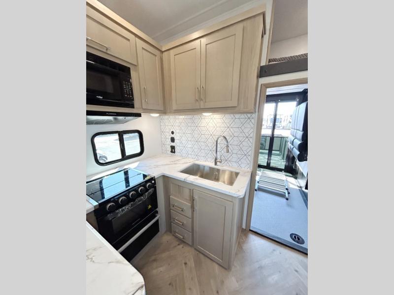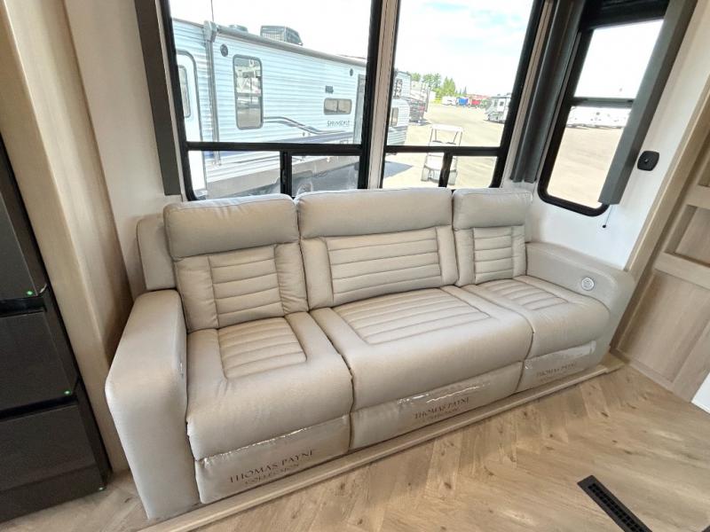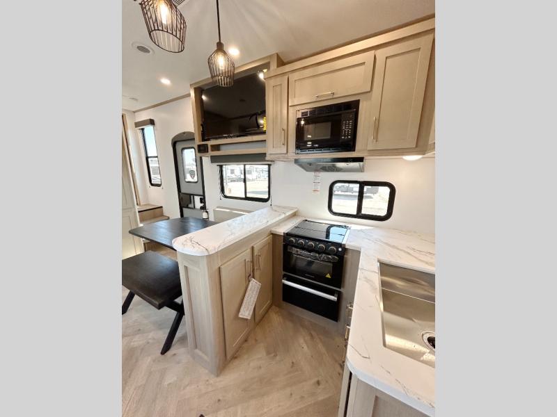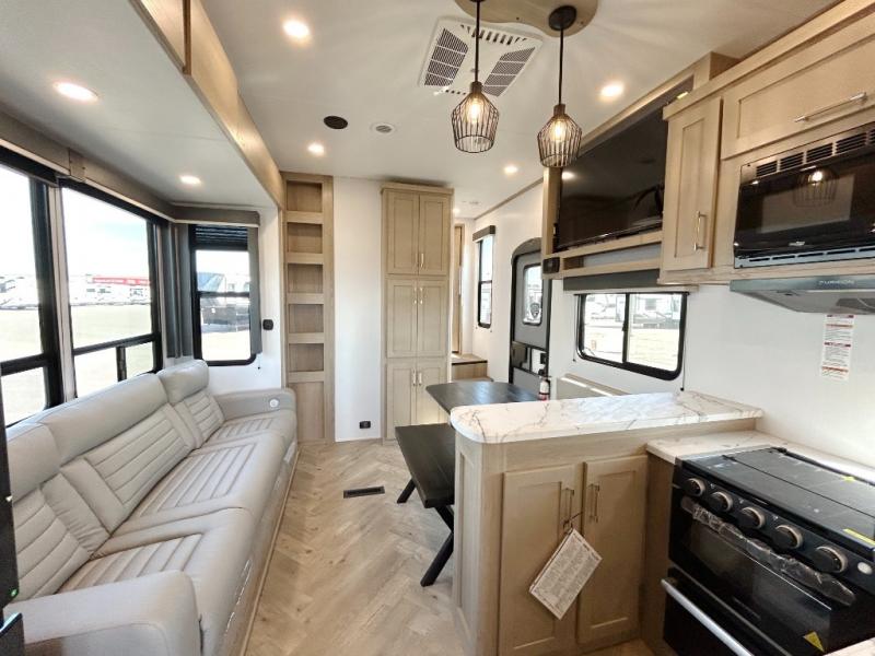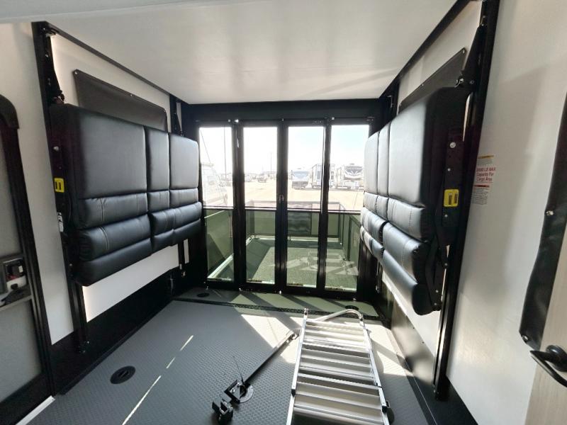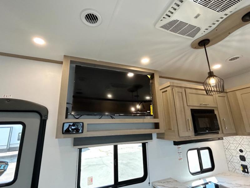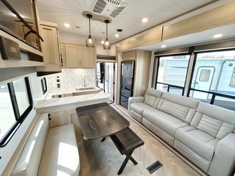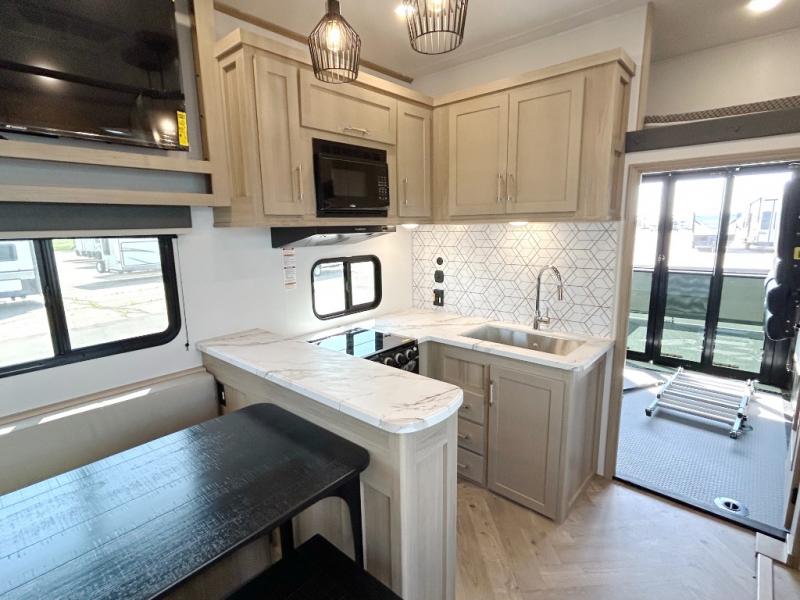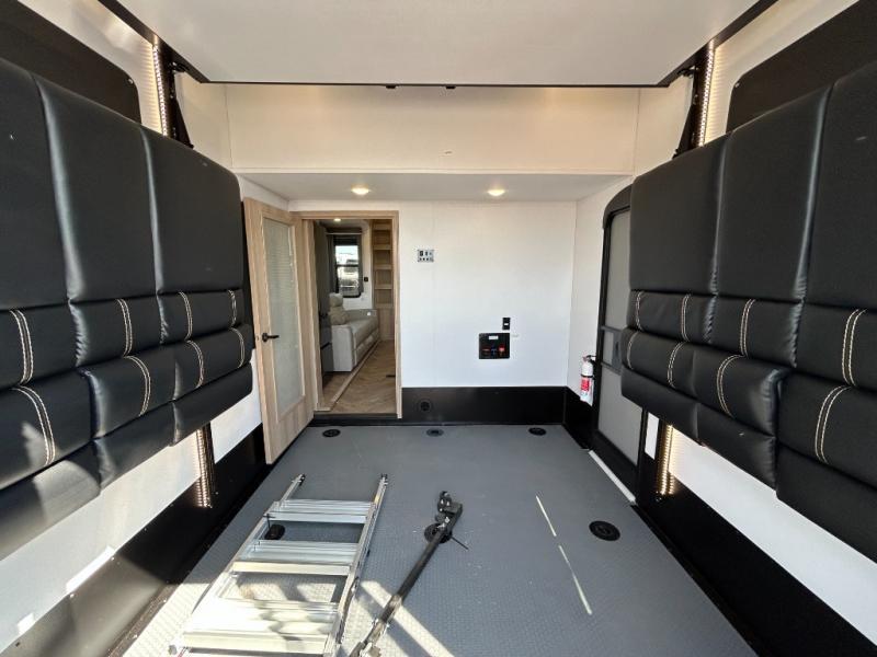 This tandem axle fifth wheel offers a 10' separate garage, two slide outs, dual entry and so much more giving you the ultimate experience while camping with your ATV, motorcycles, or whatever you want to haul in the garage. After unloading using the ramp door, you can easily set up the electric bed with dual opposing sofas to sleep or relax on, and the loft includes a twin bed for more sleeping space. The U-shaped counter includes a large farmhouse style sink, kitchen appliances, and overhead cabinets. You can dine at the dinette table with bench seating, or while at the 97" sofa with recliners, and everyone can watch the 50" LED TV with surround sound. There is a full bathroom to get cleaned up in, and the front bedroom offers a king bed, a wardrobe slide, plus wireless phone chargers, nightstands and wardrobes.