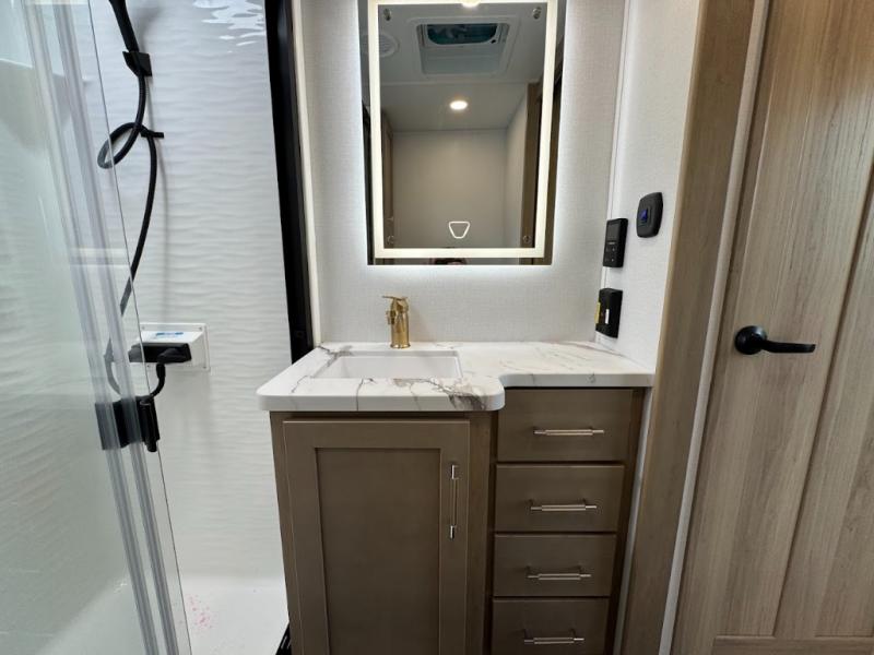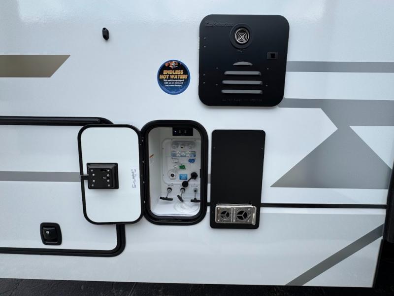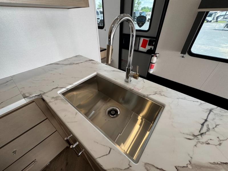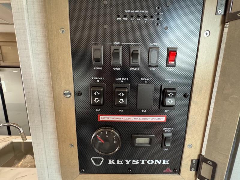 With any Keystone Raptor Carbon Series toy hauler, you will receive a rugged construction from the industry-leading patented 5,000 lb. capacity tie-downs that are welded to the frame to increase hauling safety and security, plus the Dyna Span floor decking in the garage. There is off-grid camping with the Solar Flex which delivers an affordable, high-quality RV solar energy system, and a comfortable interior with the exclusive Omni-Chill technology that offers high-efficiency air conditioning and maximum cooling. Other unexpected conveniences include soft-close hardwood cabinetry allowing you to sneak snacks without others noticing, and designer style flooring throughout for easy care and a stylish look. And each Raptor Carbon Series includes Keystone Exclusives! Now all you have to do is take charge of how you camp in a toy hauler fifth wheel or travel trailer!