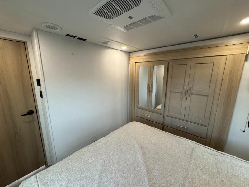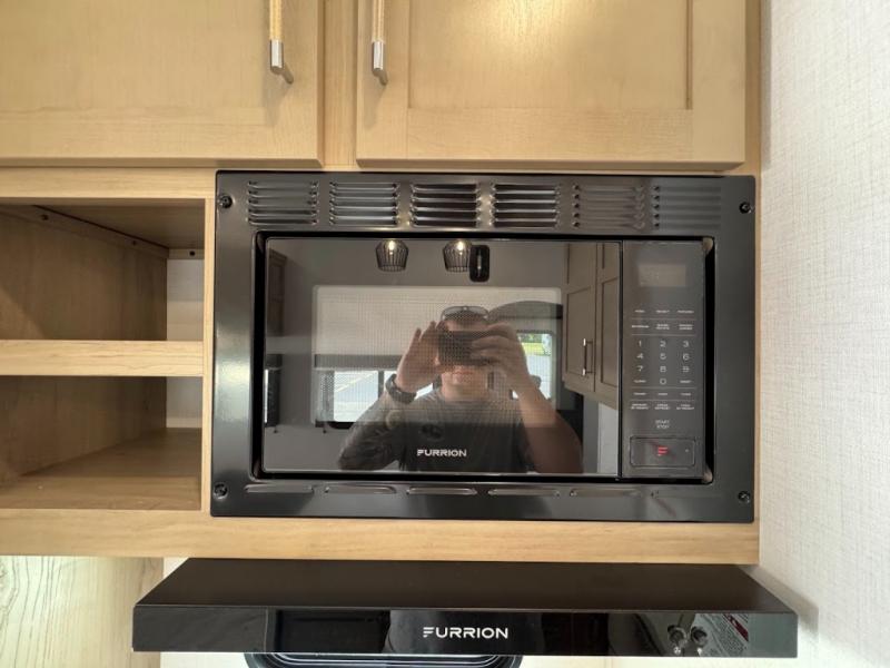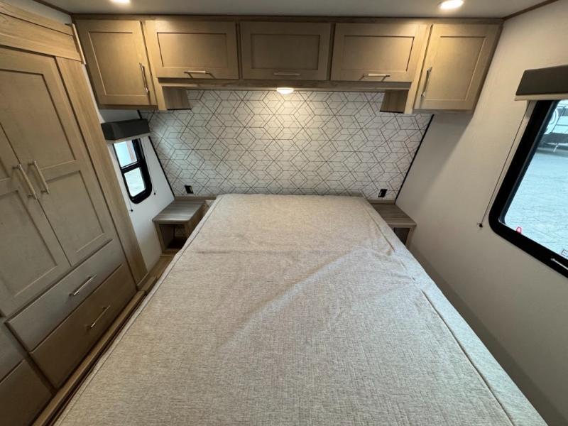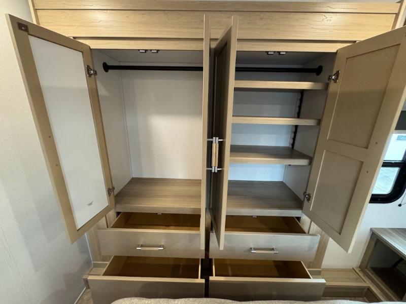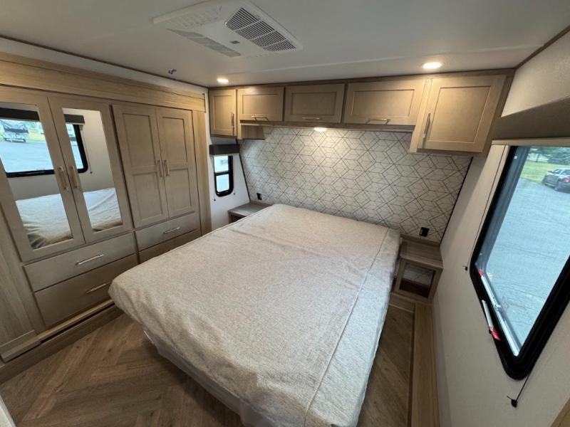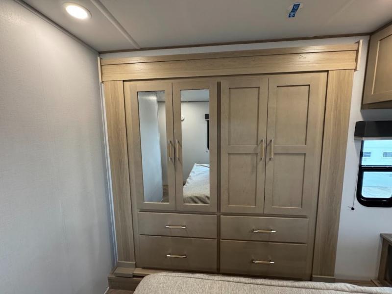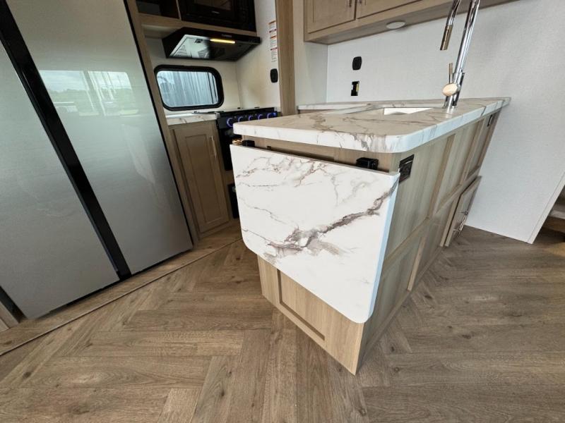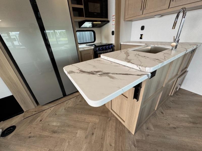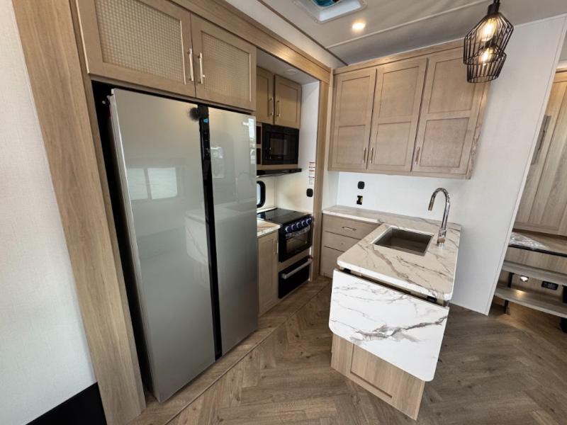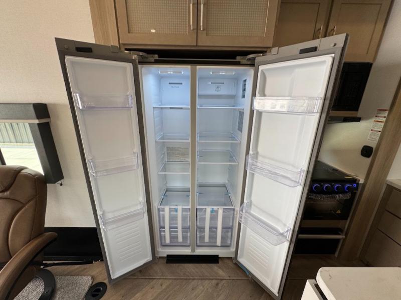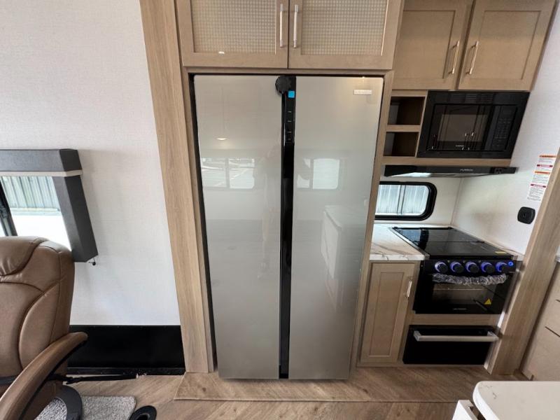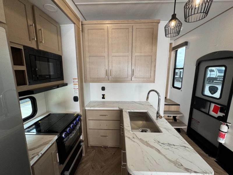 Grab your helmets and load up the dirt bikes in this spacious fifth wheel! Once you've arrived at the campground, you can use the ramp door to unload your toys from the 21' 6" garage area. There are dual opposing sofas here, along with an electric bed for guests to sleep on. The queen bed in the front bedroom offers a good night's rest and all of your clothes can be kept tidy in the wardrobe slide, plus there are dual wardrobes and nightstands on either side of the bed. Head to the kitchen where you'll find generous counter space, a flip-up countertop, a three burner range and a residential microwave, plus a 16.5 cu. ft. 12V refrigerator slide for food storage.