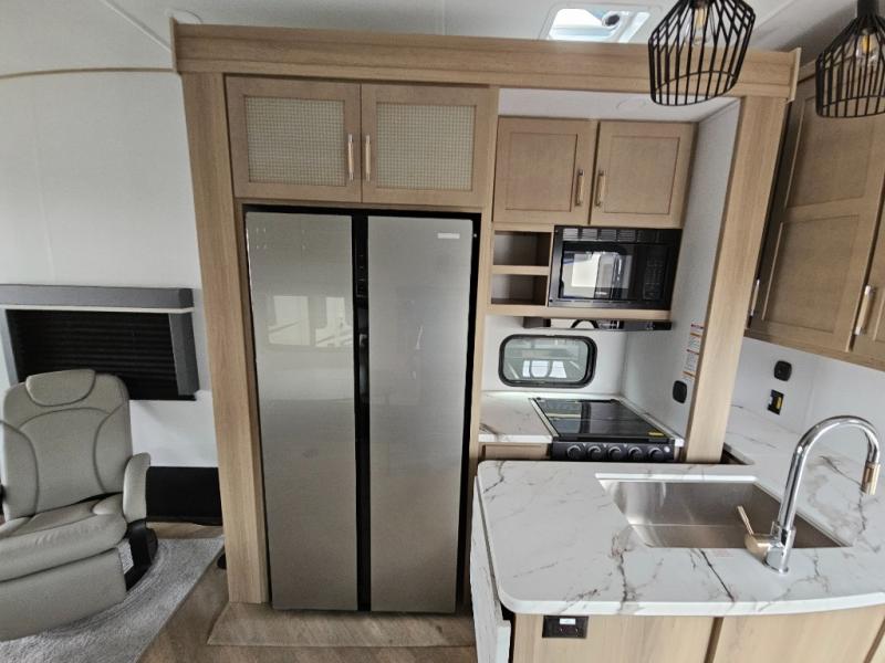 Grab your helmets and load up the dirt bikes in this spacious fifth wheel! Once you've arrived at the campground, you can use the ramp door to unload your toys from the 17' 6" garage area. There are dual opposing sofas here, along with an electric bed for guests to sleep on. The queen bed in the front bedroom offers a good night's rest and all of your clothes can be kept tidy in the wardrobe slide, plus there are dual wardrobes and nightstands on either side of the bed. Head to the kitchen where you'll find generous counter space, a flip-up countertop, a three burner range and a residential microwave, plus a 16.5 cu. ft. 12V refrigerator slide for food storage.