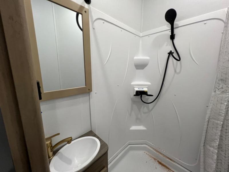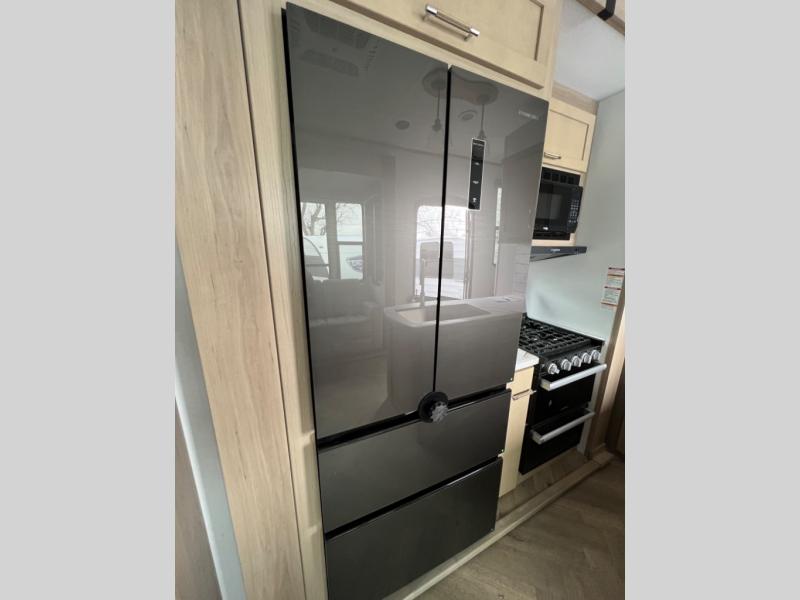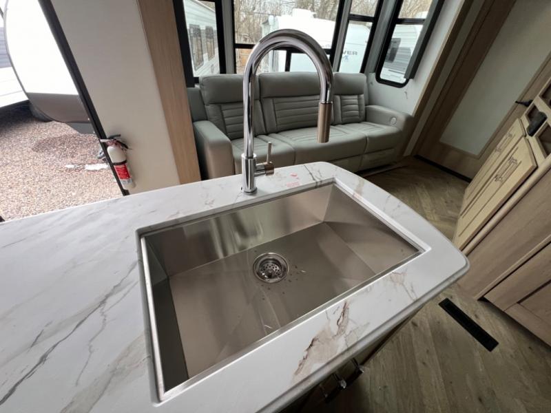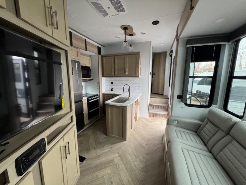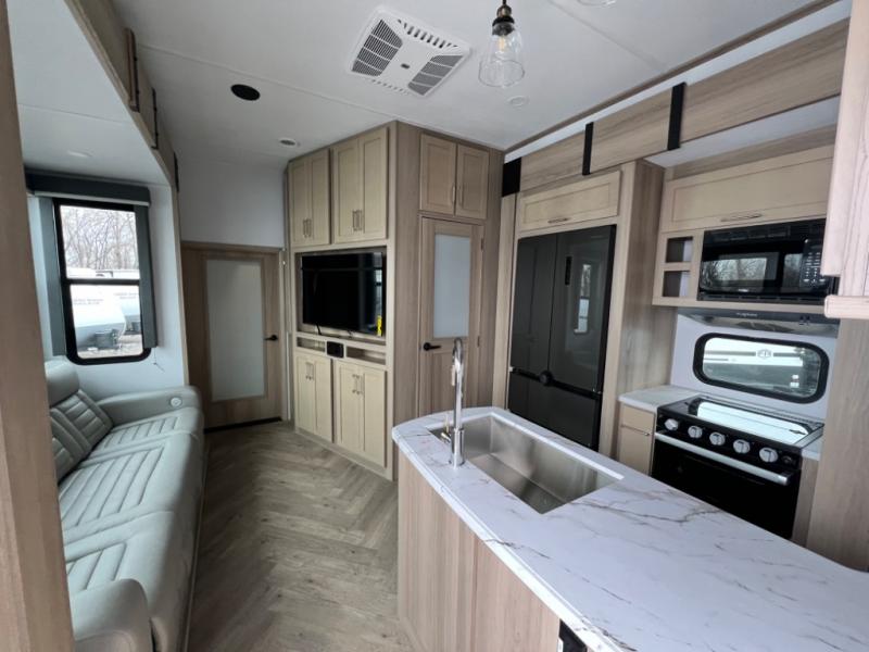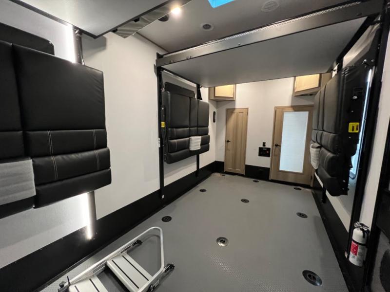 Invite the whole gang as this fifth wheel not only carries your ATV, motorcycles, and/or other outdoor toys to your destination in the 17' separate garage. The garage includes an electric bed with dual opposing sofas underneath, plus an optional second electric bed with sofas. There is also a full bath here for your guests plus washer and dryer prep! The kitchen offers a peninsula countertop with a large farmhouse style sink, appliances to whip up warm meals and heat leftovers, and a pantry to store snacks and more. There is a second full bathroom next to the front bedroom which offers a king bed, wireless phone chargers, and plenty of storage for your clothing including a slide out wardrobe. You will also enjoy a 50" LED TV with surround sound, a second pantry for all of your goodies, a 14' electric awning as well as a single 30 gallon fuel tank to keep the fun going all weekend long!