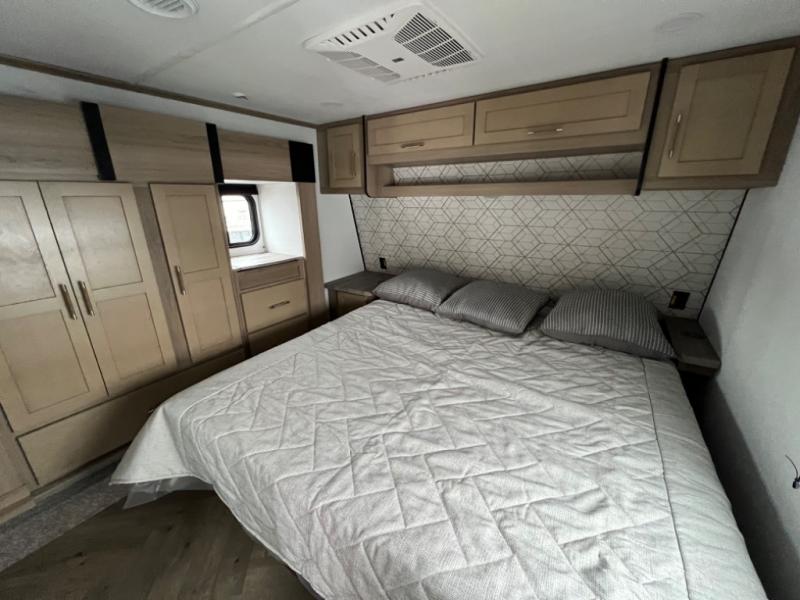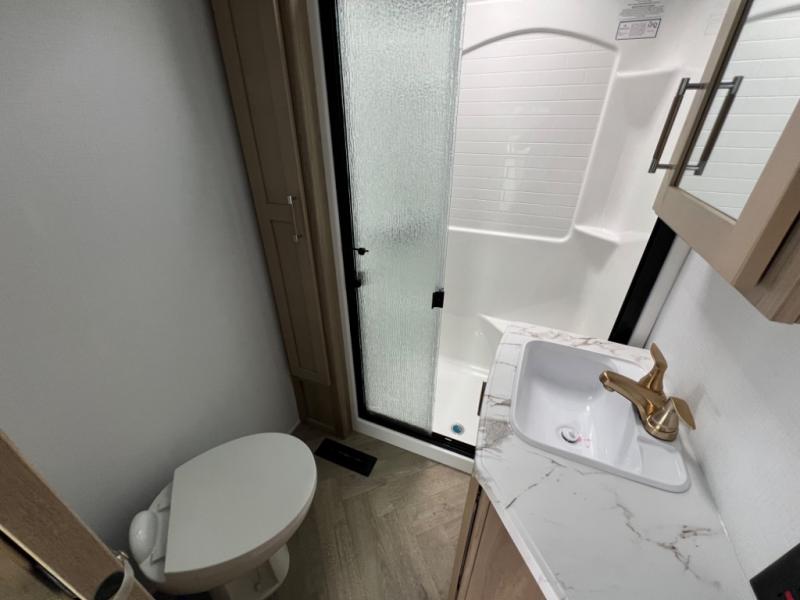 With any Keystone Raptor Carbon Series toy hauler, you will receive a rugged construction from the industry-leading patented 5,000 lb. capacity tie-downs that are welded to the frame to increase hauling safety and security, plus the Dyna Span floor decking in the garage. There is off-grid camping with the Solar Flex which delivers an affordable, high-quality RV solar energy system, and a comfortable interior with the exclusive Omni-Chill technology that offers high-efficiency air conditioning and maximum cooling. Other unexpected conveniences include soft-close hardwood cabinetry allowing you to sneak snacks without others noticing, and designer style flooring throughout for easy care and a stylish look. And each Raptor Carbon Series includes Keystone Exclusives! Now all you have to do is take charge of how you camp in a toy hauler fifth wheel or travel trailer!