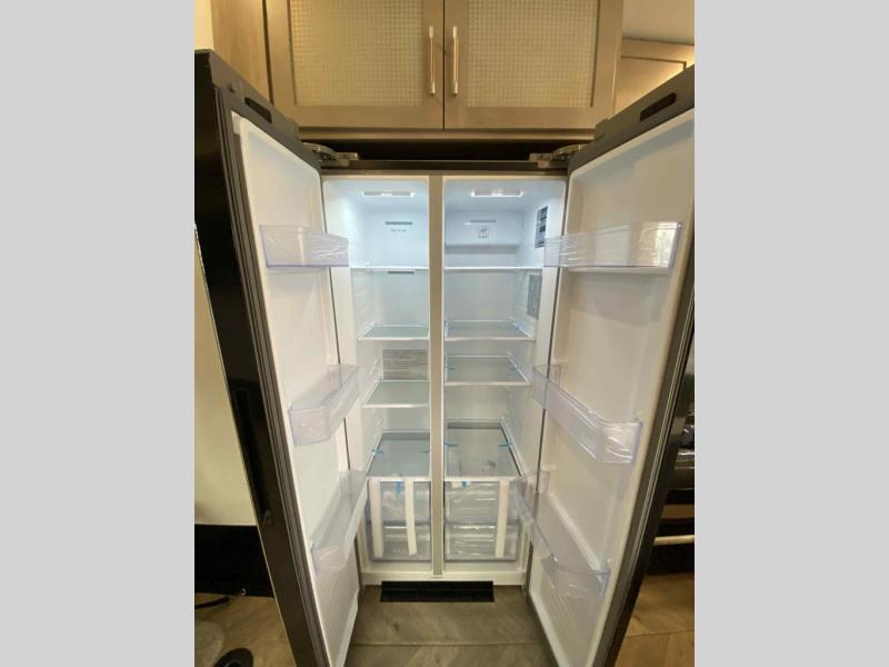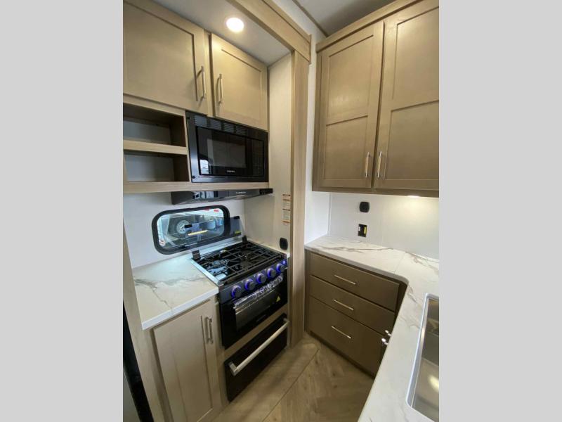 Grab your helmets and load up the dirt bikes in this spacious fifth wheel! Once you've arrived at the campground, you can use the ramp door to unload your toys from the 17' 6" garage area. There are dual opposing sofas here, along with an electric bed for guests to sleep on. The queen bed in the front bedroom offers a good night's rest and all of your clothes can be kept tidy in the wardrobe slide, plus there are dual wardrobes and nightstands on either side of the bed. Head to the kitchen where you'll find generous counter space, a flip-up countertop, a three burner range and a residential microwave, plus a 16.5 cu. ft. 12V refrigerator slide for food storage.