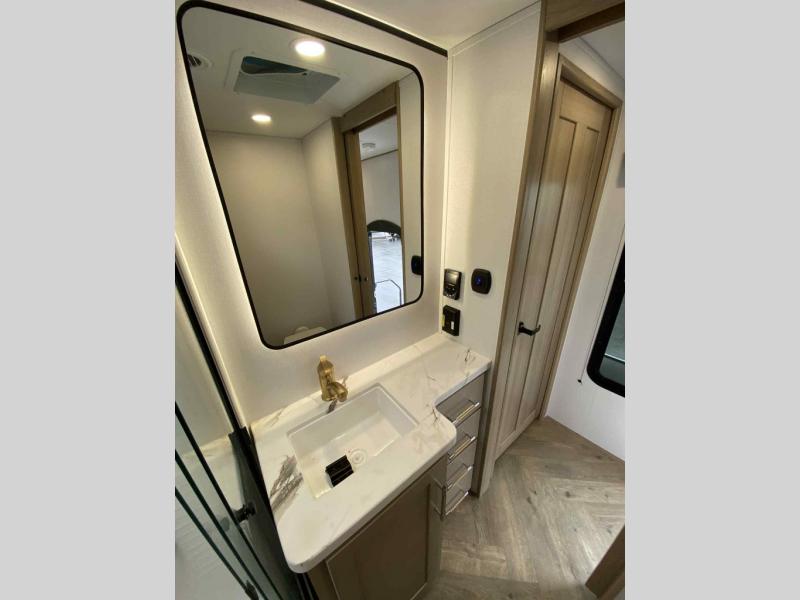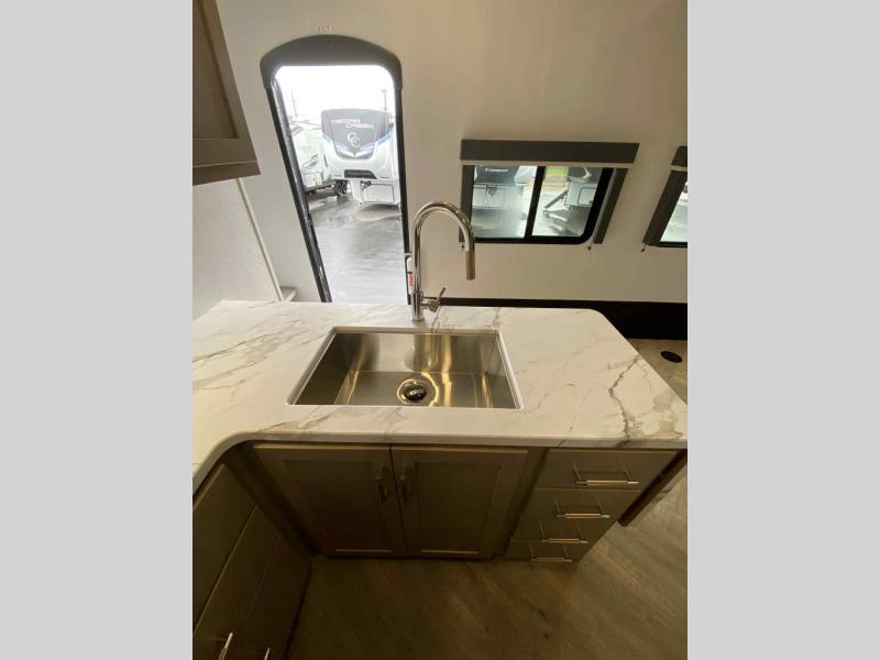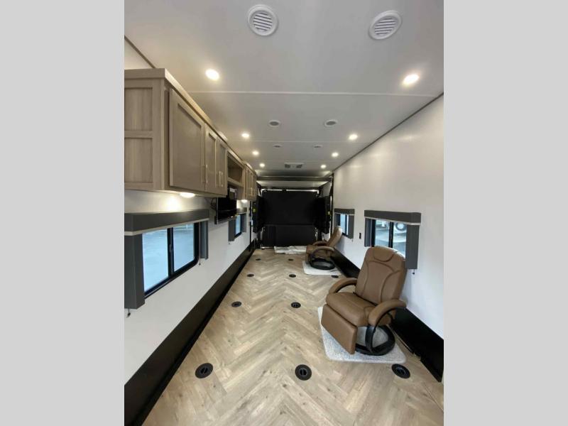 With any Keystone Raptor Carbon Series toy hauler, you will receive a rugged construction from the industry-leading patented 5,000 lb. capacity tie-downs that are welded to the frame to increase hauling safety and security, plus the Dyna Span floor decking in the garage. There is off-grid camping with the Solar Flex which delivers an affordable, high-quality RV solar energy system, and a comfortable interior with the exclusive Omni-Chill technology that offers high-efficiency air conditioning and maximum cooling. Other unexpected conveniences include soft-close hardwood cabinetry allowing you to sneak snacks without others noticing, and designer style flooring throughout for easy care and a stylish look. And each Raptor Carbon Series includes Keystone Exclusives! Now all you have to do is take charge of how you camp in a toy hauler fifth wheel or travel trailer!