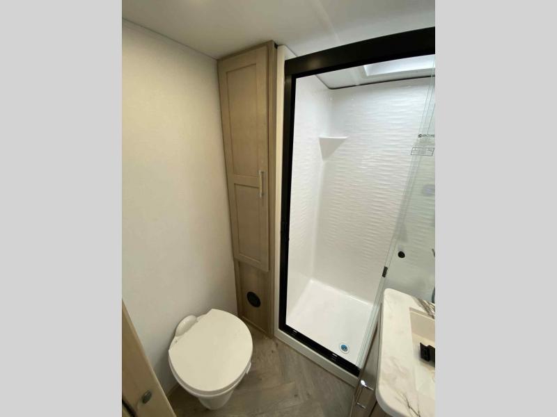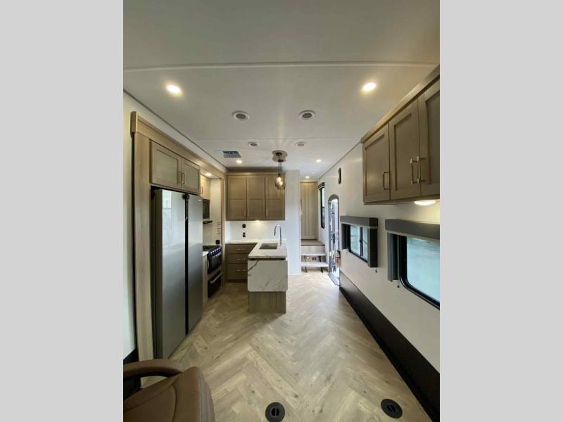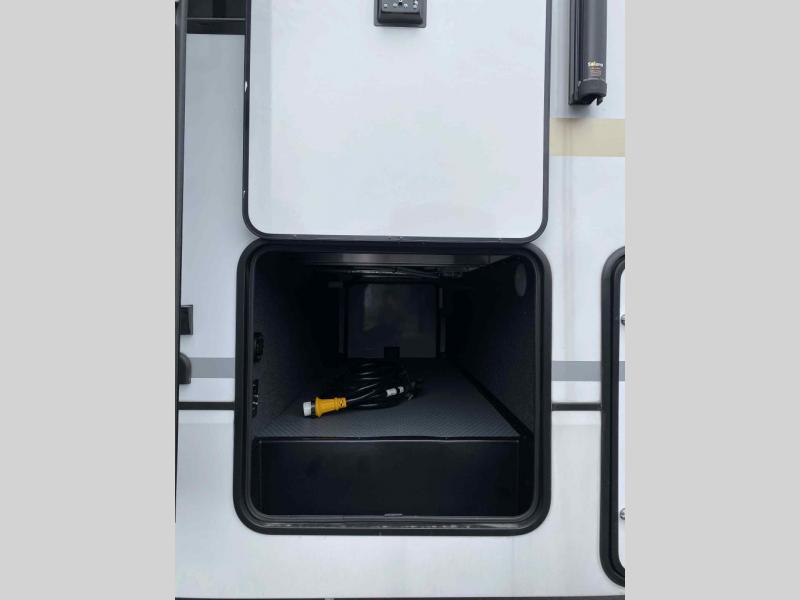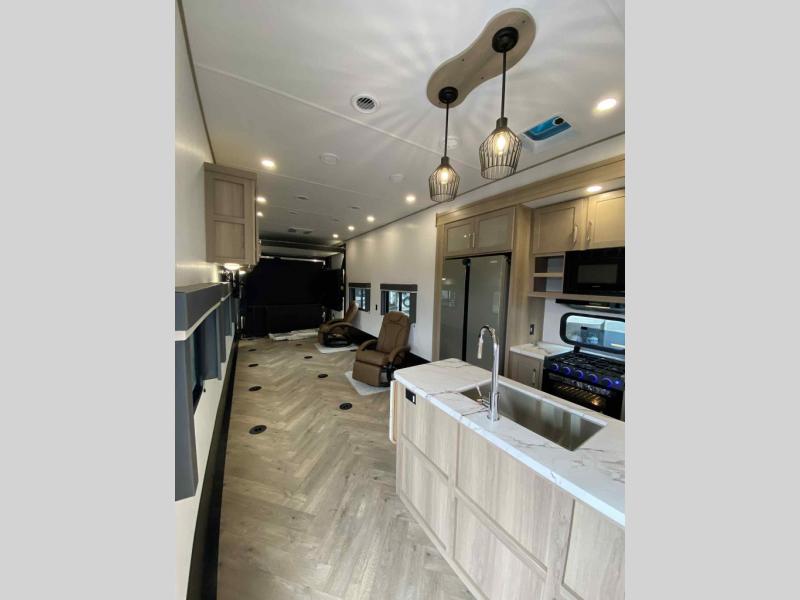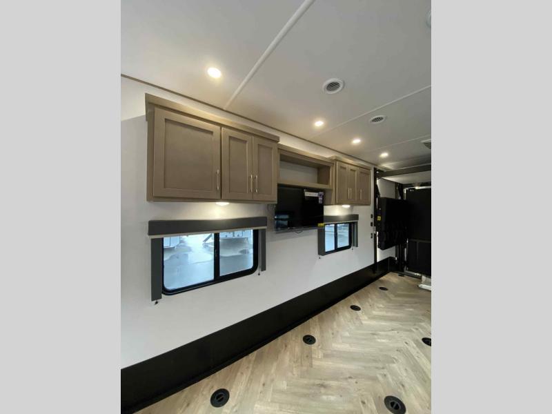 With any Keystone Raptor Carbon Series toy hauler, you will receive a rugged construction from the industry-leading patented 5,000 lb. capacity tie-downs that are welded to the frame to increase hauling safety and security, plus the Dyna Span floor decking in the garage. There is off-grid camping with the Solar Flex which delivers an affordable, high-quality RV solar energy system, and a comfortable interior with the exclusive Omni-Chill technology that offers high-efficiency air conditioning and maximum cooling. Other unexpected conveniences include soft-close hardwood cabinetry allowing you to sneak snacks without others noticing, and designer style flooring throughout for easy care and a stylish look. And each Raptor Carbon Series includes Keystone Exclusives! Now all you have to do is take charge of how you camp in a toy hauler fifth wheel or travel trailer!