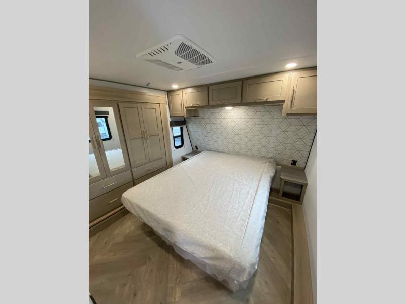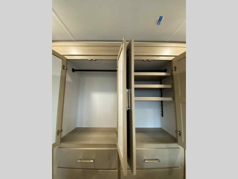 Grab your helmets and load up the dirt bikes in this spacious fifth wheel! Once you've arrived at the campground, you can use the ramp door to unload your toys from the 17' 6" garage area. There are dual opposing sofas here, along with an electric bed for guests to sleep on. The queen bed in the front bedroom offers a good night's rest and all of your clothes can be kept tidy in the wardrobe slide, plus there are dual wardrobes and nightstands on either side of the bed. Head to the kitchen where you'll find generous counter space, a flip-up countertop, a three burner range and a residential microwave, plus a 16.5 cu. ft. 12V refrigerator slide for food storage.