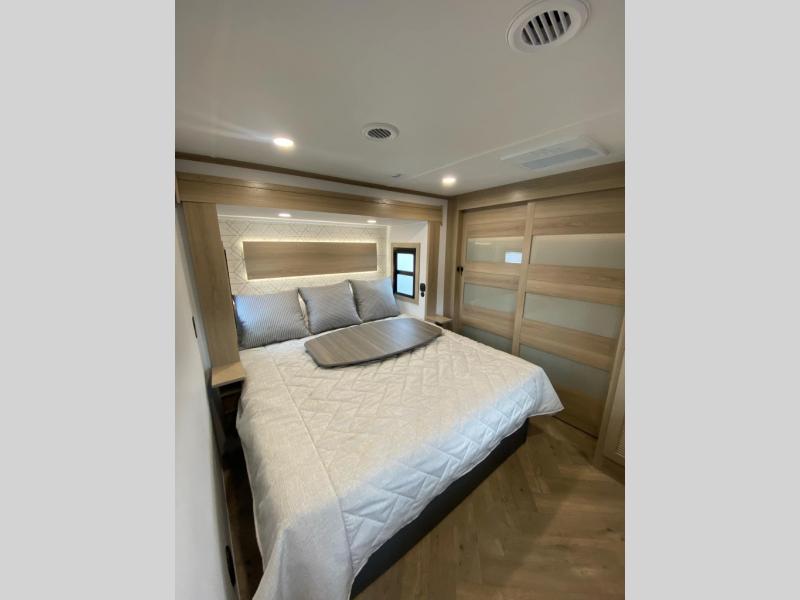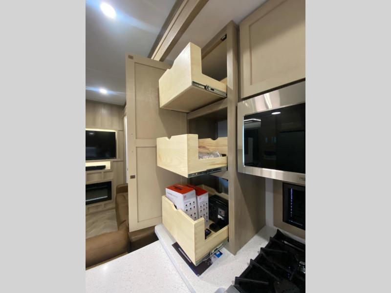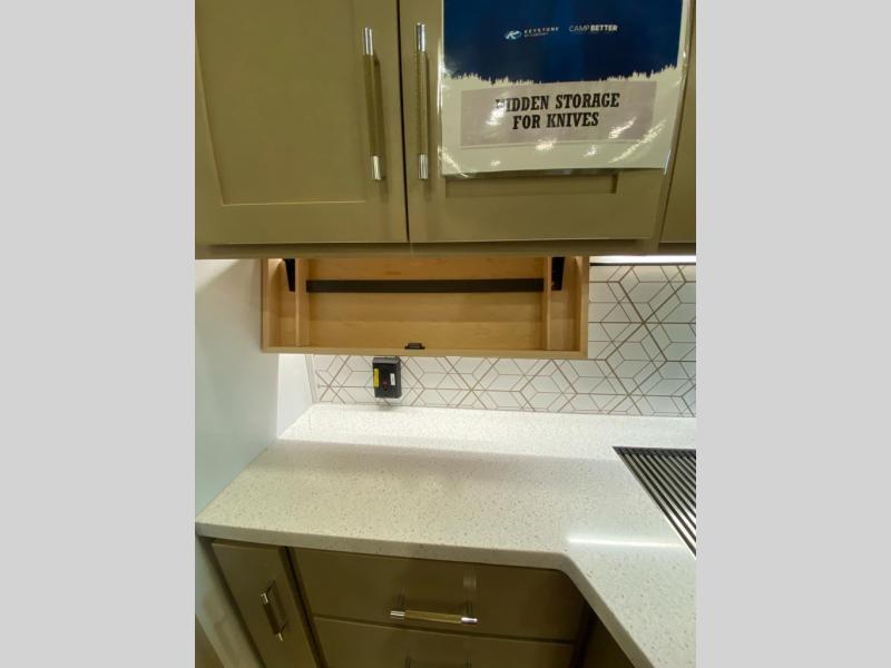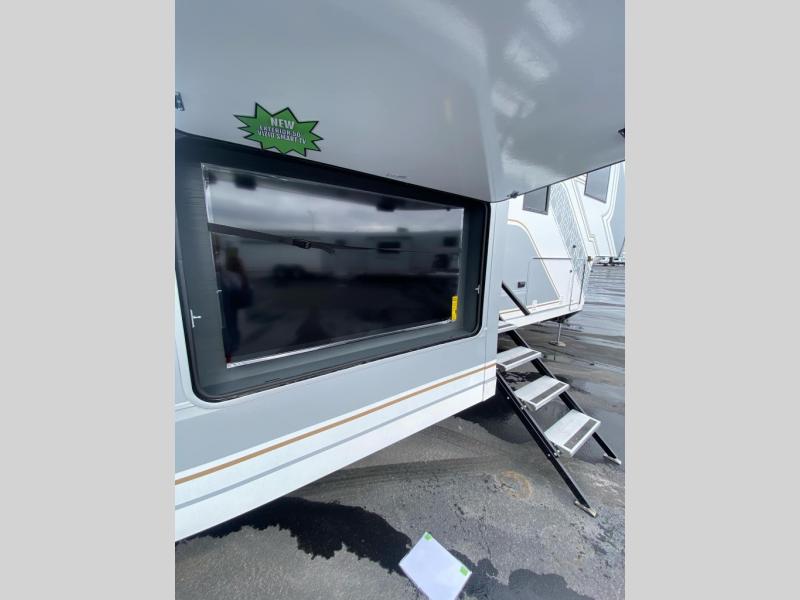 Experience a breath of fresh air with one of these Keystone RV Raptor fifth wheel toy haulers! Their rugged construction consists of a one-piece Alpha Super Flex TPO roof membrane, Dyna Span floor decking, and 5,000 lb. frame-welded tie- downs to keep your toys in place as you travel. Some unexpected conveniences you will appreciate include an Omni-Chill A/C system to keep you cool on those hot summer days, a Furrion backup camera, MaxTurn™ technology with a Helux™ pin box, and a Generation 3 iN-Command smart automation system with Global Connect to make life easier. There is also designer style vinyl flooring throughout, along with hardwood ceiling treatment with LED accent lighting, beach wood and white cabinetry, and many more interior comforts!