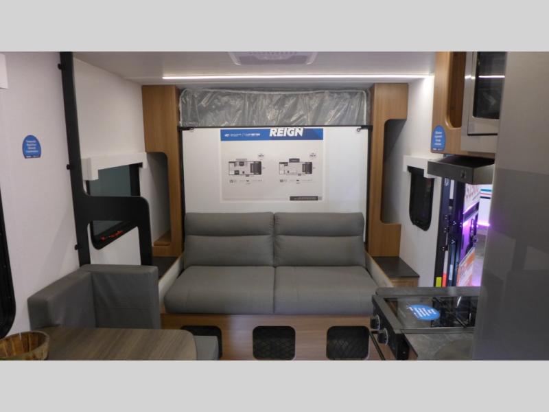 The Reign travel trailers by Keystone are premium single-axle units that are sure to make an impression at the campground. Each one is built with an exclusive automotive-finished aluminum exterior, a walkable roof, and a 100% composite floor for added durability. There are also tinted safety glass windows, quick drop stabilizer jacks, and an exterior shower with hot and cold water. The European inspired interior design is unique and cozy, and the 78" interior height will give you plenty of space to move about. You will also enjoy the ultra bright LED light strip and solid surface countertops in the kitchen, along with blackout night shades, and many more interior comforts.