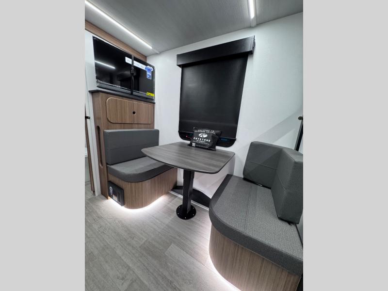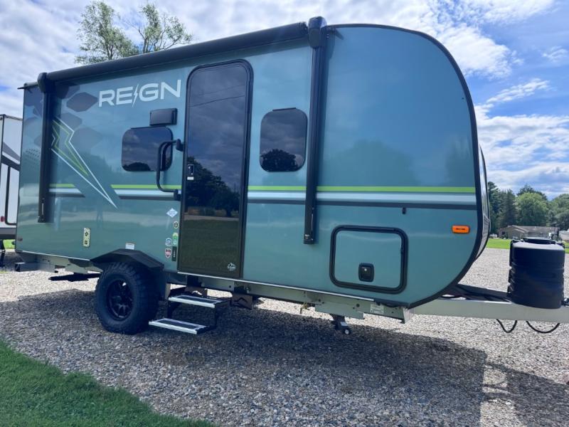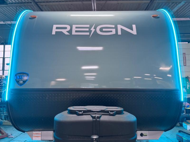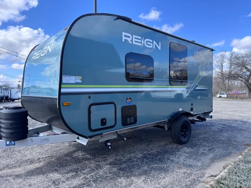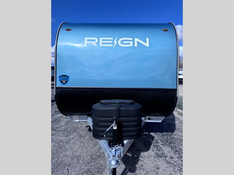 The Reign travel trailers by Keystone are premium single-axle units that are sure to make an impression at the campground. Each one is built with an exclusive automotive-finished aluminum exterior, a walkable roof, and a 100% composite floor for added durability. There are also tinted safety glass windows, quick drop stabilizer jacks, and an exterior shower with hot and cold water. The European inspired interior design is unique and cozy, and the 78" interior height will give you plenty of space to move about. You will also enjoy the ultra bright LED light strip and solid surface countertops in the kitchen, along with blackout night shades, and many more interior comforts.