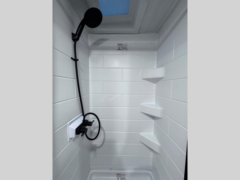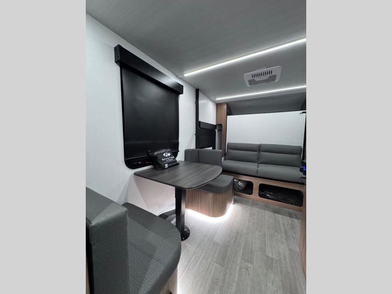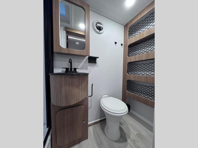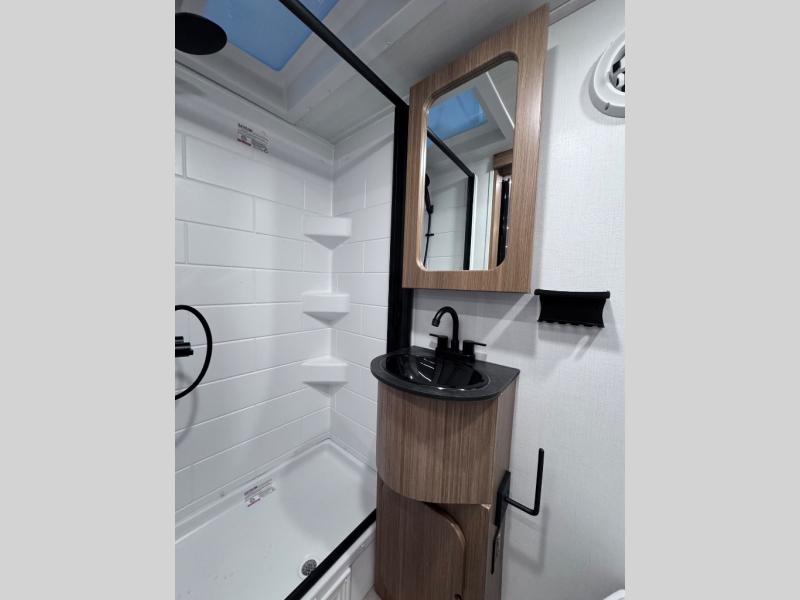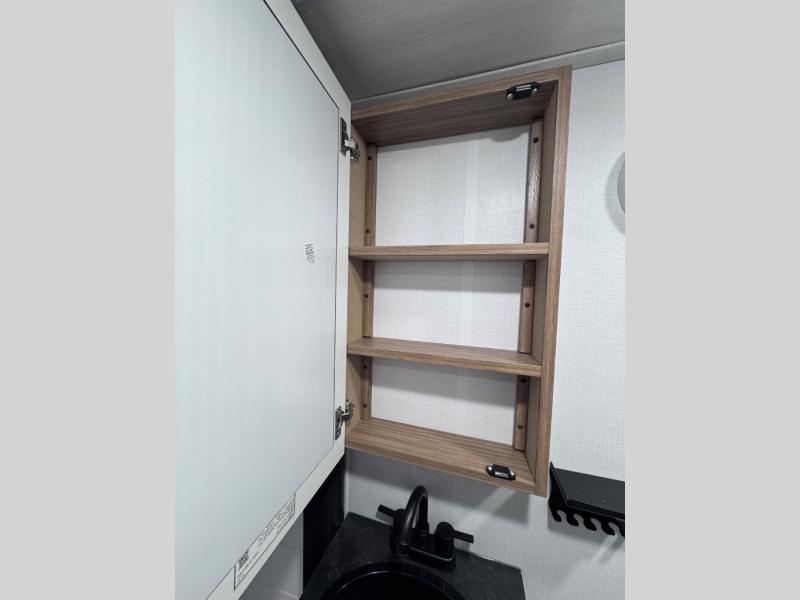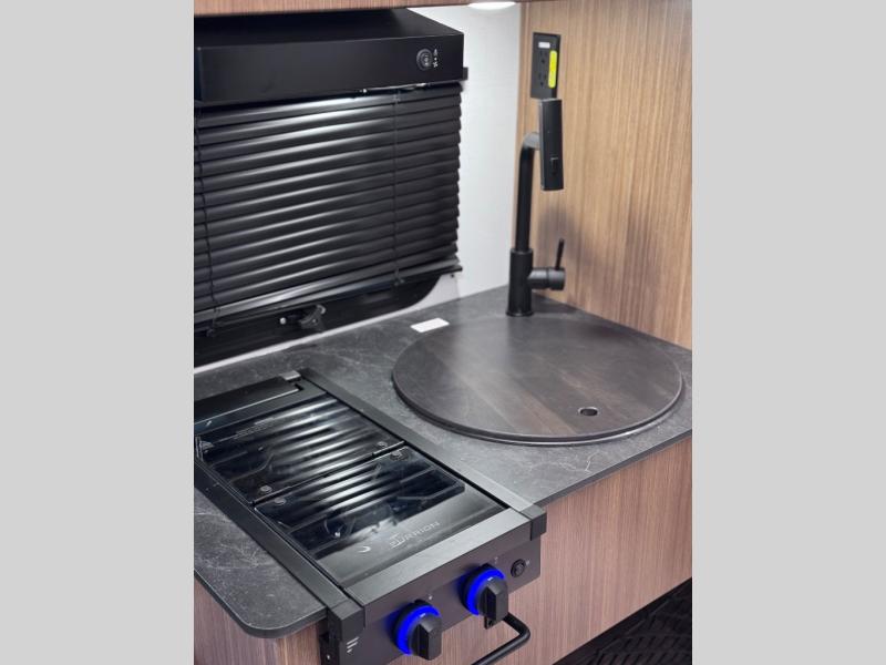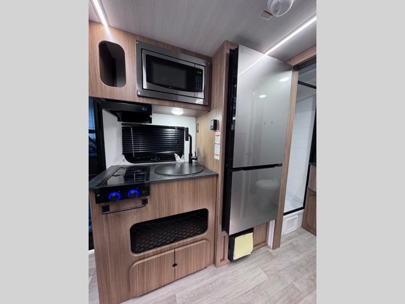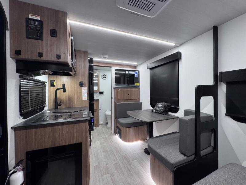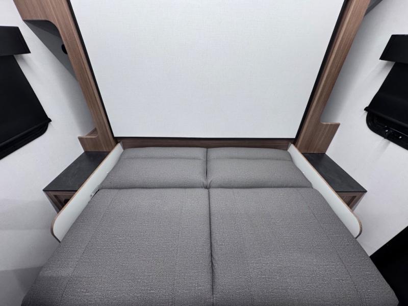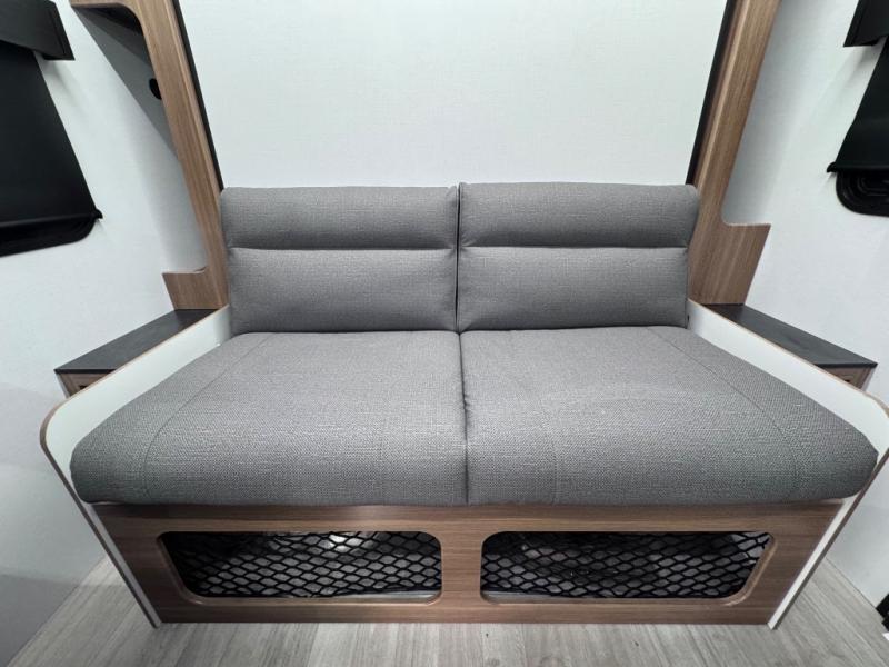 This single axle trailer is both cozy and versatile since there is a fold down sofa/Murphy bed up front! Now you can easily convert seating space into sleeping space, plus there are dual bedside closets to keep your things tidy. A two burner cooktop and air fryer/convection microwave will let you cook meals each day, and a booth dinette provides a place to dine together. You can also choose to add the optional flip-up bunk above the dinette if you need more sleeping space. And don't overlook the full rear bath that will allow you to freshen up without having to leave your camper!