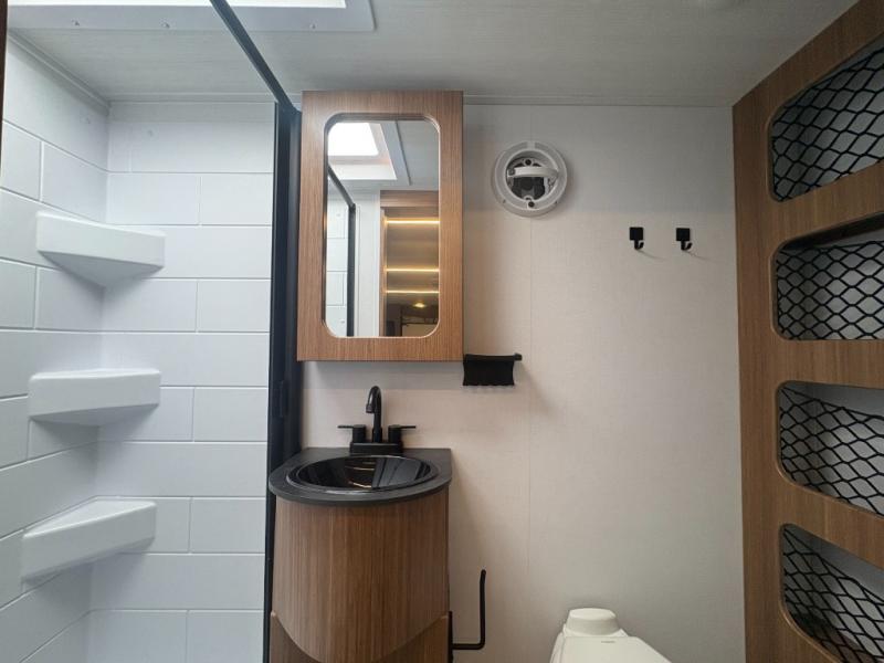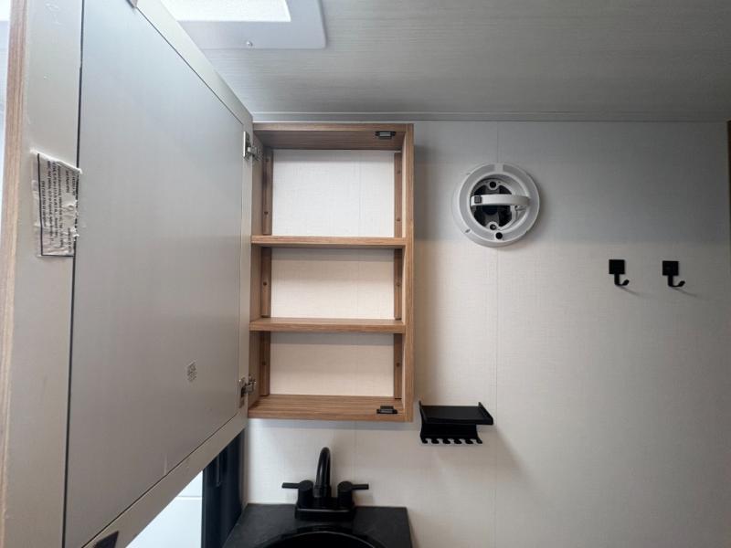 Rear full bath with shower, toilet, vanity, and storage for towels and toiletries