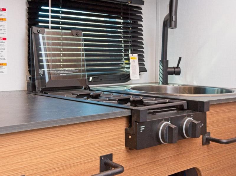 - Appliances: Includes an air fryer/convection/microwave and a two-burner gas range with a glass cover for versatile cooking.