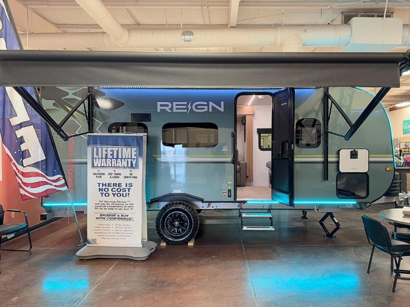 The Reign travel trailers by Keystone are premium single-axle units that are sure to make an impression at the campground. Each one is built with an exclusive automotive-finished aluminum exterior, a walkable roof, and a 100% composite floor for added durability. There are also tinted safety glass windows, quick drop stabilizer jacks, and an exterior shower with hot and cold water. The European inspired interior design is unique and cozy, and the 78" interior height will give you plenty of space to move about. You will also enjoy the ultra bright LED light strip and solid surface countertops in the kitchen, along with blackout night shades, and many more interior comforts.