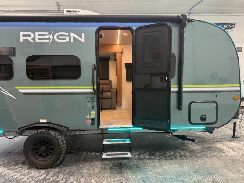 The Reign travel trailers by Keystone are premium single-axle units that are sure to make an impression at the campground. Each one is built with an exclusive automotive-finished aluminum exterior, a walkable roof, and a 100% composite floor for added durability. There are also tinted safety glass windows, quick drop stabilizer jacks, and an exterior shower with hot and cold water. The European inspired interior design is unique and cozy, and the 78" interior height will give you plenty of space to move about. You will also enjoy the ultra bright LED light strip and solid surface countertops in the kitchen, along with blackout night shades, and many more interior comforts.