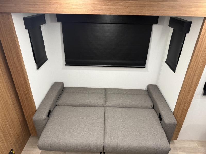 This single axle trailer is both cozy and versatile since there is a fold down sofa/Murphy bed up front! Now you can easily convert seating space into sleeping space, plus there are dual bedside closets to keep your things tidy. A two burner cooktop and air fryer/convection microwave will let you cook meals each day, and there is a huge countertop plus a flip-up extension for even more prep space. This unit also includes a theater dinette where you can relax each day, and the fireplace is sure to make your space feel like home!