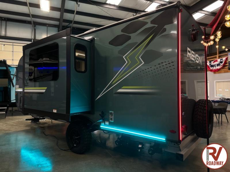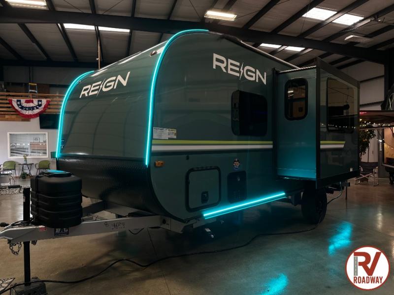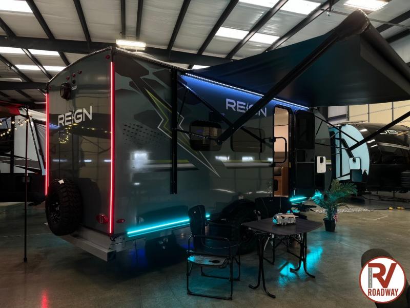 The Reign travel trailers by Keystone are premium single-axle units that are sure to make an impression at the campground. Each one is built with an exclusive automotive-finished aluminum exterior, a walkable roof, and a 100% composite floor for added durability. There are also tinted safety glass windows, quick drop stabilizer jacks, and an exterior shower with hot and cold water. The European inspired interior design is unique and cozy, and the 78" interior height will give you plenty of space to move about. You will also enjoy the ultra bright LED light strip and solid surface countertops in the kitchen, along with blackout night shades, and many more interior comforts.