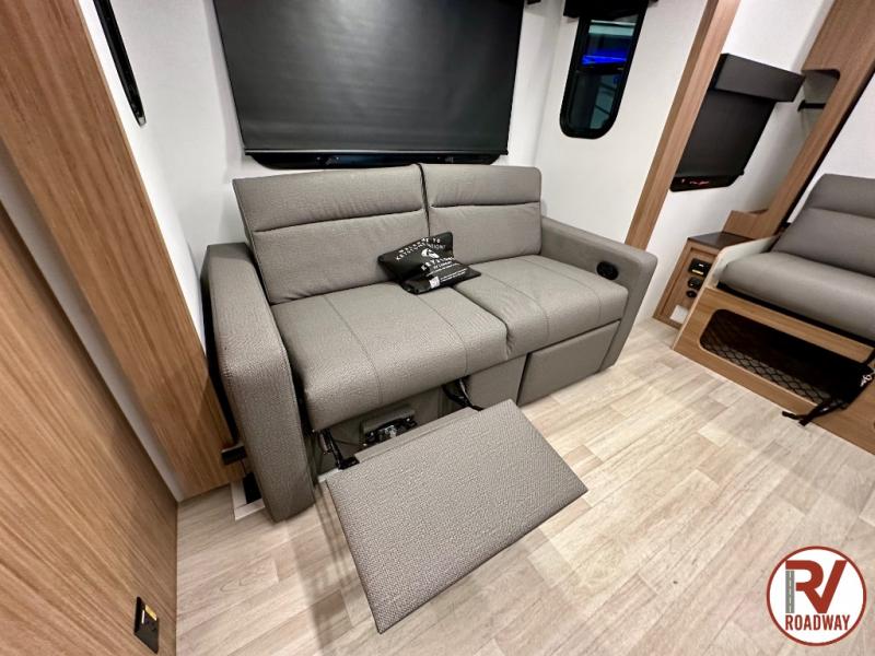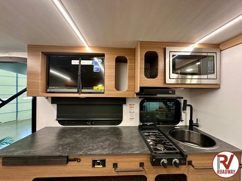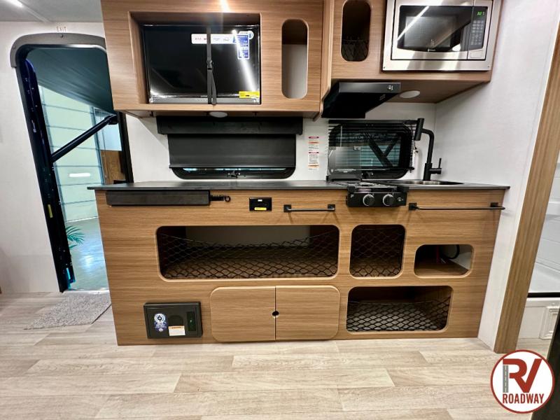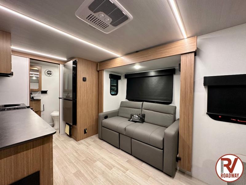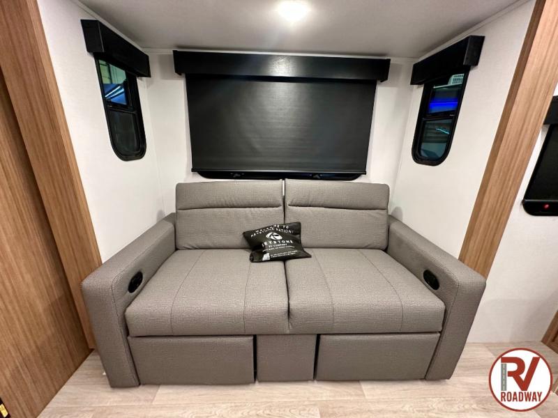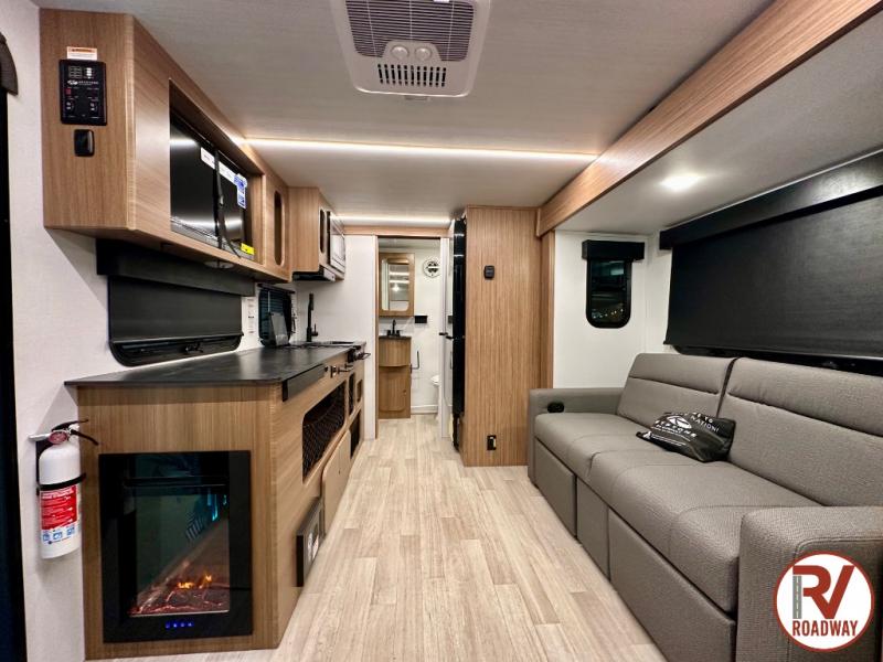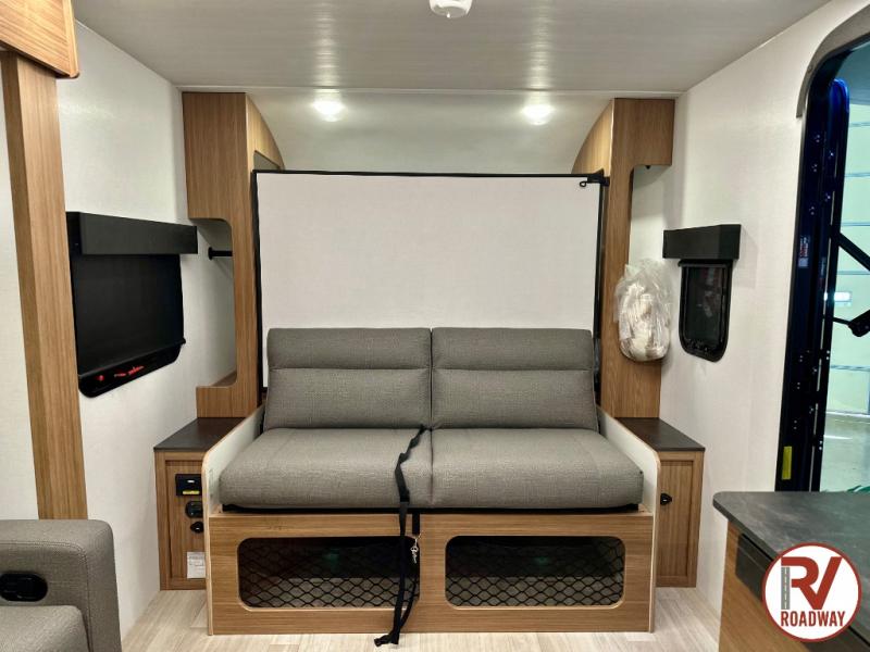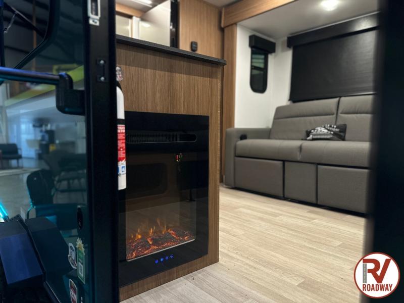 This single axle trailer is both cozy and versatile since there is a fold down sofa/Murphy bed up front! Now you can easily convert seating space into sleeping space, plus there are dual bedside closets to keep your things tidy. A two burner cooktop and air fryer/convection microwave will let you cook meals each day, and there is a huge countertop plus a flip-up extension for even more prep space. This unit also includes a theater dinette where you can relax each day, and the fireplace is sure to make your space feel like home!