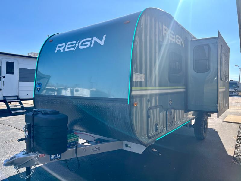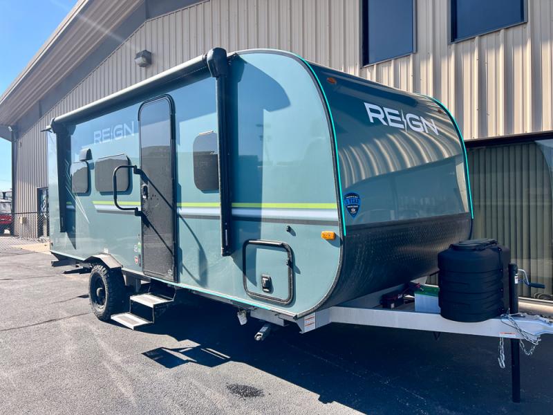 The Reign travel trailers by Keystone are premium single-axle units that are sure to make an impression at the campground. Each one is built with an exclusive automotive-finished aluminum exterior, a walkable roof, and a 100% composite floor for added durability. There are also tinted safety glass windows, quick drop stabilizer jacks, and an exterior shower with hot and cold water. The European inspired interior design is unique and cozy, and the 78" interior height will give you plenty of space to move about. You will also enjoy the ultra bright LED light strip and solid surface countertops in the kitchen, along with blackout night shades, and many more interior comforts.