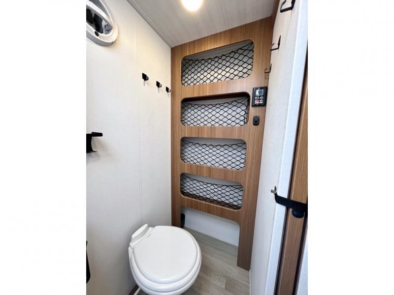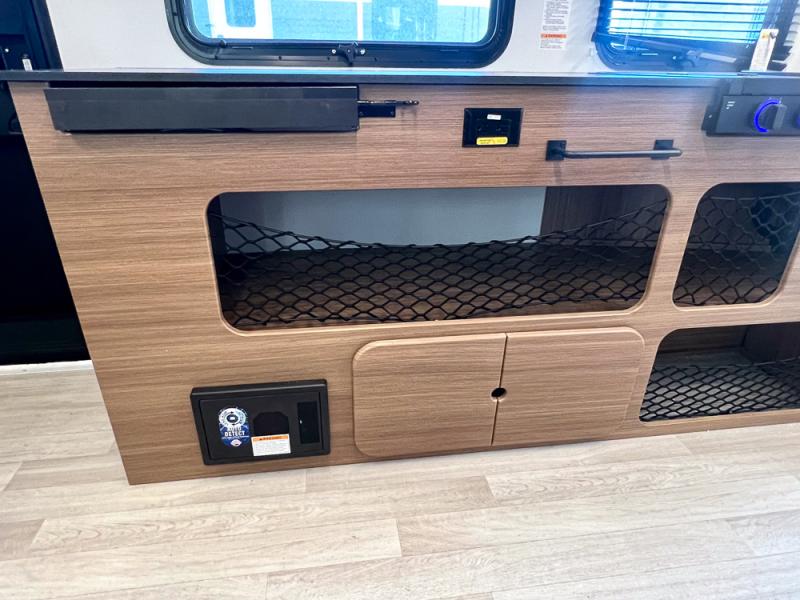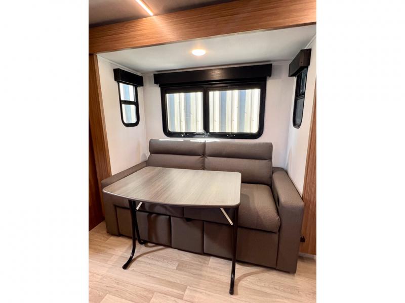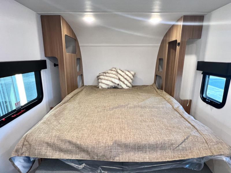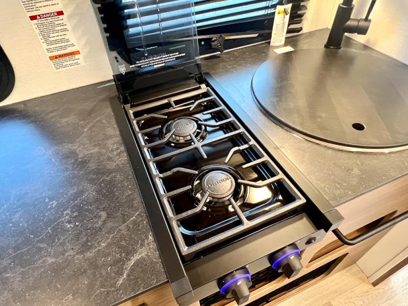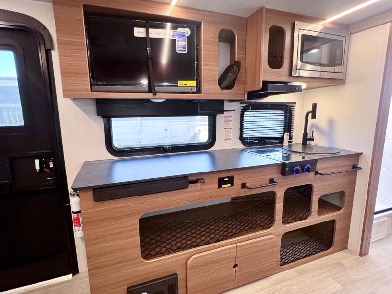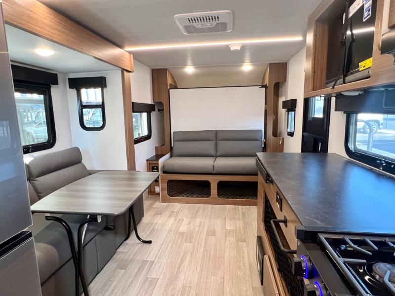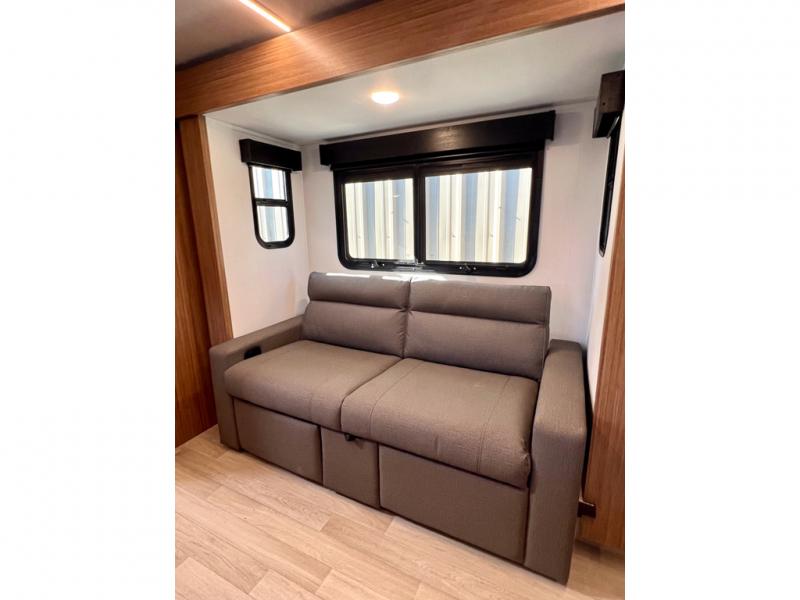 This single axle trailer is both cozy and versatile since there is a fold down sofa/Murphy bed up front! Now you can easily convert seating space into sleeping space, plus there are dual bedside closets to keep your things tidy. A two burner cooktop and air fryer/convection microwave will let you cook meals each day, and there is a huge countertop plus a flip-up extension for even more prep space. This unit also includes a theater dinette where you can relax each day, and the fireplace is sure to make your space feel like home!