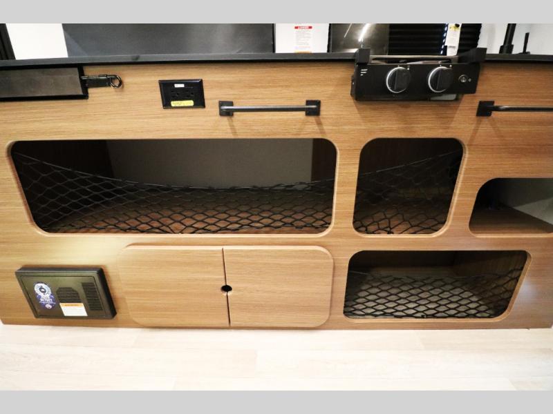 - Dedicated trash can storage and knife block behind the range