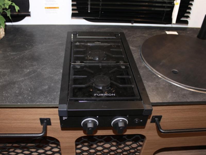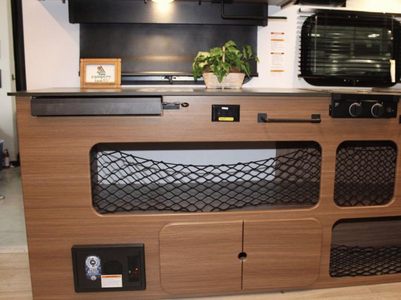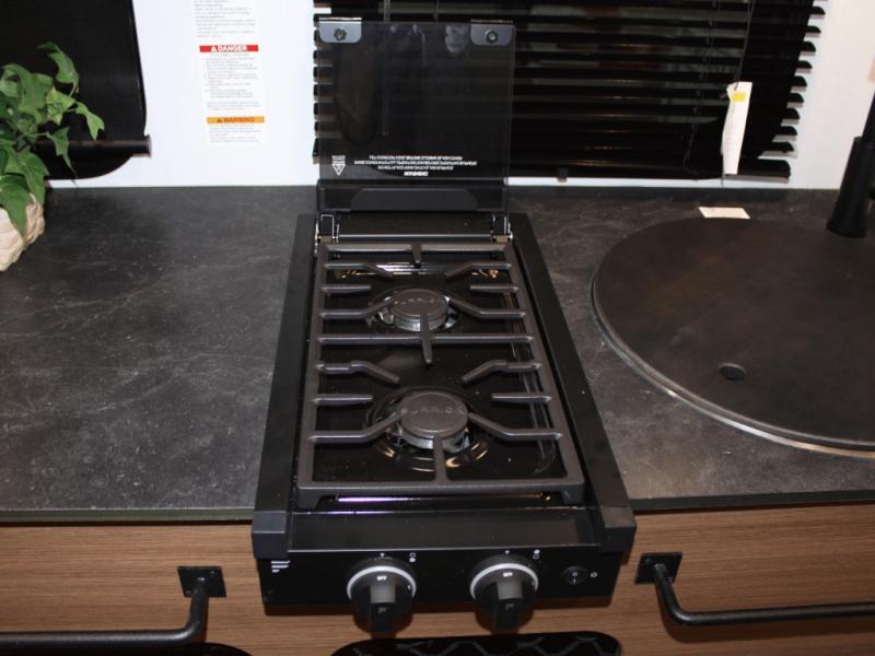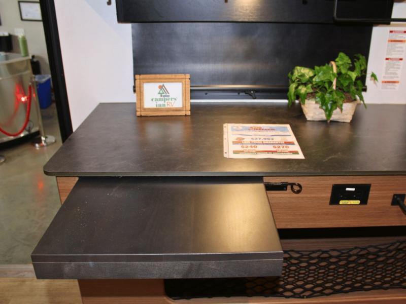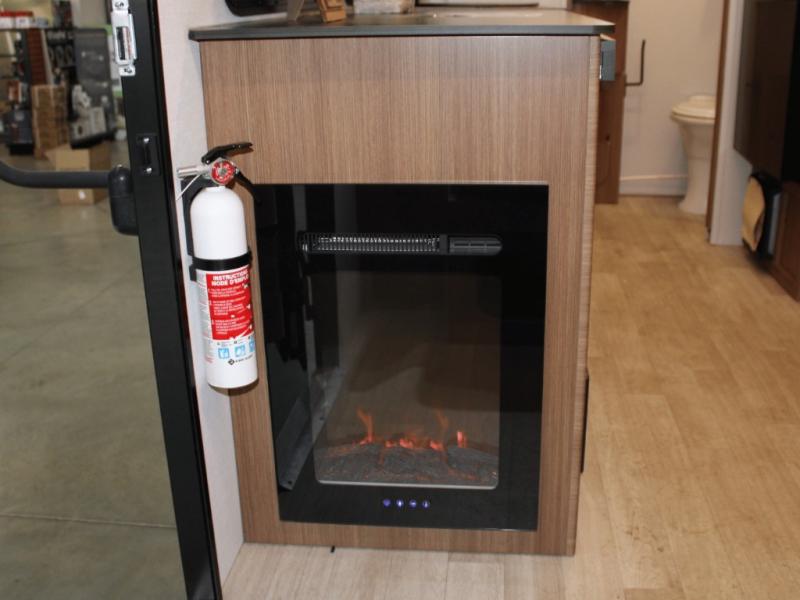 Cooking on the road has never been easier with the two-burner cooktop and air fryer/convection microwave, letting you whip up delicious meals anytime. The kitchen boasts a huge countertop plus a handy flip-up extension for even more prep space, perfect for both quick snacks and full dinners. Unwind at the theater dinette after a day of adventure, and enjoy the warmth and ambiance of the built-in fireplace that truly makes this space feel like home.