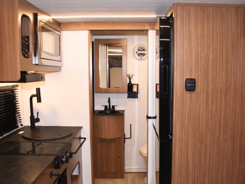 Built for durability and style, the Reign series stands out with its automotive-finished aluminum exterior, a walkable roof, and a 100% composite floor that offers long-lasting strength. Safety and convenience come standard with tinted safety glass windows, quick drop stabilizer jacks, and an exterior shower with hot and cold water — perfect for rinsing off after a day outdoors. The European-inspired interior design is not only unique but also maximizes comfort, enhanced by a generous 78-inch interior height that provides plenty of room to move freely.