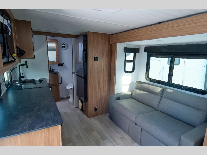 This single axle trailer is both cozy and versatile since there is a fold down sofa/Murphy bed up front! Now you can easily convert seating space into sleeping space, plus there are dual bedside closets to keep your things tidy. A two burner cooktop and air fryer/convection microwave will let you cook meals each day, and there is a huge countertop plus a flip-up extension for even more prep space. This unit also includes a theater dinette where you can relax each day, and the fireplace is sure to make your space feel like home!