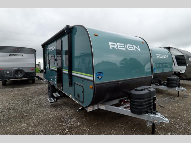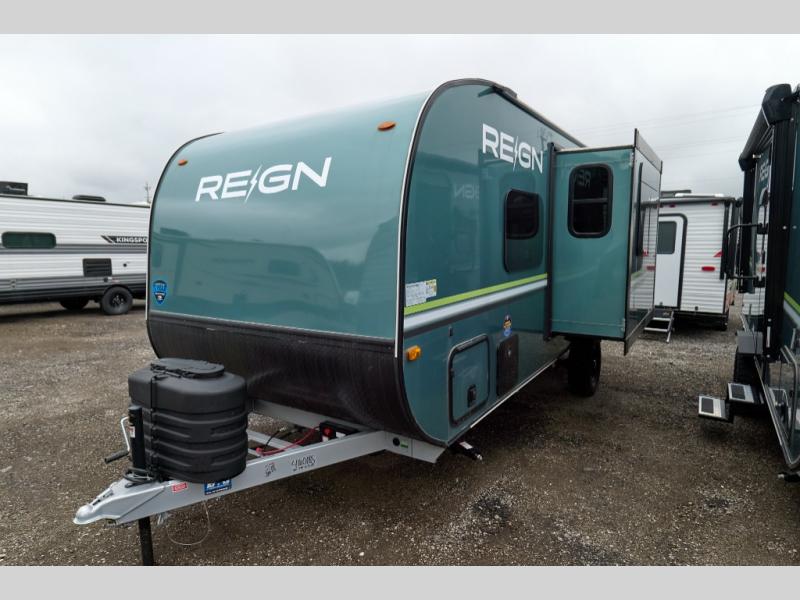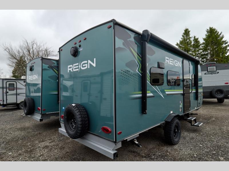 The Reign travel trailers by Keystone are premium single-axle units that are sure to make an impression at the campground. Each one is built with an exclusive automotive-finished aluminum exterior, a walkable roof, and a 100% composite floor for added durability. There are also tinted safety glass windows, quick drop stabilizer jacks, and an exterior shower with hot and cold water. The European inspired interior design is unique and cozy, and the 78" interior height will give you plenty of space to move about. You will also enjoy the ultra bright LED light strip and solid surface countertops in the kitchen, along with blackout night shades, and many more interior comforts.