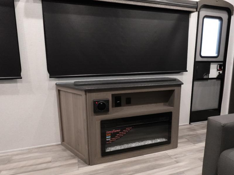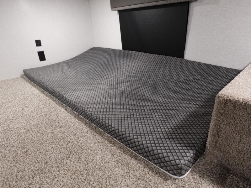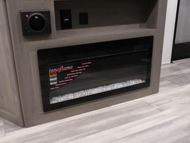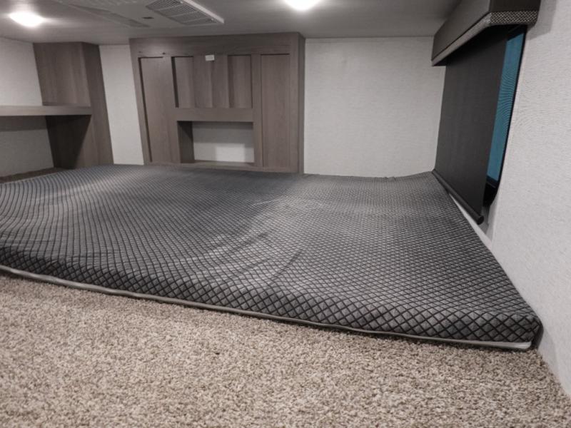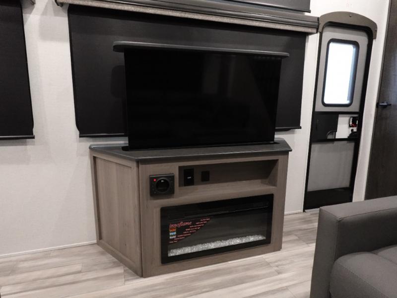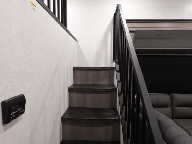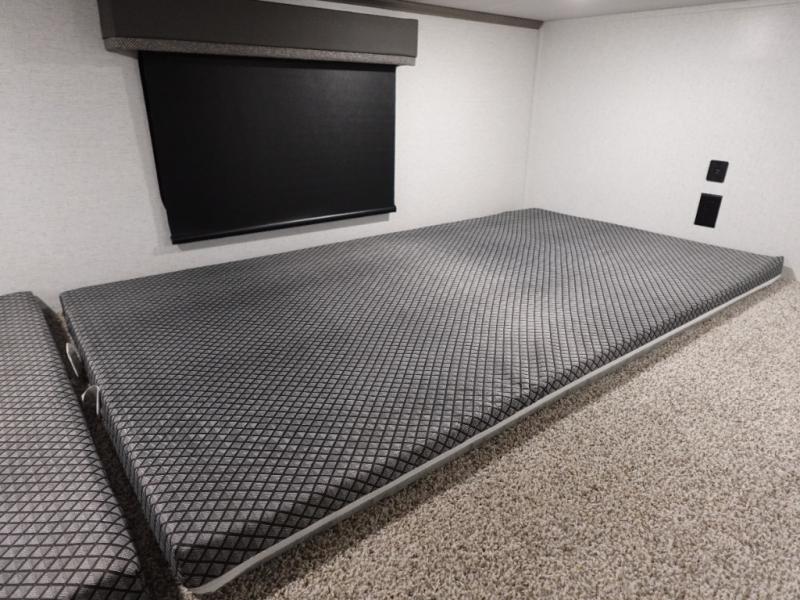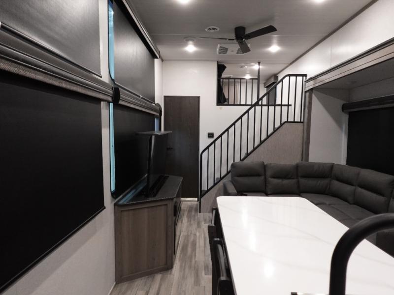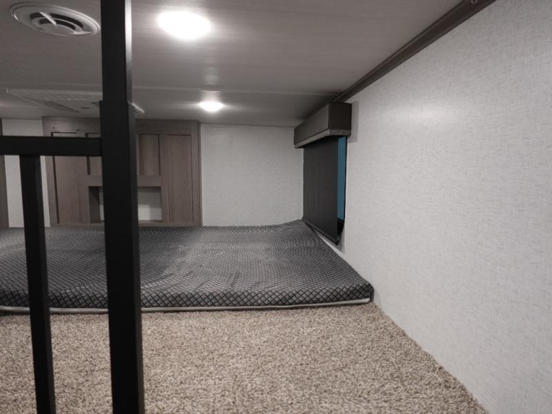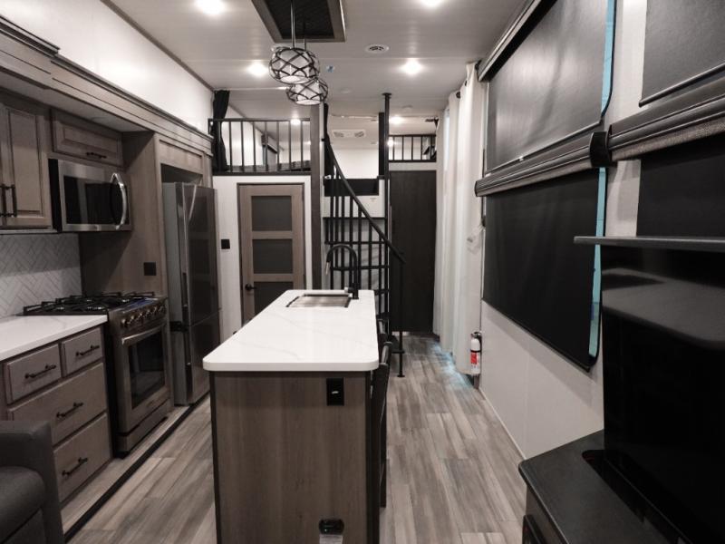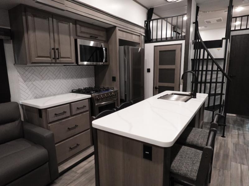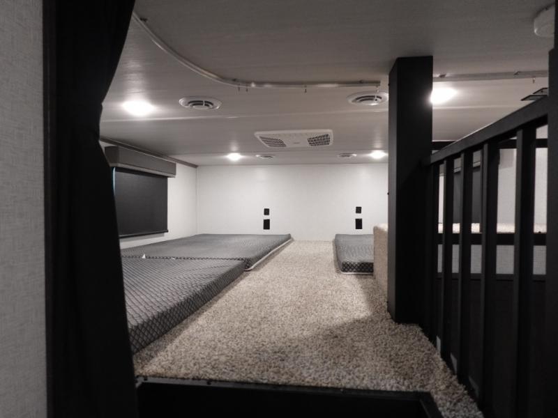 This destination trailer is so accommodating, you may just want to camp all year long! The owners will have the front bedroom all to themselves with a king bed slide out, dresser, and master closet so everything has a place. Above this room is the front loft with stairs that includes three 39" x 74" beds/sleeping spaces and storage shelves, making it perfect for little ones! The spacious full rear bath includes dual bath sinks, a large shower with a seat, and a closet with washer/dryer prep if you want to add these appliances. And just outside the bath, you'll find the second set of stairs that leads to the rear loft with a 54" x 81" bed, an entertainment center, and storage shelves for your guests. During the day, everyone can meet in the combined living area and kitchen that features a large slide for more space, a sectional sofa, a kitchen island with four barstools, plus an entertainment center with a fireplace!