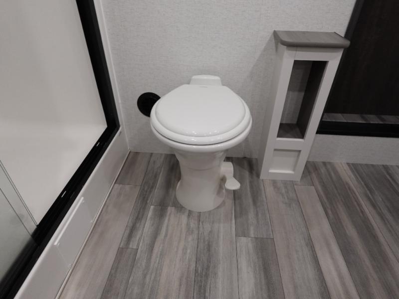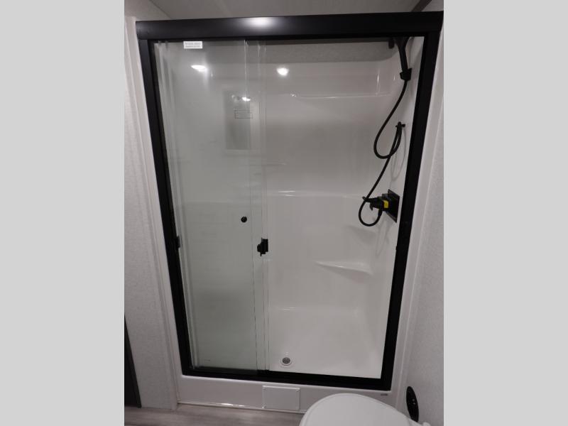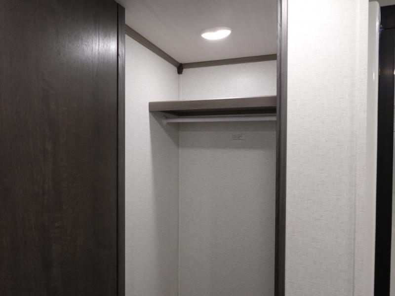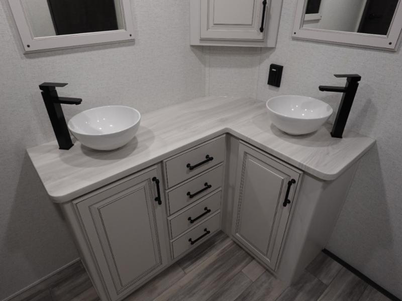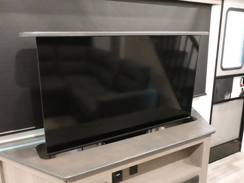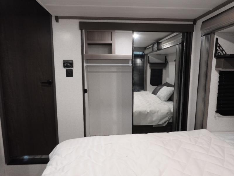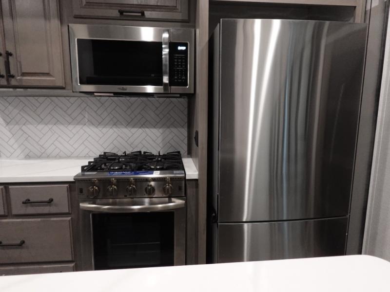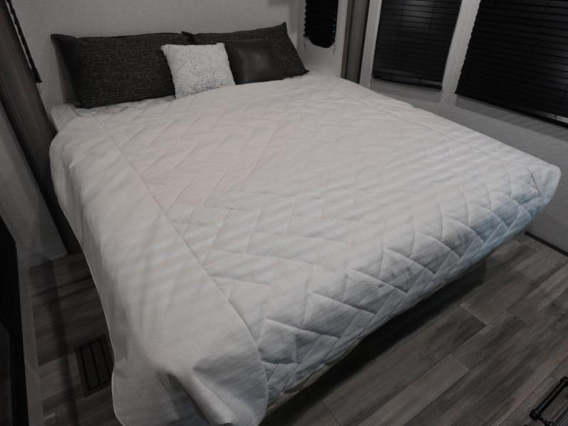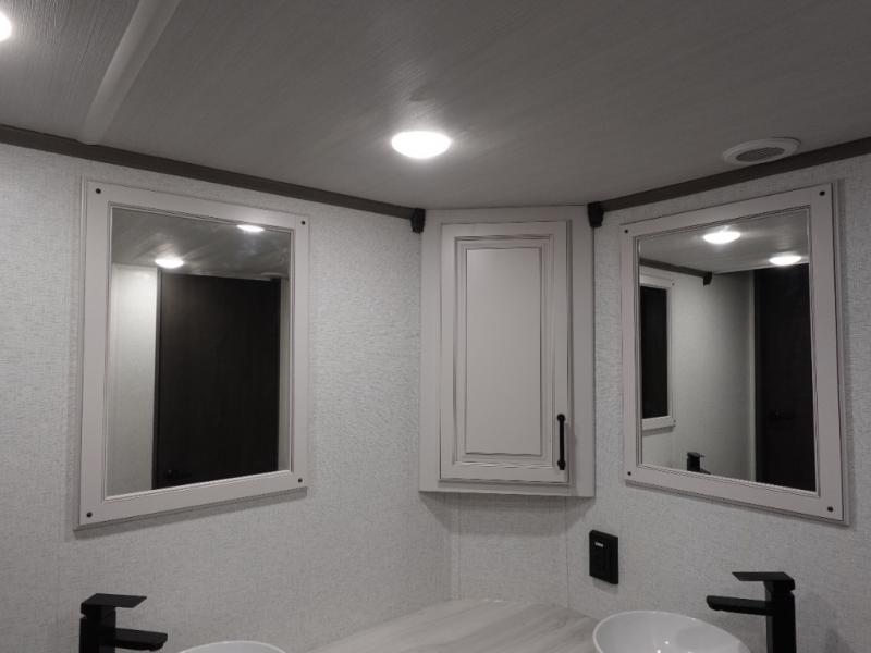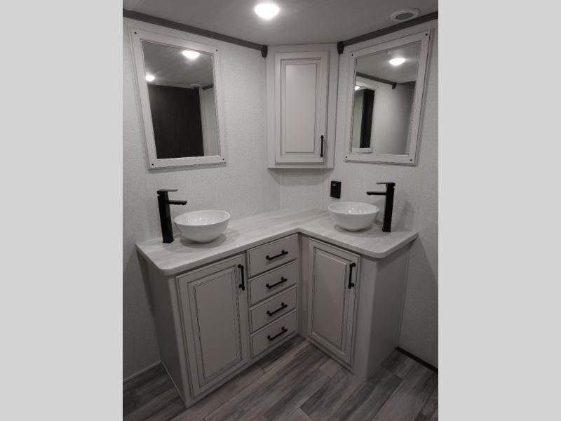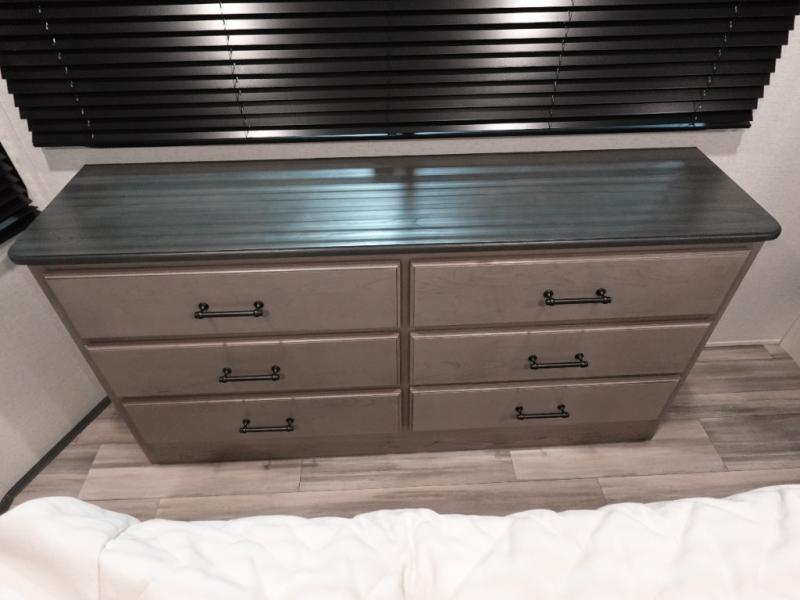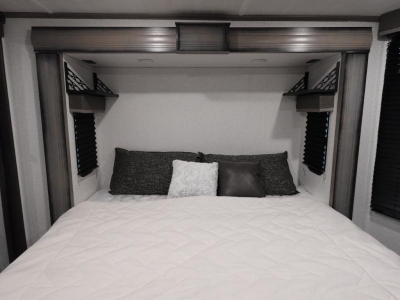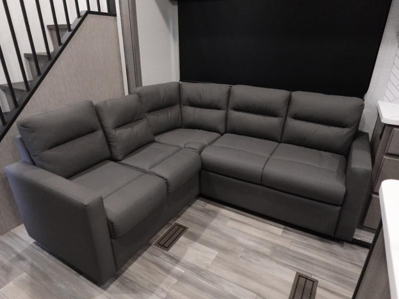 This destination trailer is so accommodating, you may just want to camp all year long! The owners will have the front bedroom all to themselves with a king bed slide out, dresser, and master closet so everything has a place. Above this room is the front loft with stairs that includes three 39" x 74" beds/sleeping spaces and storage shelves, making it perfect for little ones! The spacious full rear bath includes dual bath sinks, a large shower with a seat, and a closet with washer/dryer prep if you want to add these appliances. And just outside the bath, you'll find the second set of stairs that leads to the rear loft with a 54" x 81" bed, an entertainment center, and storage shelves for your guests. During the day, everyone can meet in the combined living area and kitchen that features a large slide for more space, a sectional sofa, a kitchen island with four barstools, plus an entertainment center with a fireplace!