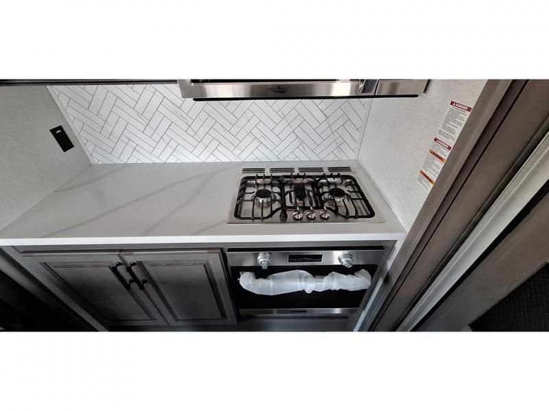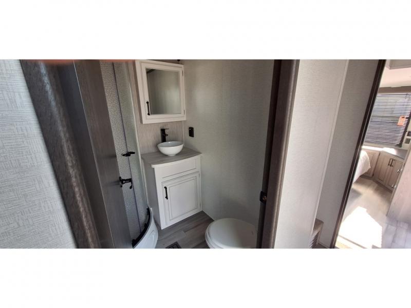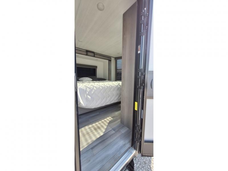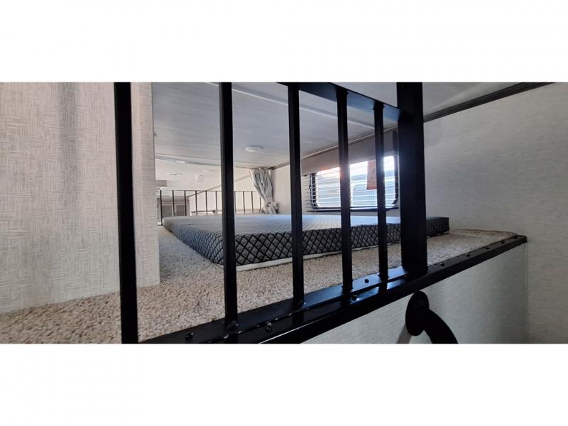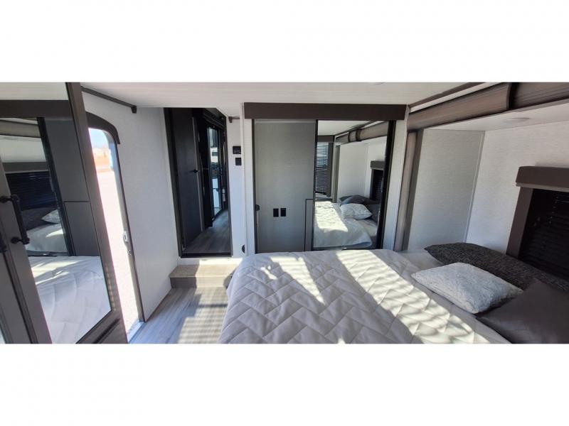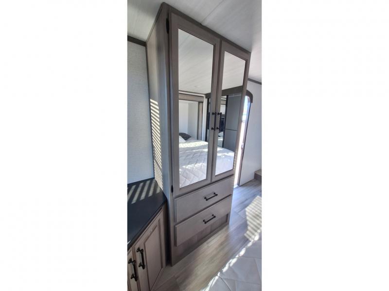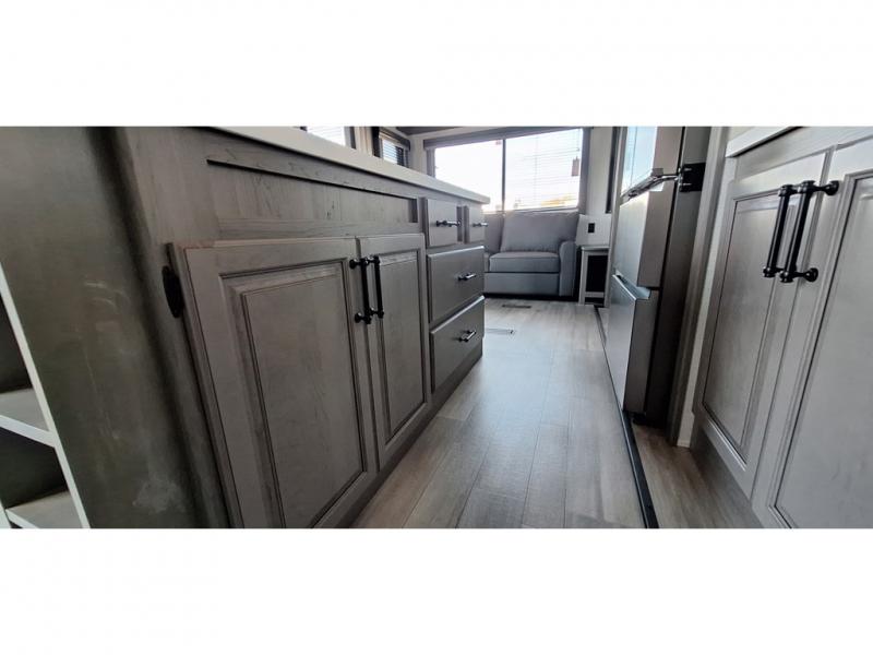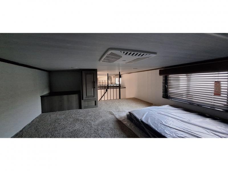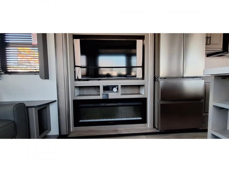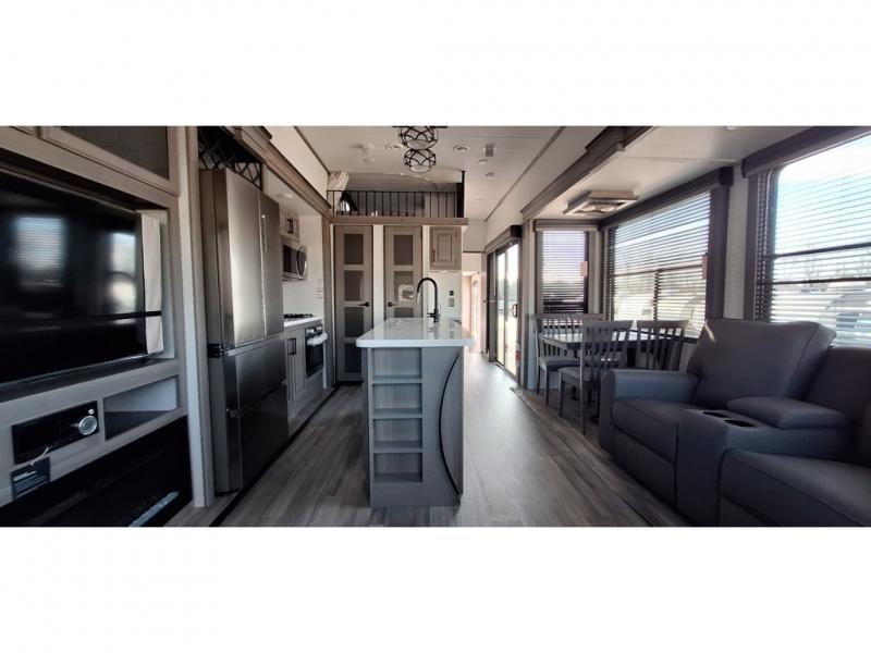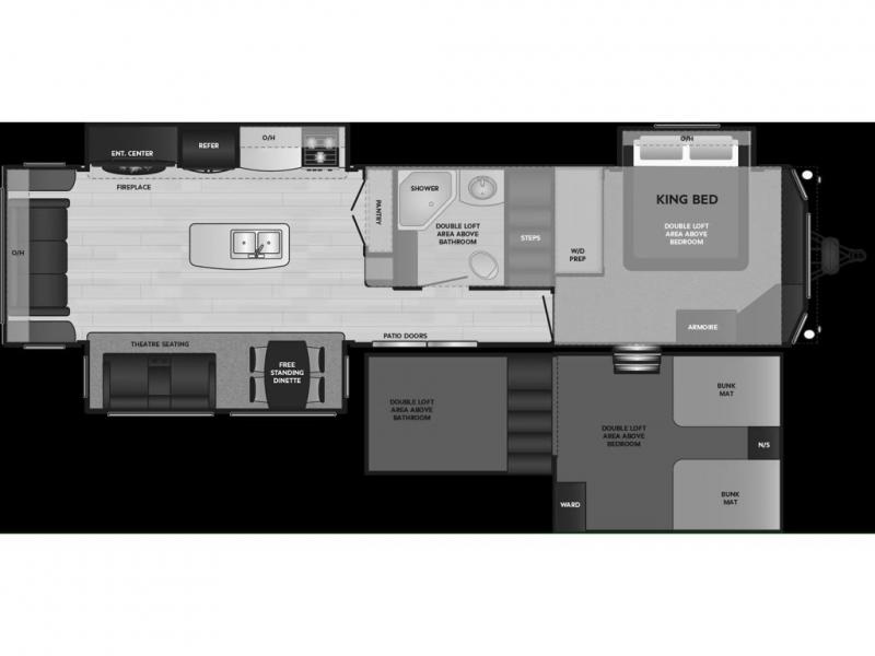 When you decide you have a favorite place to visit, park this Residence in that spot and enjoy your own comfortable accommodations during any season! This triple slide, double loft trailer gives you lots of interior floor space as well as storage and sleeping space for family and friends. There is a loft area above the full bathroom and a second loft area above the front bedroom with stairs to easily access both sides, and you will find two bunk mats, a nightstand and a wardrobe. The bedroom offers a king bed slide, an armoire, and a space prepped for a washer/dryer option. The main living and kitchen area provides dual slides, a kitchen island, a double-door pantry for lots of goody storage, and a four-door refrigerator. The fireplace adds to the coziness as you relax on the sofa, the theatre seats and or at the free-standing dinette.