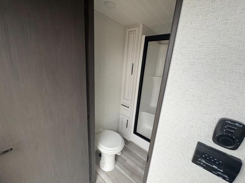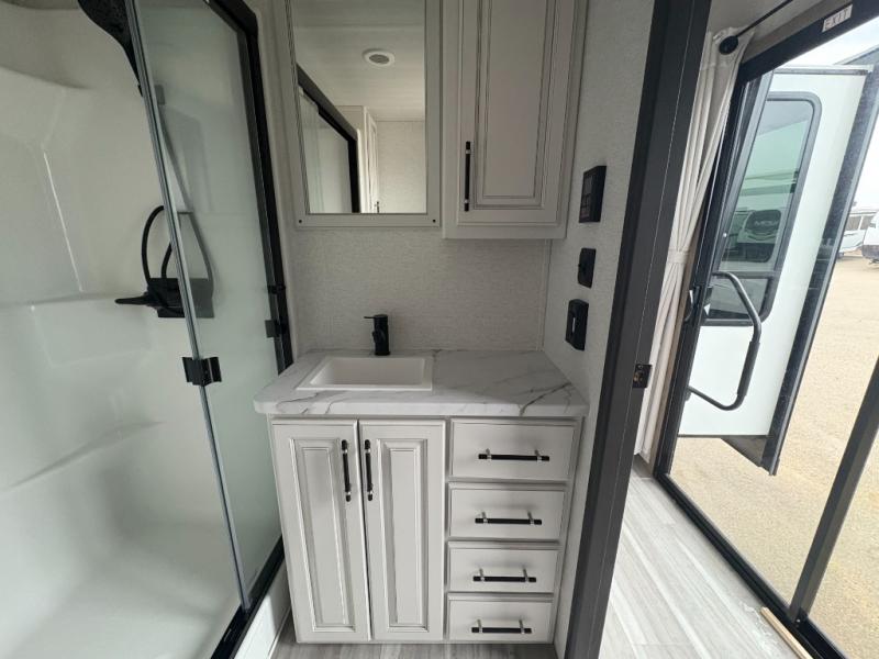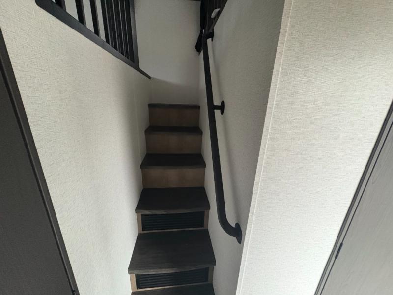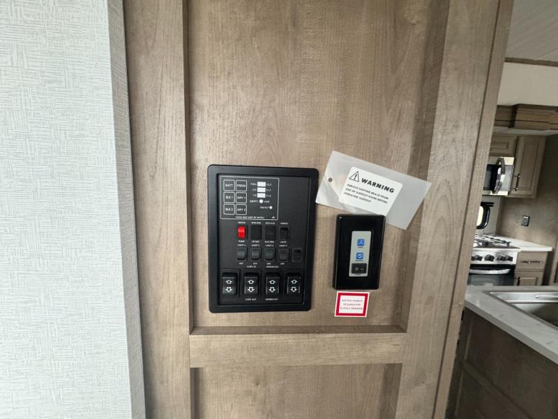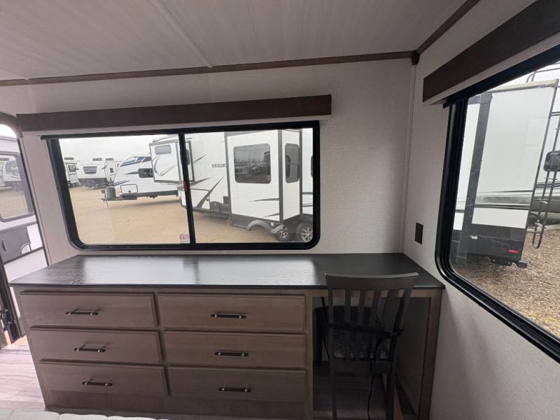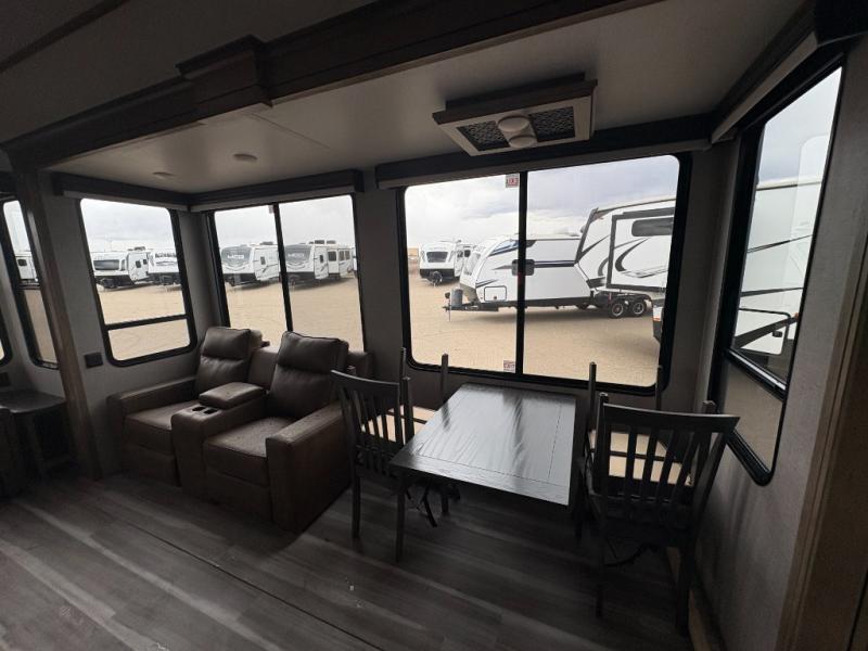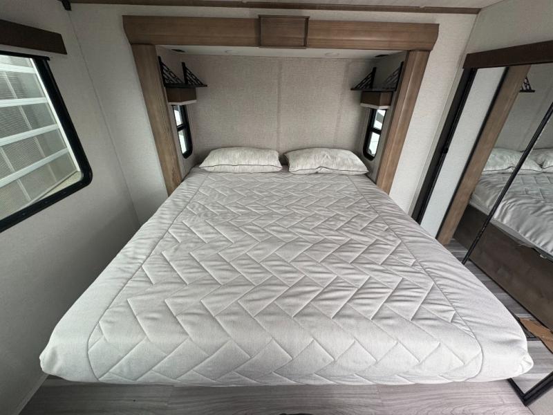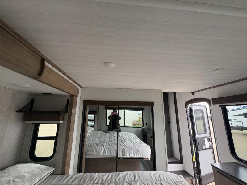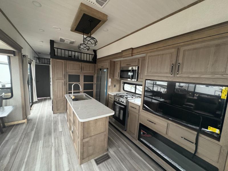 This destination trailer is the ultimate retreat for those who crave luxury and tranquility. The rear loft area is a cozy haven, featuring two plush bunk mats and ample storage for your favorite hobbies and pastimes. The rear bedroom is a serene oasis, complete with king-sized bed, washer and dryer prep, and a spacious closet. The kitchen boasts two spacious pantries, refrigerator, a three-burner cooktop, an entertainment center, kitchen island, and a free-standing dinette. Perfect for whipping up culinary masterpieces or enjoying quiet moments with loved ones. The front living area is designed for relaxation and entertainment, featuring an entertainment center, warm fireplace, pull-out sleeper sofa with convenient tables, and comfortable theater seating. And with two generous awnings - 20' and 11' - you'll enjoy shade and protection in all your activities outside.