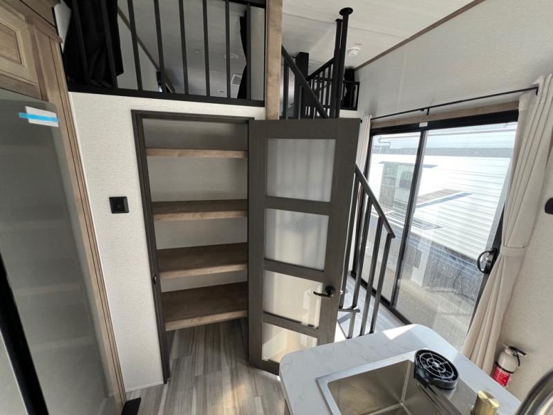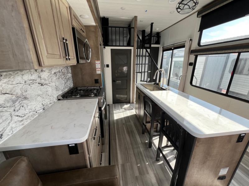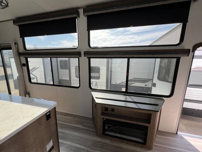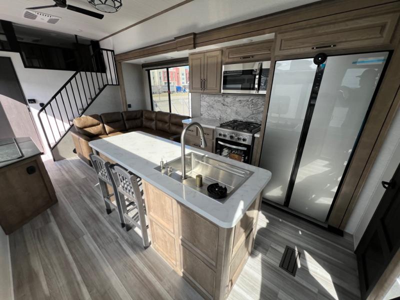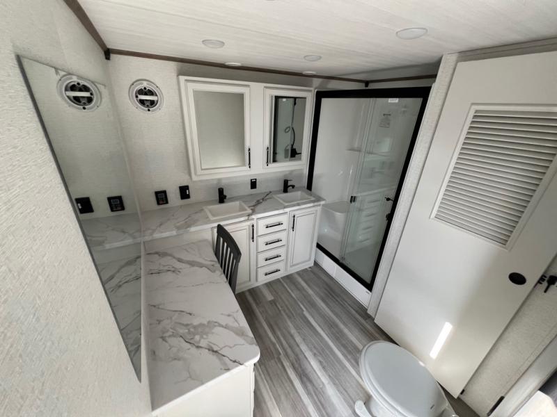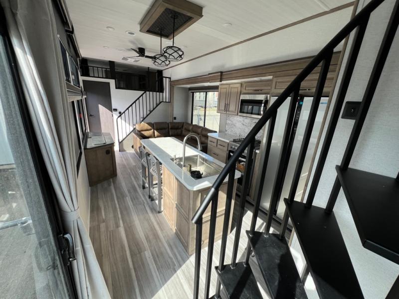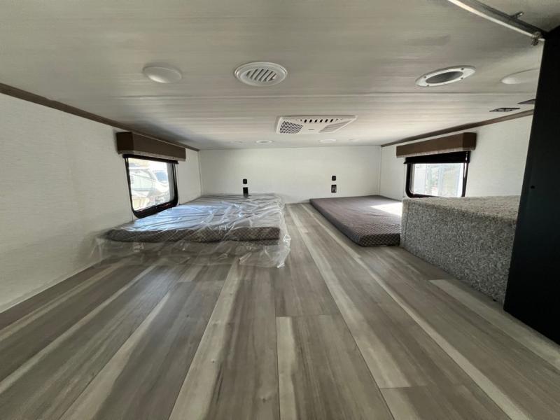 This destination trailer is a home away from home where comfort, relaxation, and entertainment come together in perfect harmony. The rear bathroom is a serene oasis, featuring washer and dryer prep, dual sink, and makeup vanity. Above, the loft area offers a cozy bunk mat, storage shelves, and an entertainment center - perfect for kids or guests. The living area is designed for relaxation and entertainment, featuring a comfortable sectional sofa, entertainment center, and warm fireplace. The kitchen is a gourmet's paradise, boasting a refrigerator, pantry, three-burner cooktop, kitchen island with chairs, and spacious pantry. The front bedroom is a peaceful retreat, complete with a half bath, overhead cabinets, a king bed, a wardrobe, and a dresser. Above, the loft area offers three bunk mats - perfect for kids or guests. Outside, enjoy the shade and protection of our 26' awning and convenient access via two entry/exit doors.