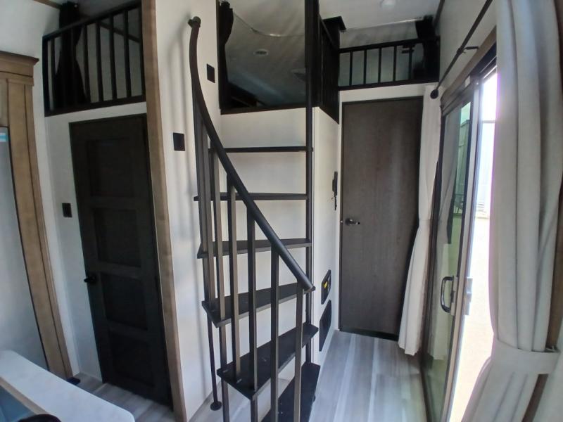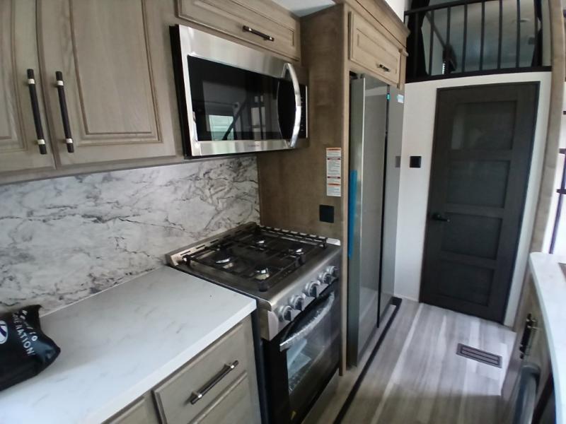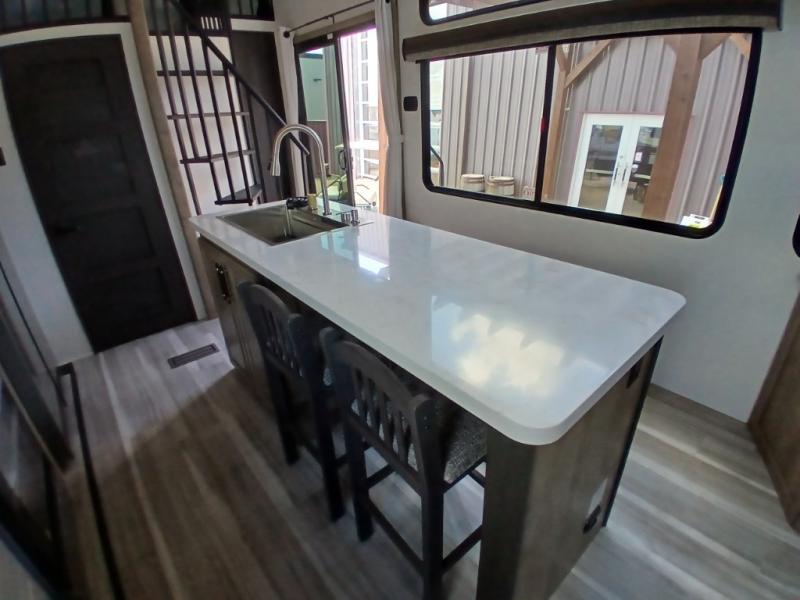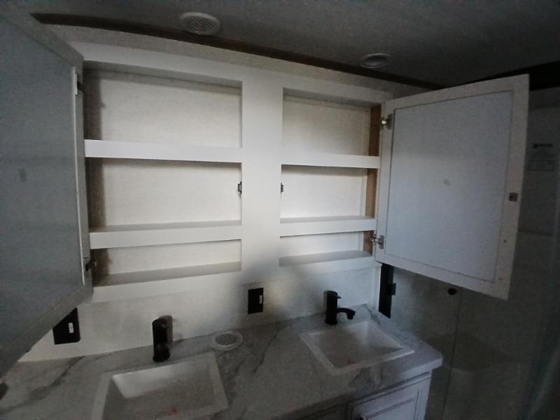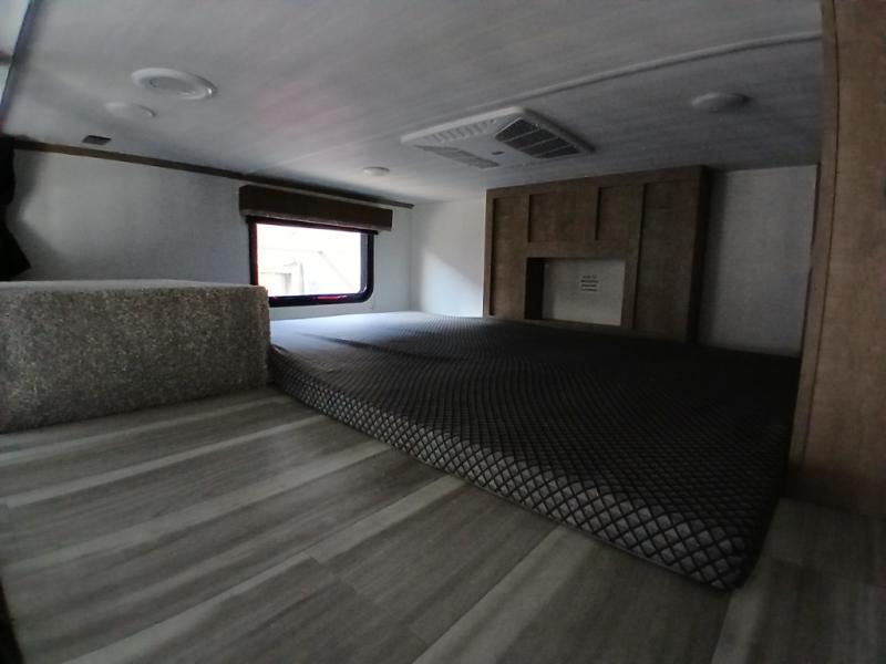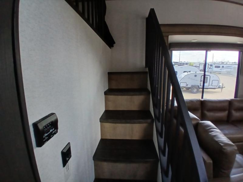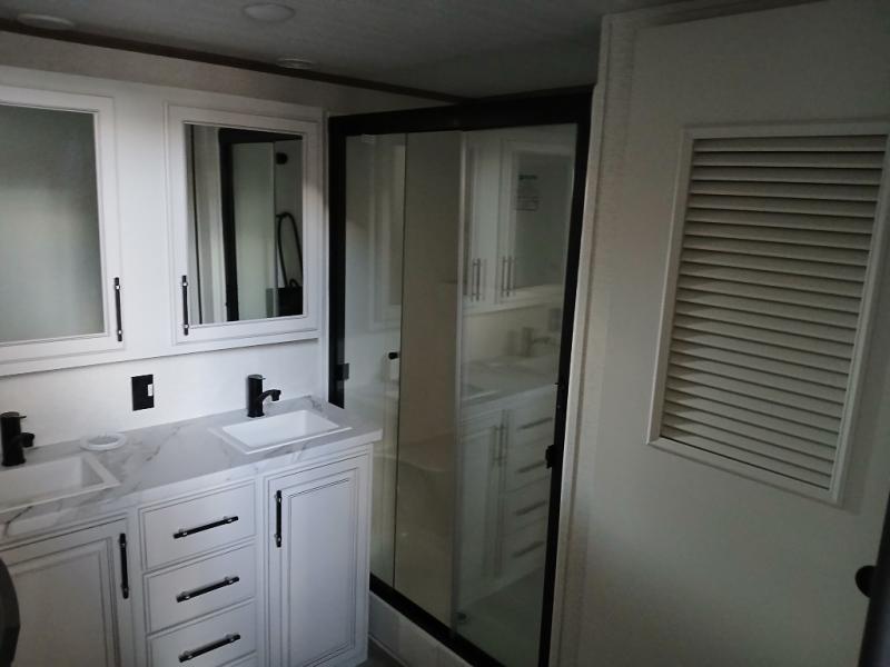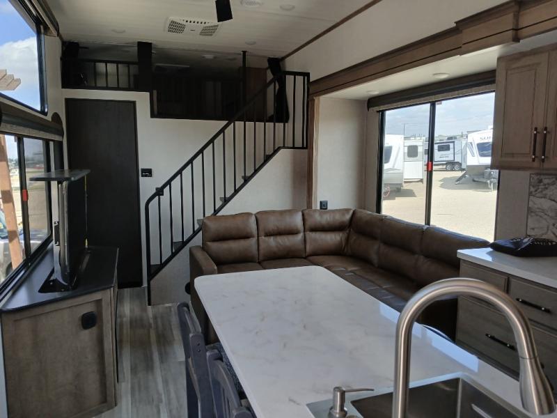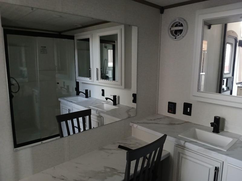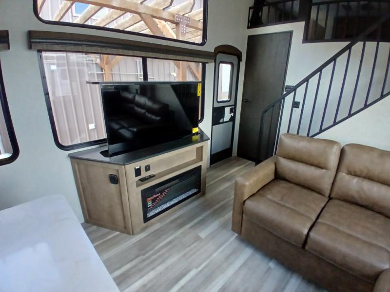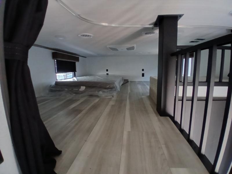 This destination trailer is a home away from home where comfort, relaxation, and entertainment come together in perfect harmony. The rear bathroom is a serene oasis, featuring washer and dryer prep, dual sink, and makeup vanity. Above, the loft area offers a cozy bunk mat, storage shelves, and an entertainment center - perfect for kids or guests. The living area is designed for relaxation and entertainment, featuring a comfortable sectional sofa, entertainment center, and warm fireplace. The kitchen is a gourmet's paradise, boasting a refrigerator, pantry, three-burner cooktop, kitchen island with chairs, and spacious pantry. The front bedroom is a peaceful retreat, complete with a half bath, overhead cabinets, a king bed, a wardrobe, and a dresser. Above, the loft area offers three bunk mats - perfect for kids or guests. Outside, enjoy the shade and protection of our 26' awning and convenient access via two entry/exit doors.