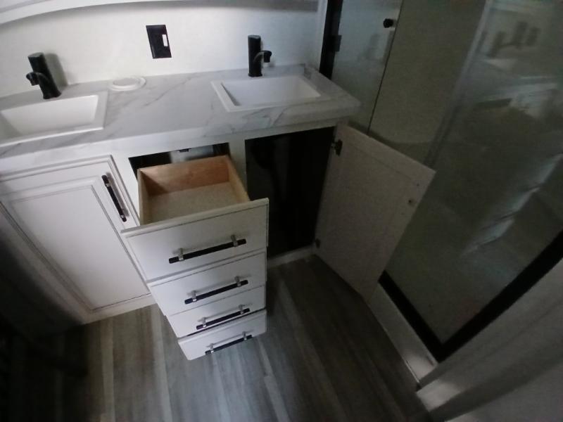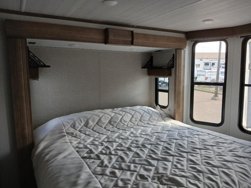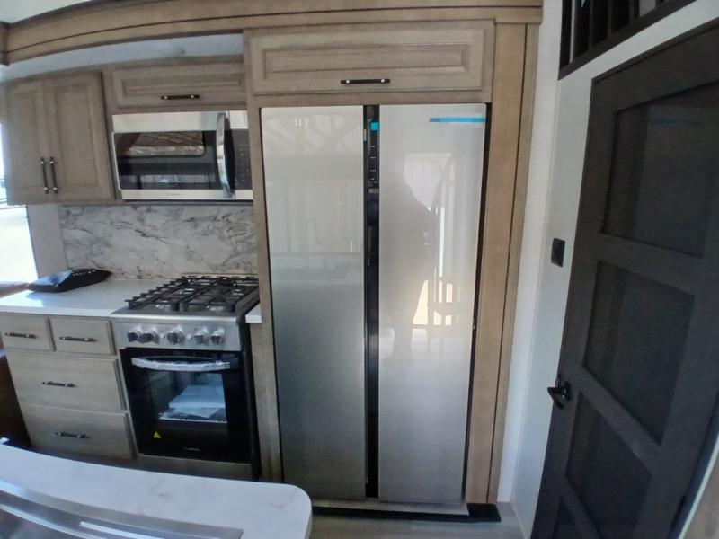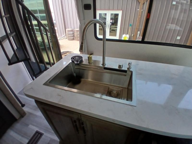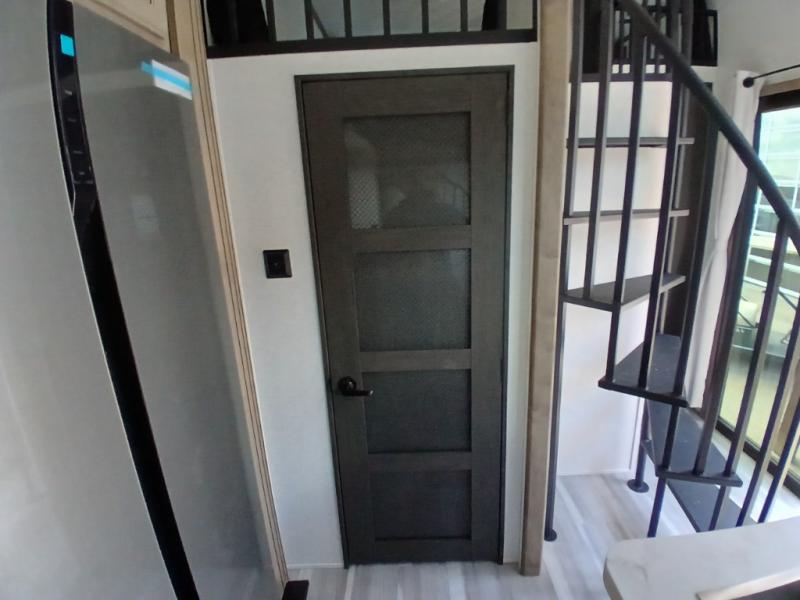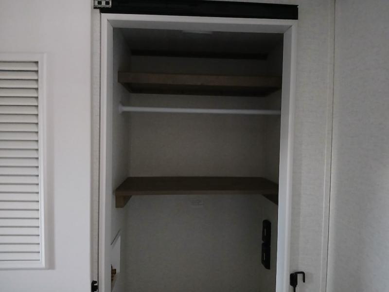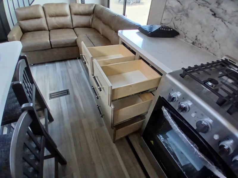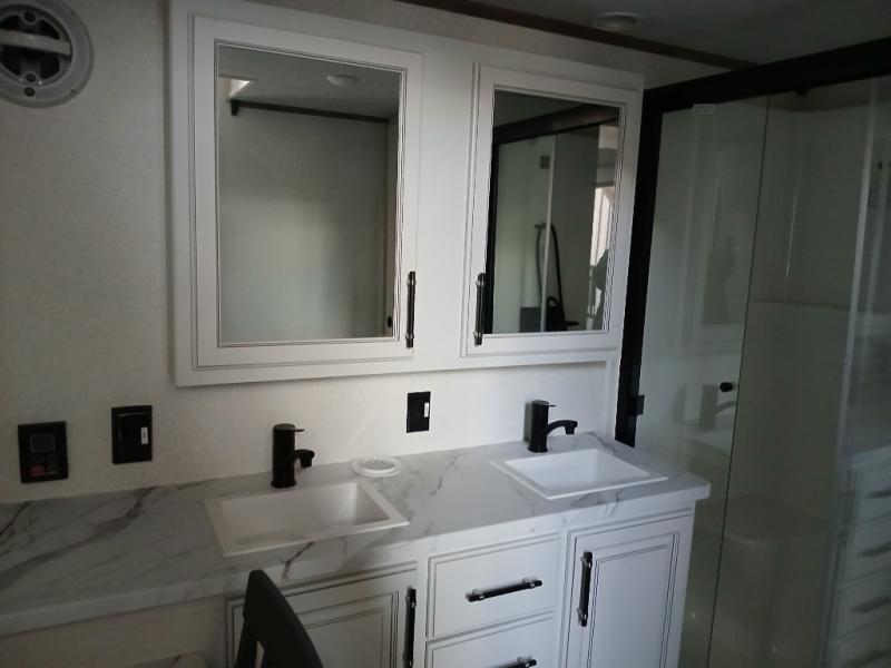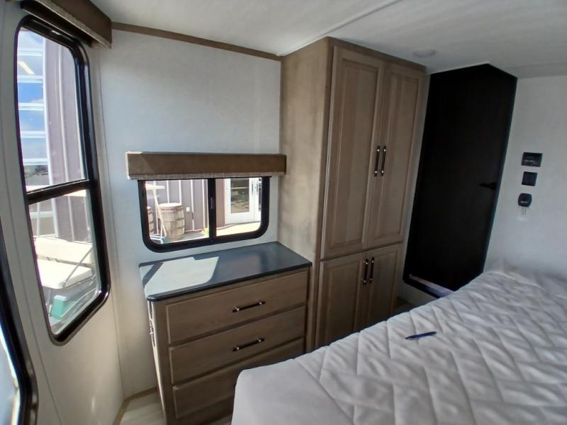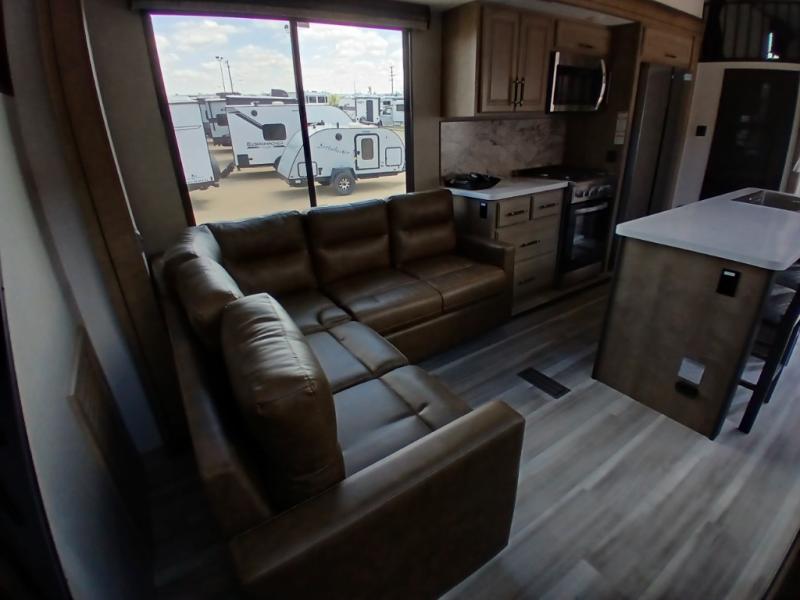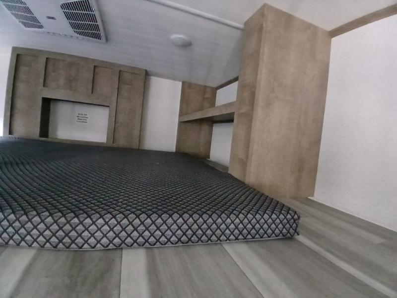 This destination trailer is a home away from home where comfort, relaxation, and entertainment come together in perfect harmony. The rear bathroom is a serene oasis, featuring washer and dryer prep, dual sink, and makeup vanity. Above, the loft area offers a cozy bunk mat, storage shelves, and an entertainment center - perfect for kids or guests. The living area is designed for relaxation and entertainment, featuring a comfortable sectional sofa, entertainment center, and warm fireplace. The kitchen is a gourmet's paradise, boasting a refrigerator, pantry, three-burner cooktop, kitchen island with chairs, and spacious pantry. The front bedroom is a peaceful retreat, complete with a half bath, overhead cabinets, a king bed, a wardrobe, and a dresser. Above, the loft area offers three bunk mats - perfect for kids or guests. Outside, enjoy the shade and protection of our 26' awning and convenient access via two entry/exit doors.