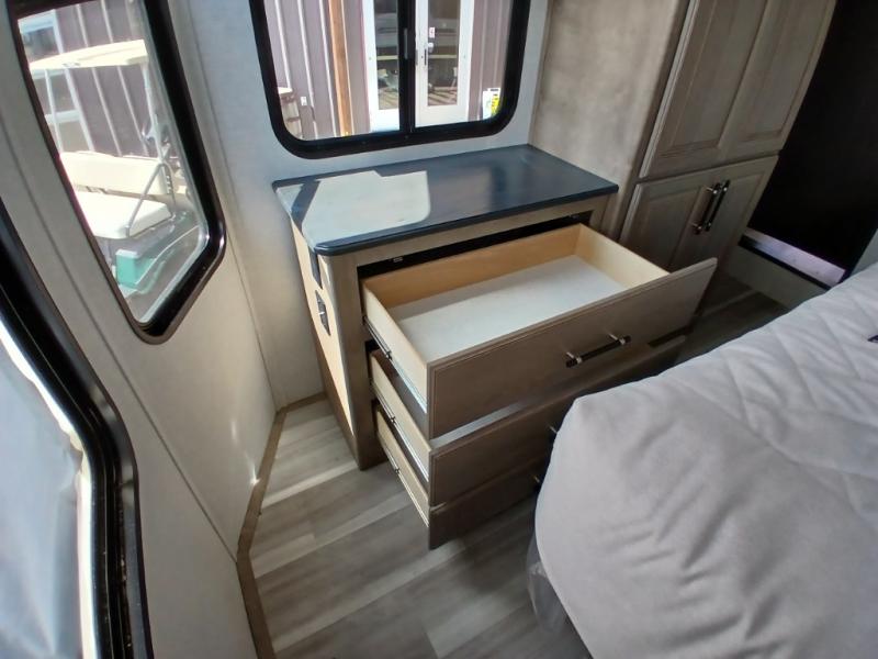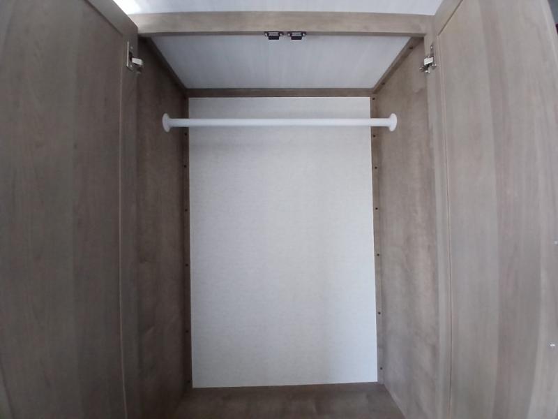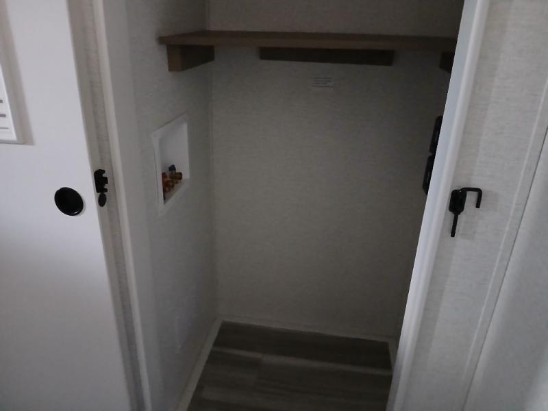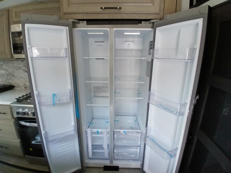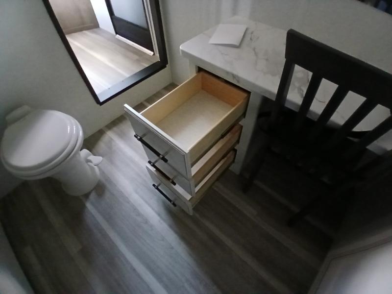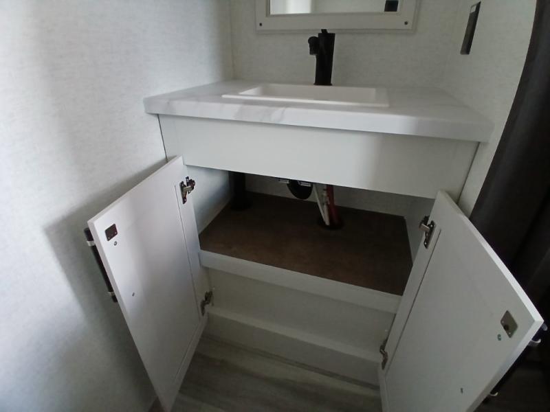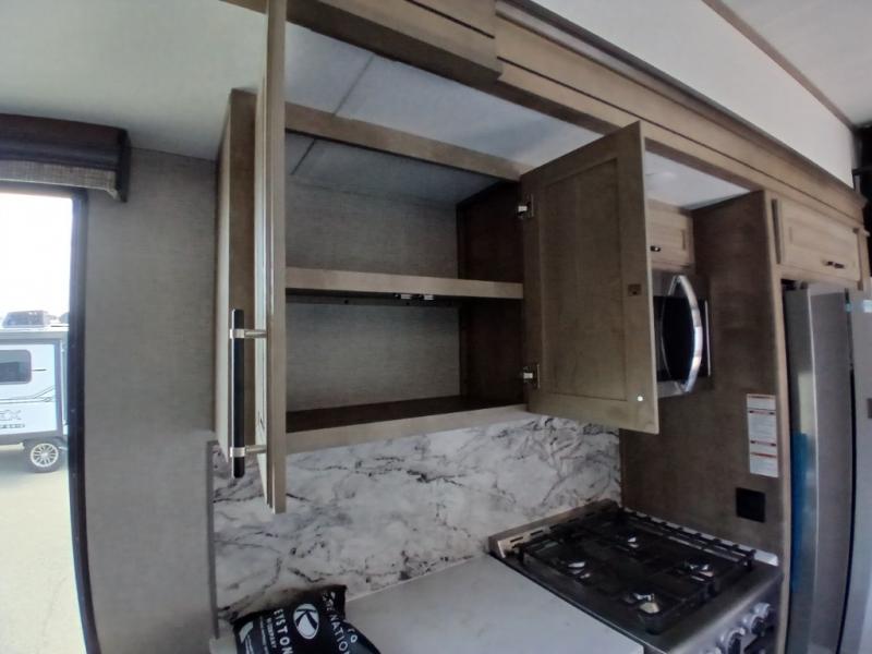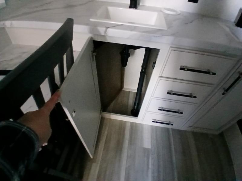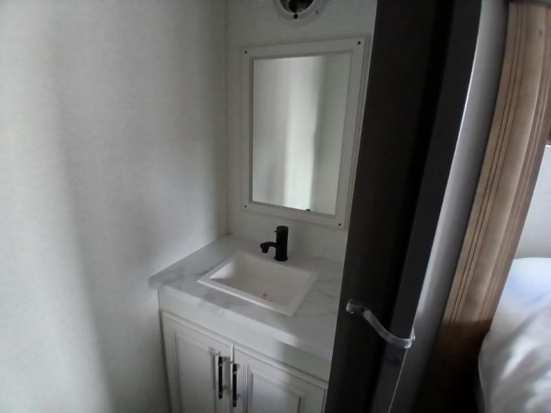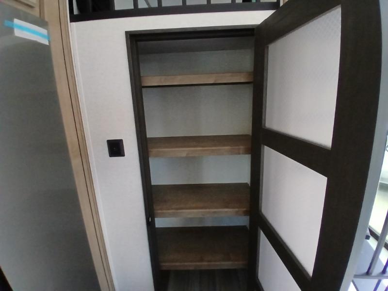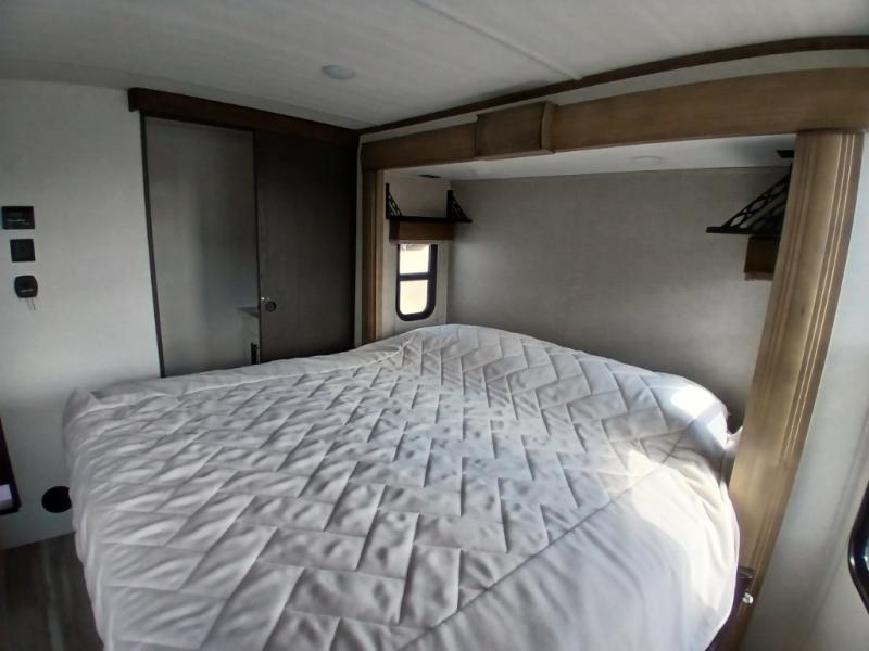 This destination trailer is a home away from home where comfort, relaxation, and entertainment come together in perfect harmony. The rear bathroom is a serene oasis, featuring washer and dryer prep, dual sink, and makeup vanity. Above, the loft area offers a cozy bunk mat, storage shelves, and an entertainment center - perfect for kids or guests. The living area is designed for relaxation and entertainment, featuring a comfortable sectional sofa, entertainment center, and warm fireplace. The kitchen is a gourmet's paradise, boasting a refrigerator, pantry, three-burner cooktop, kitchen island with chairs, and spacious pantry. The front bedroom is a peaceful retreat, complete with a half bath, overhead cabinets, a king bed, a wardrobe, and a dresser. Above, the loft area offers three bunk mats - perfect for kids or guests. Outside, enjoy the shade and protection of our 26' awning and convenient access via two entry/exit doors.